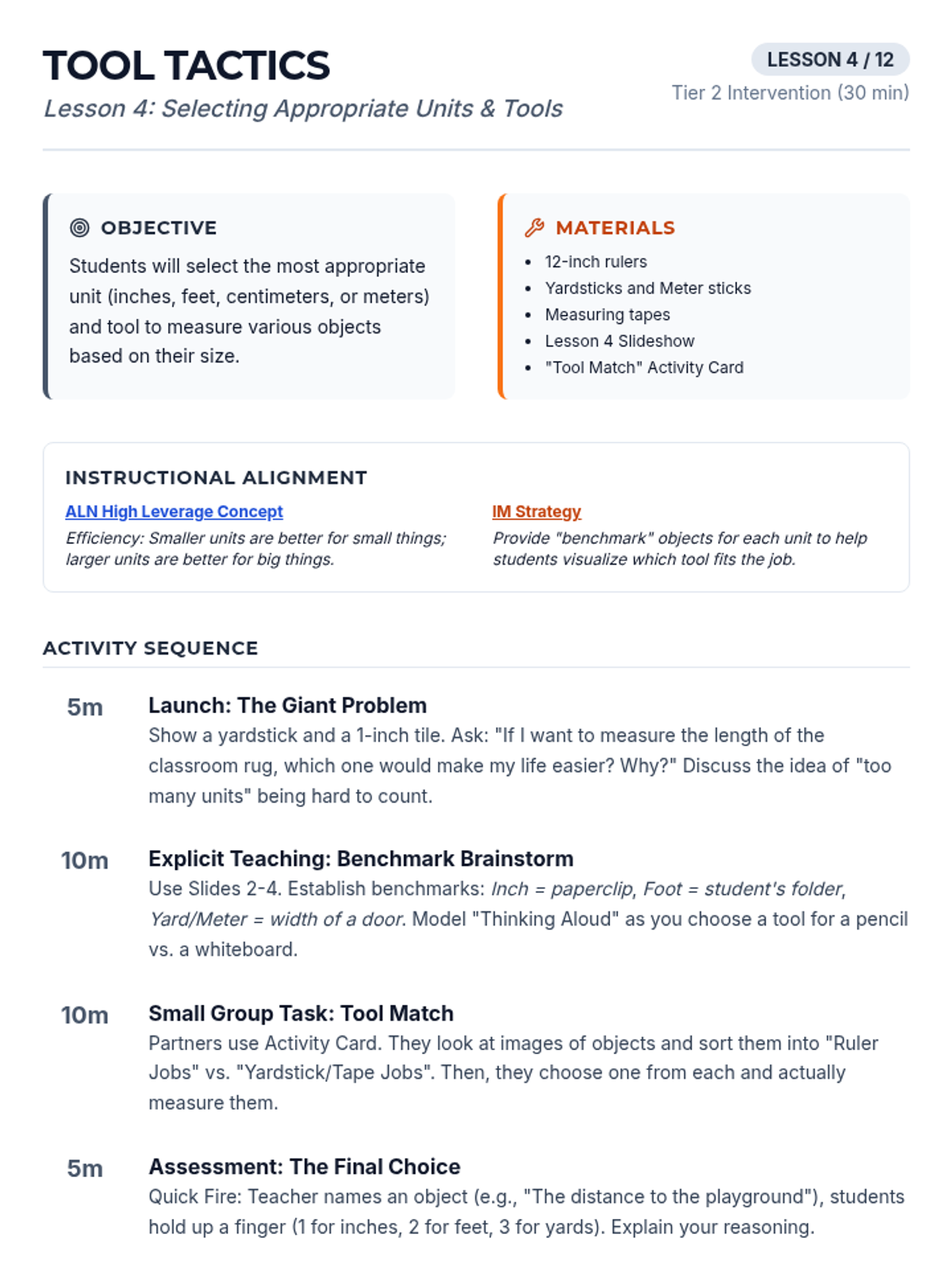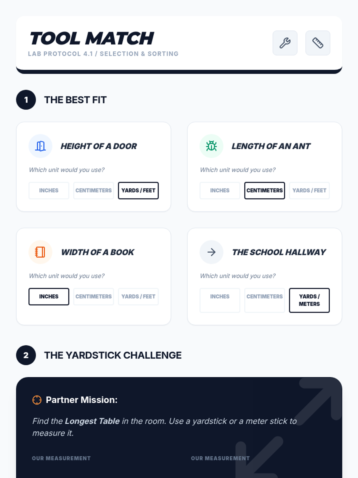 Students determine which standard unit (inches, feet, centimeters, meters) and tool are most appropriate for various measuring tasks.