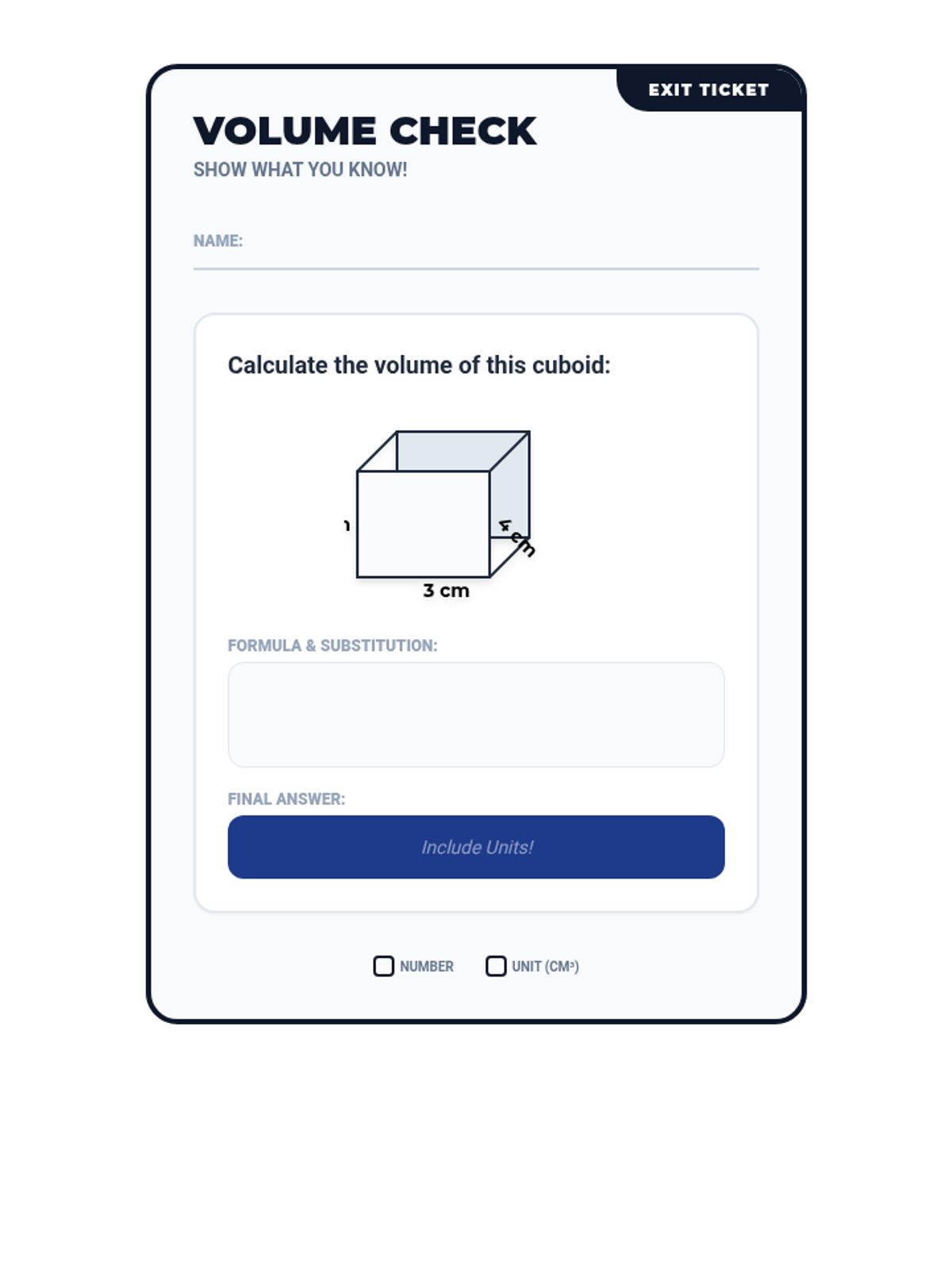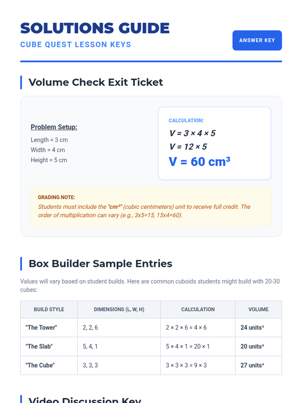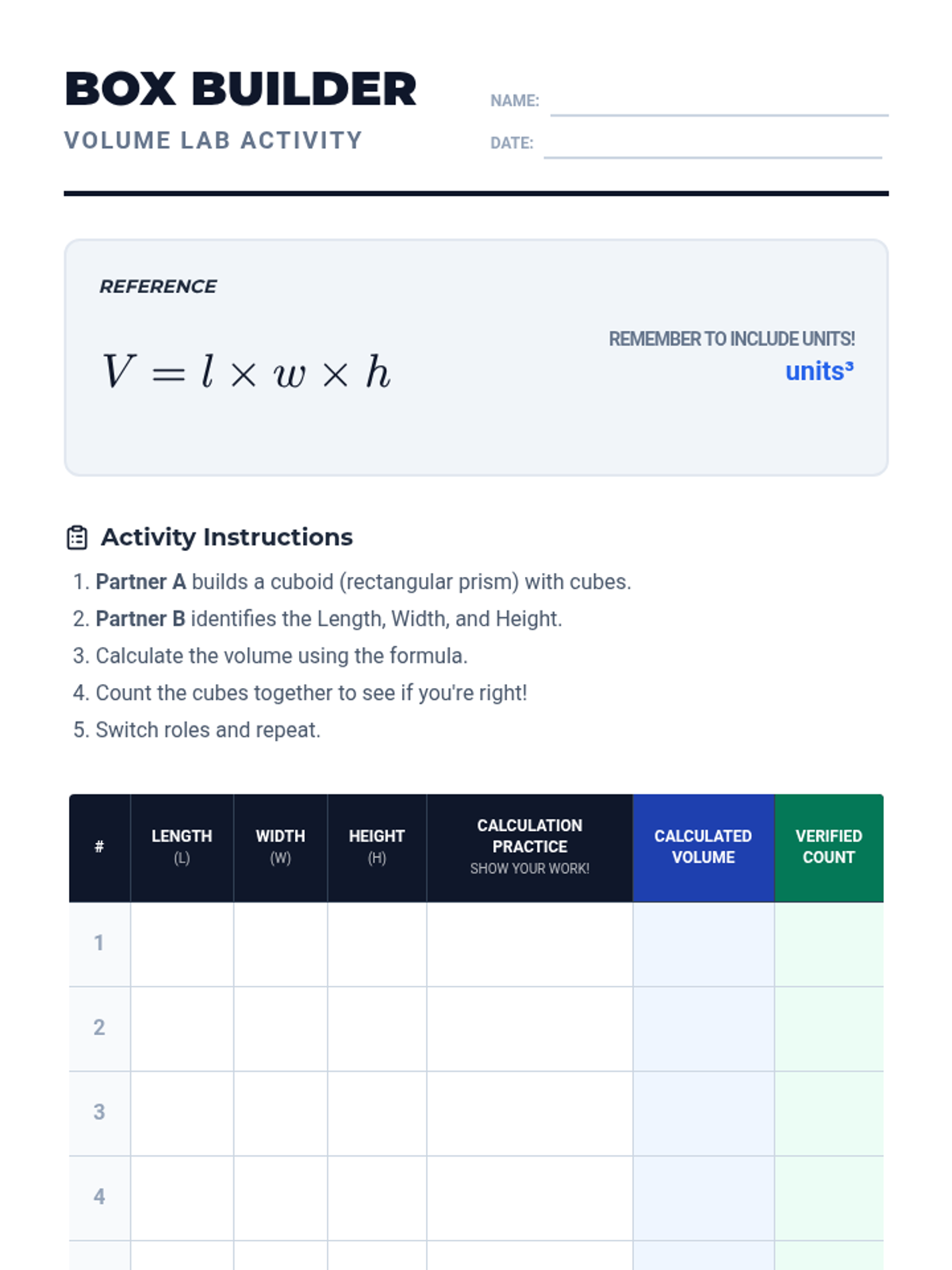 Students will explore the concept of volume by building 3D shapes with unit cubes, using the formula V = l x w x h, and calculating the volume of various cuboids.