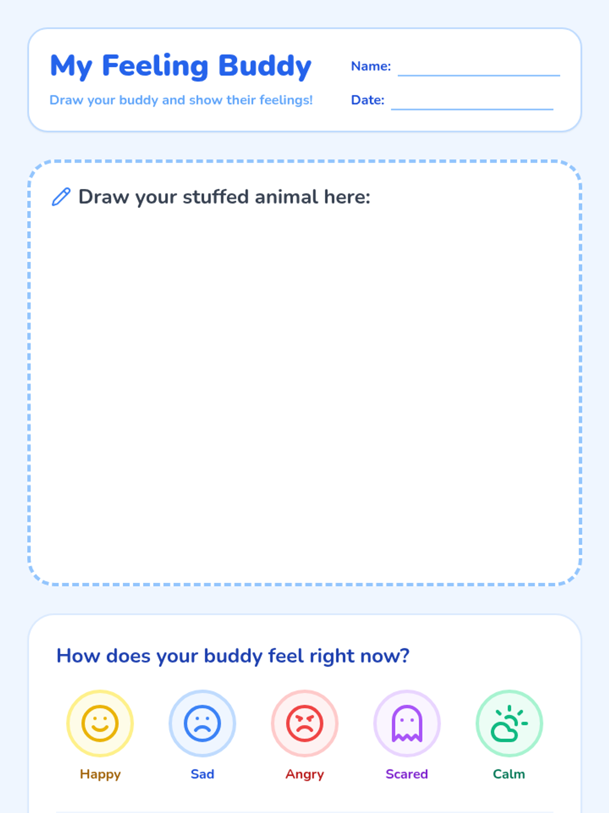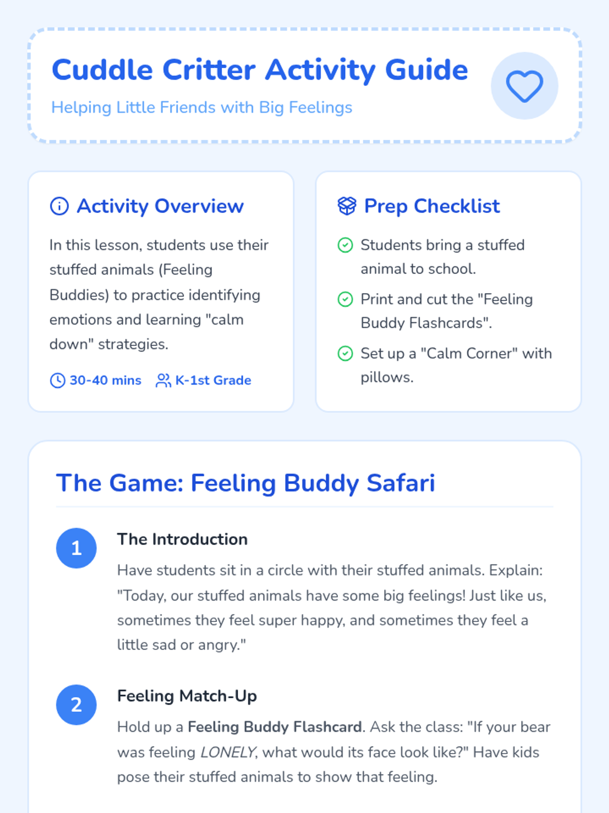 A social-emotional learning lesson for kindergarteners to identify and manage big emotions using their favorite stuffed animals as 'feeling buddies'. Includes a guided classroom game and visual aids to build emotional literacy.