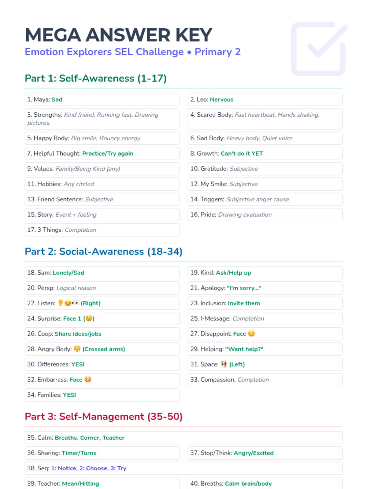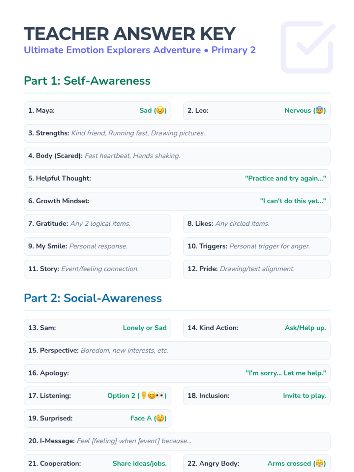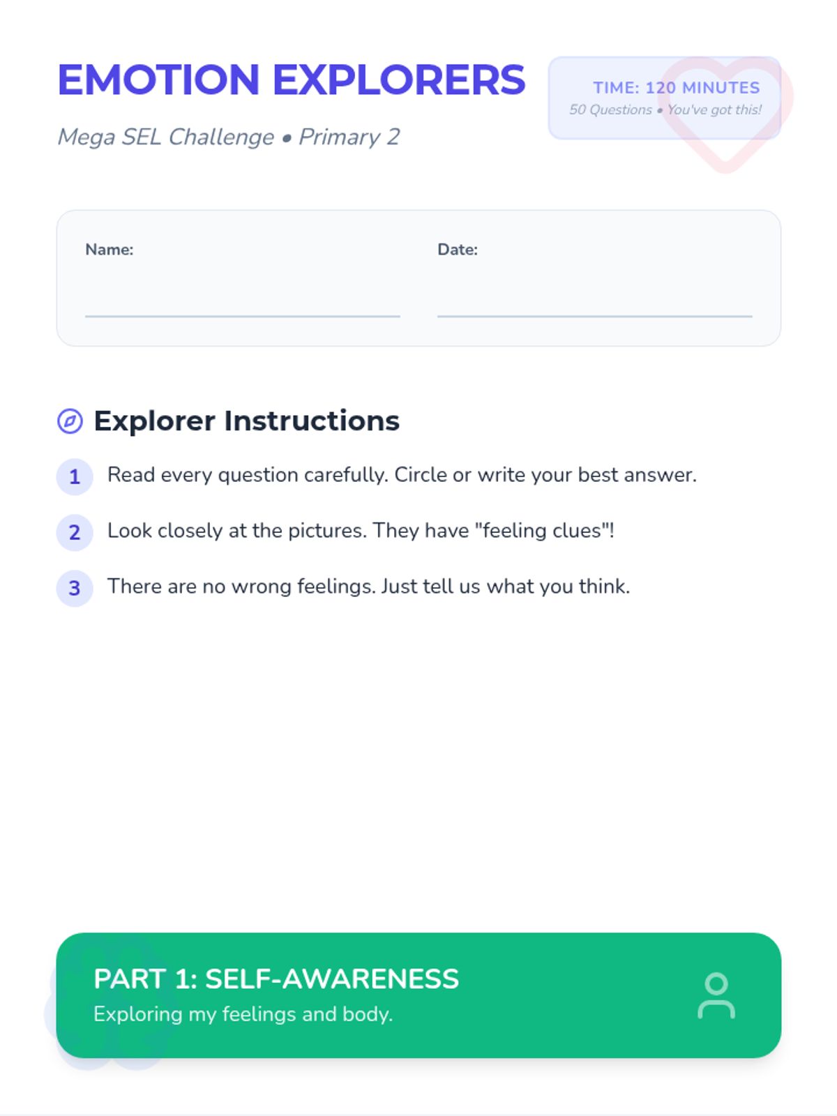 A comprehensive Social-Emotional Learning assessment for Primary 2 students focusing on self-awareness, social-awareness, and self-management through engaging visual scenarios and reflective tasks.