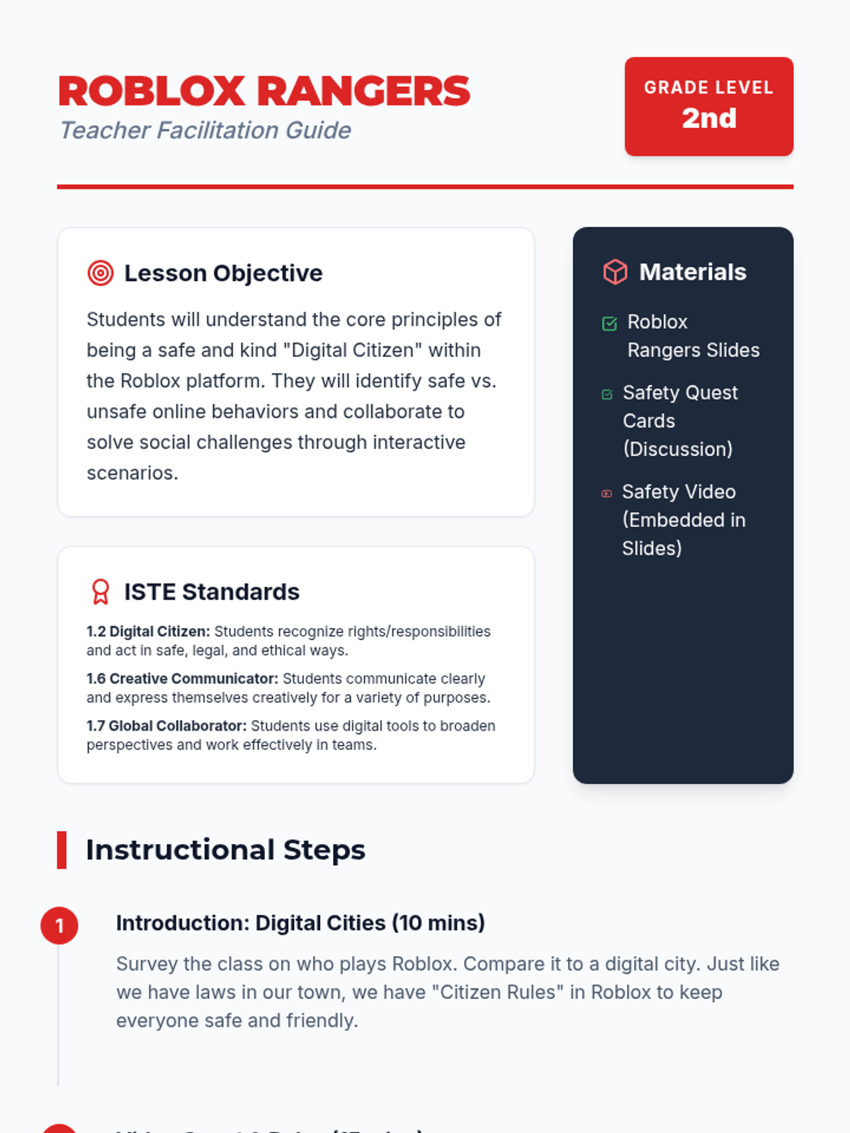 A digital literacy lesson for 2nd graders that uses Roblox to teach digital citizenship, safety, and creative design while meeting ISTE standards.