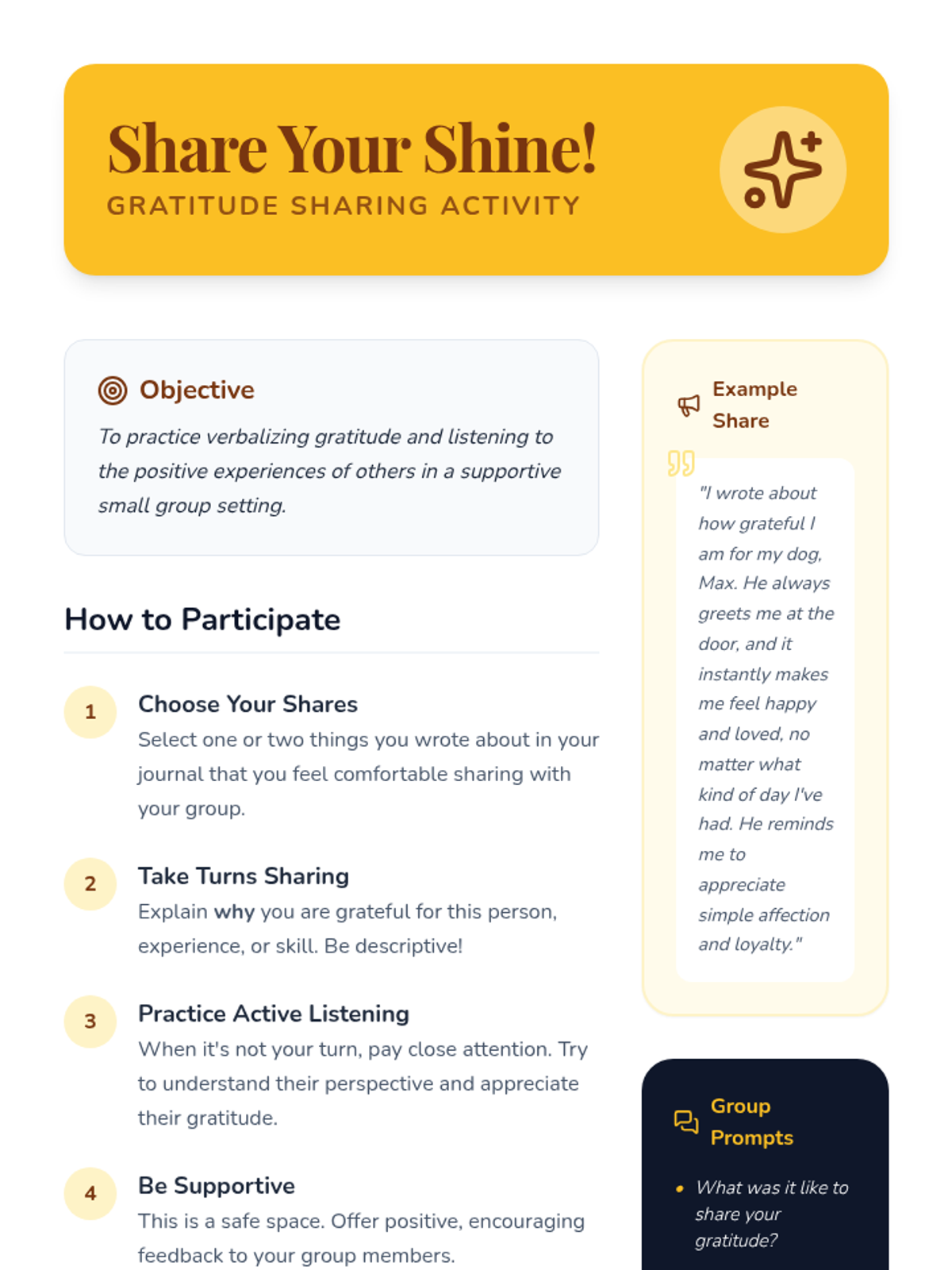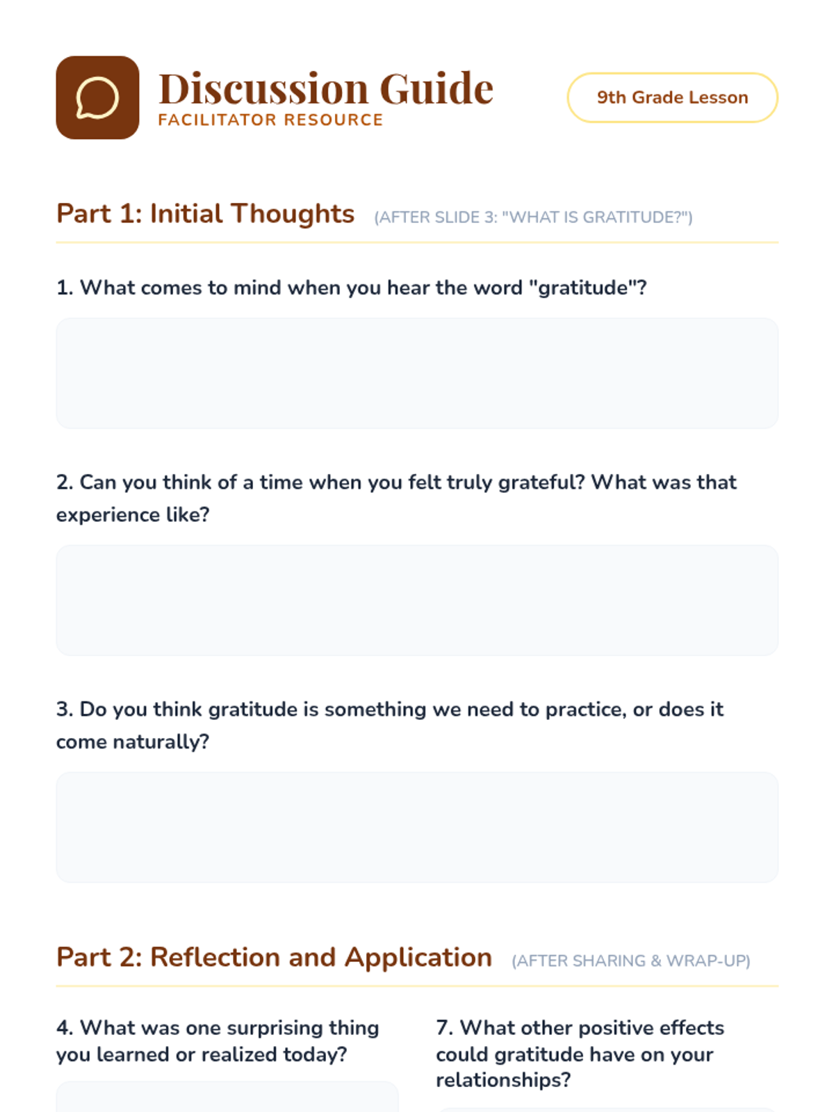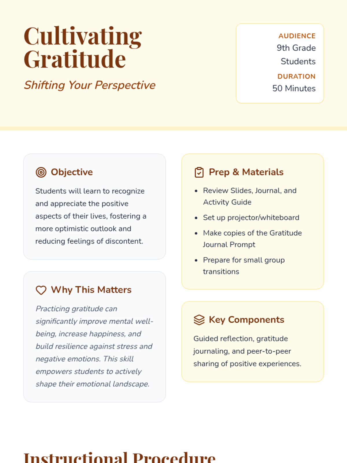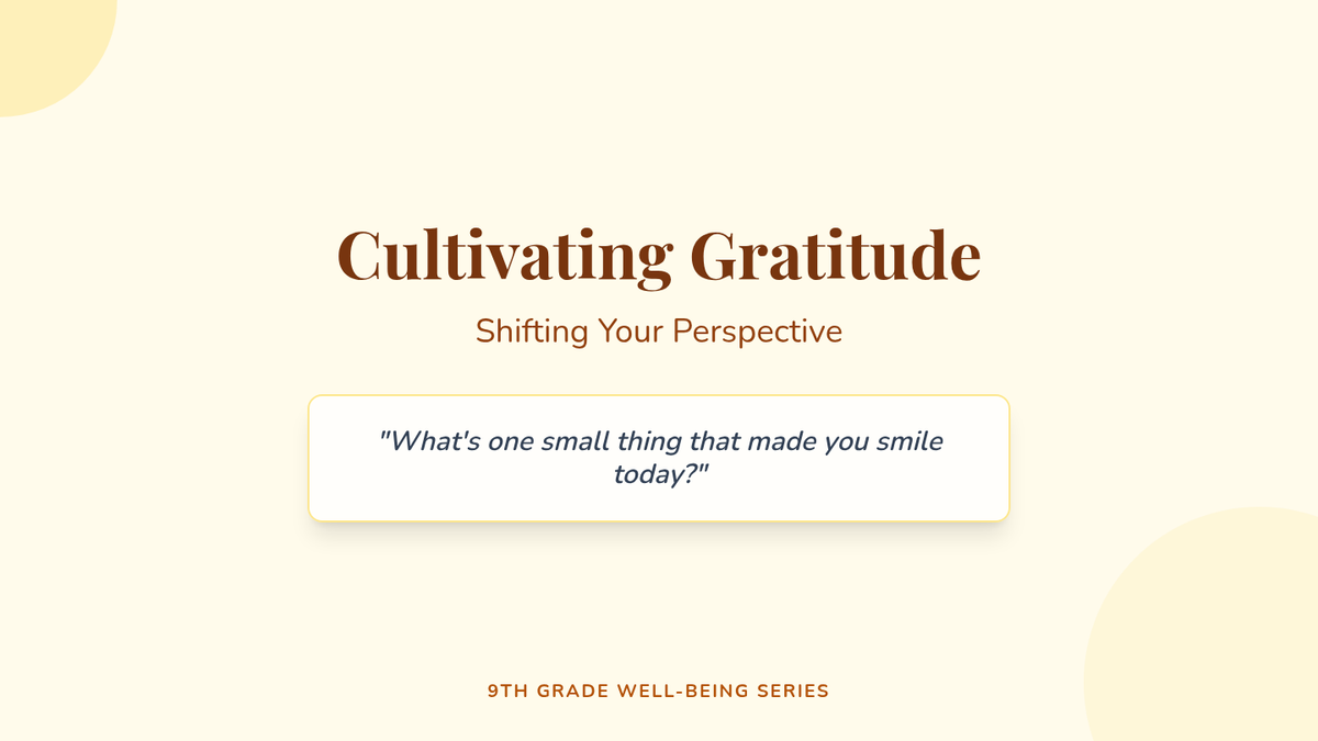 This lesson introduces 9th-grade students to the practice of gratitude as a tool for enhancing positive emotions and overall well-being. Through guided reflection, journaling, and sharing, students will learn to recognize and appreciate the positive aspects of their lives to foster an optimistic outlook.