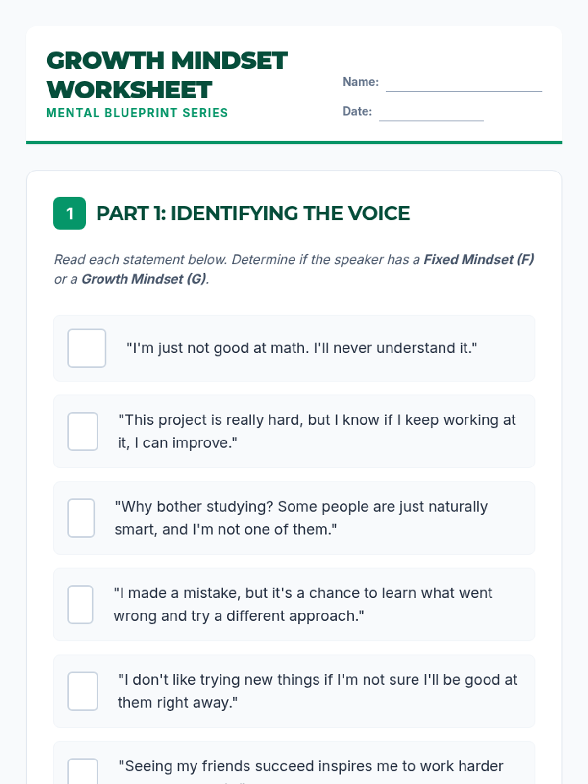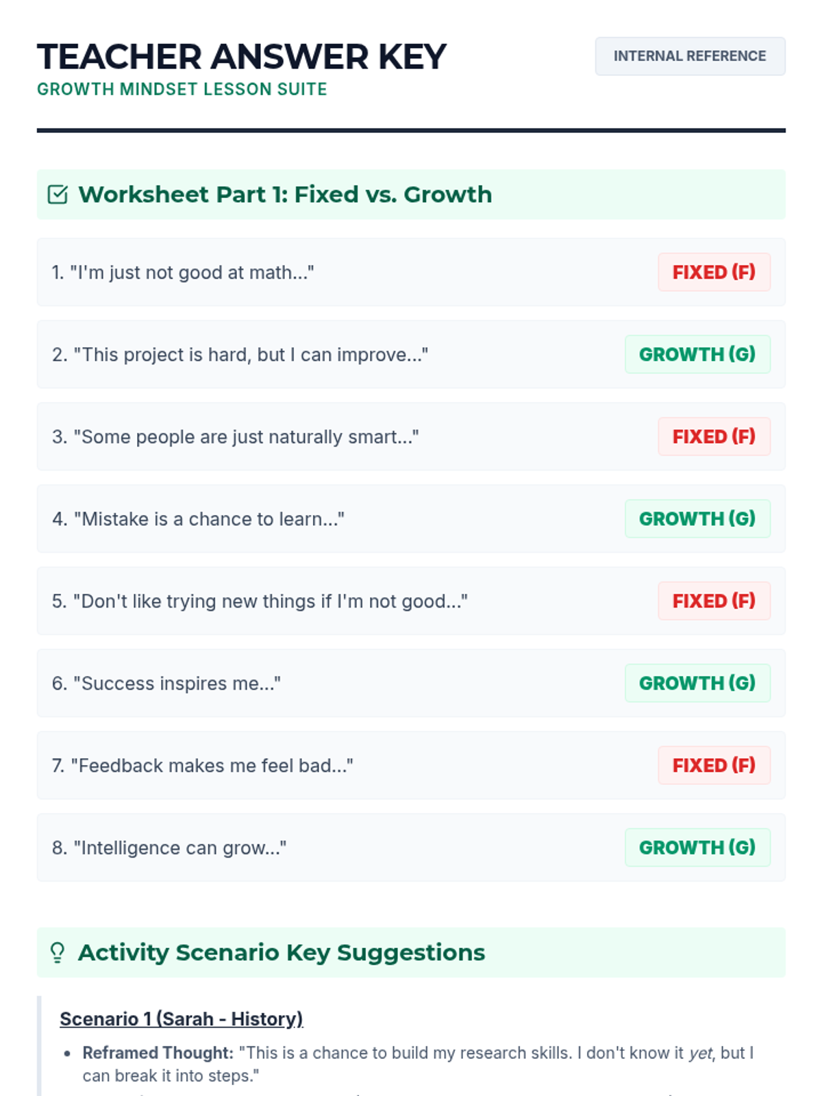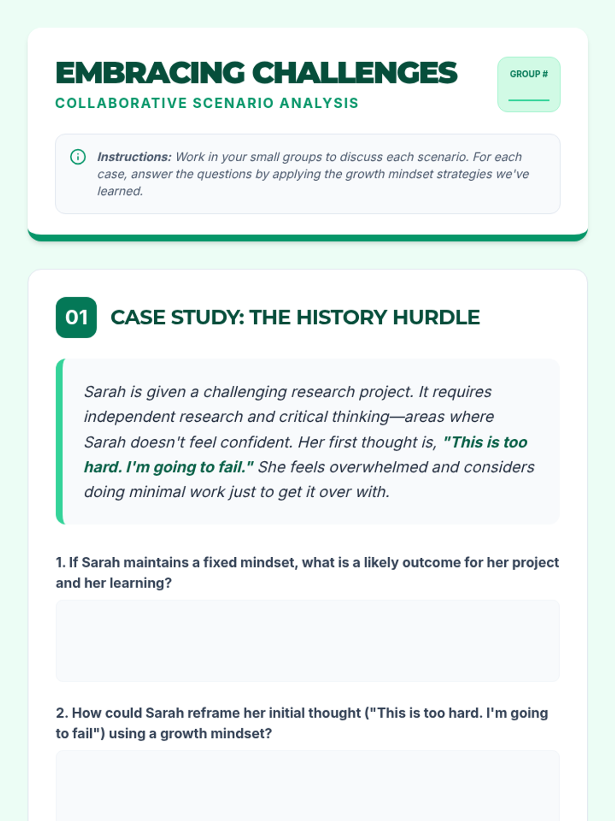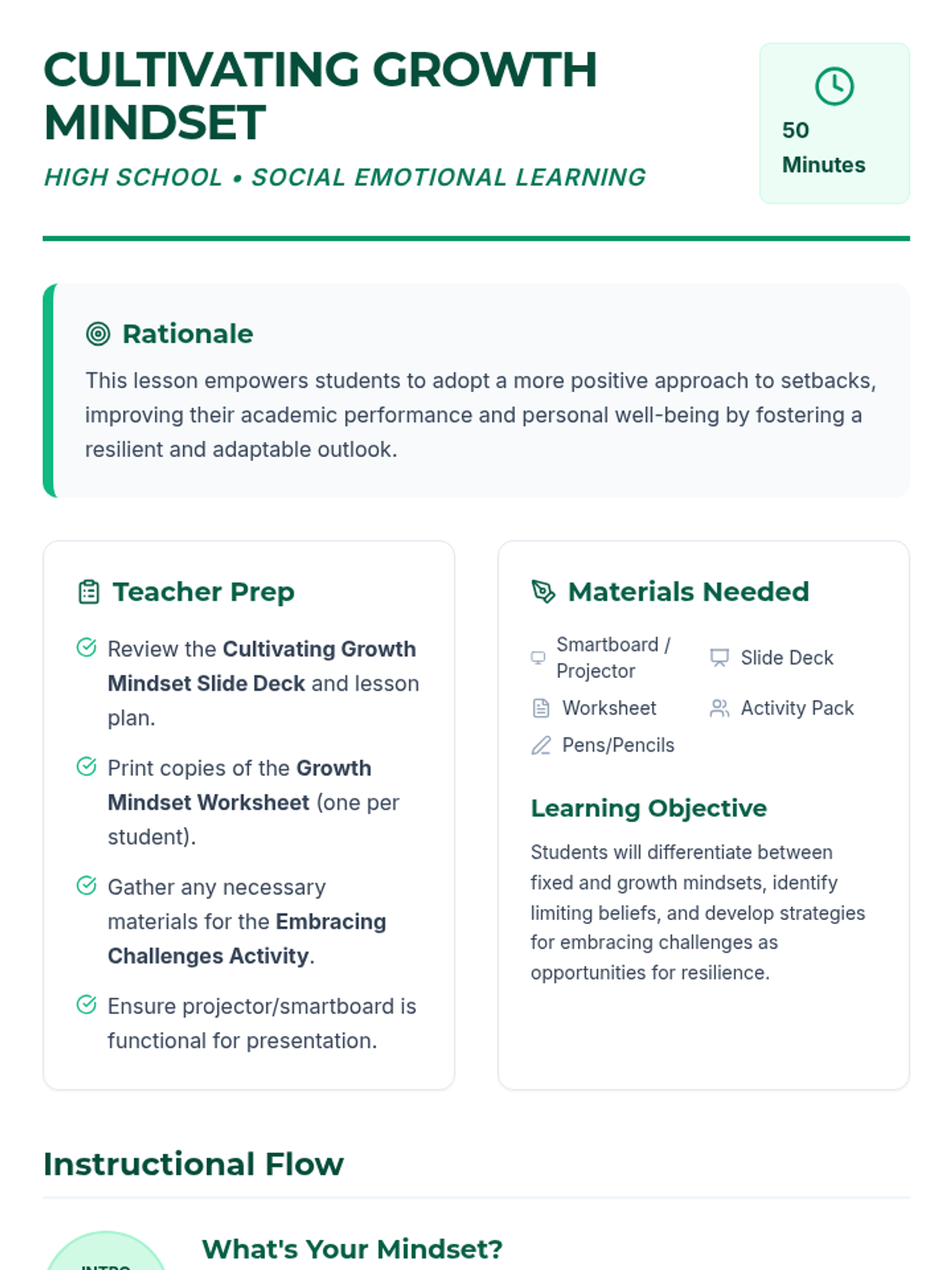This lesson explores the concept of a growth mindset and its transformative power in academic and personal life. Students will learn to differentiate between fixed and growth mindsets, identify limiting beliefs, and develop strategies for embracing challenges as opportunities for learning and resilience, fostering a more positive approach to setbacks. Designed for high schoolers (10th-12th grade) over one 50-minute session.