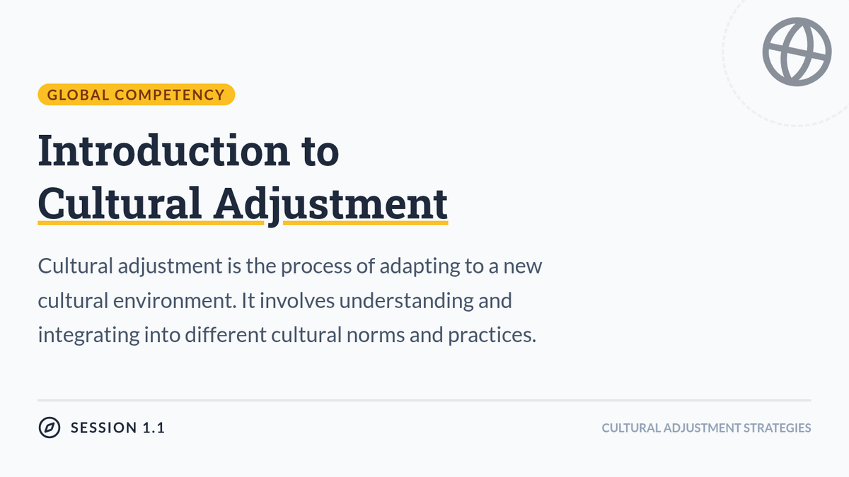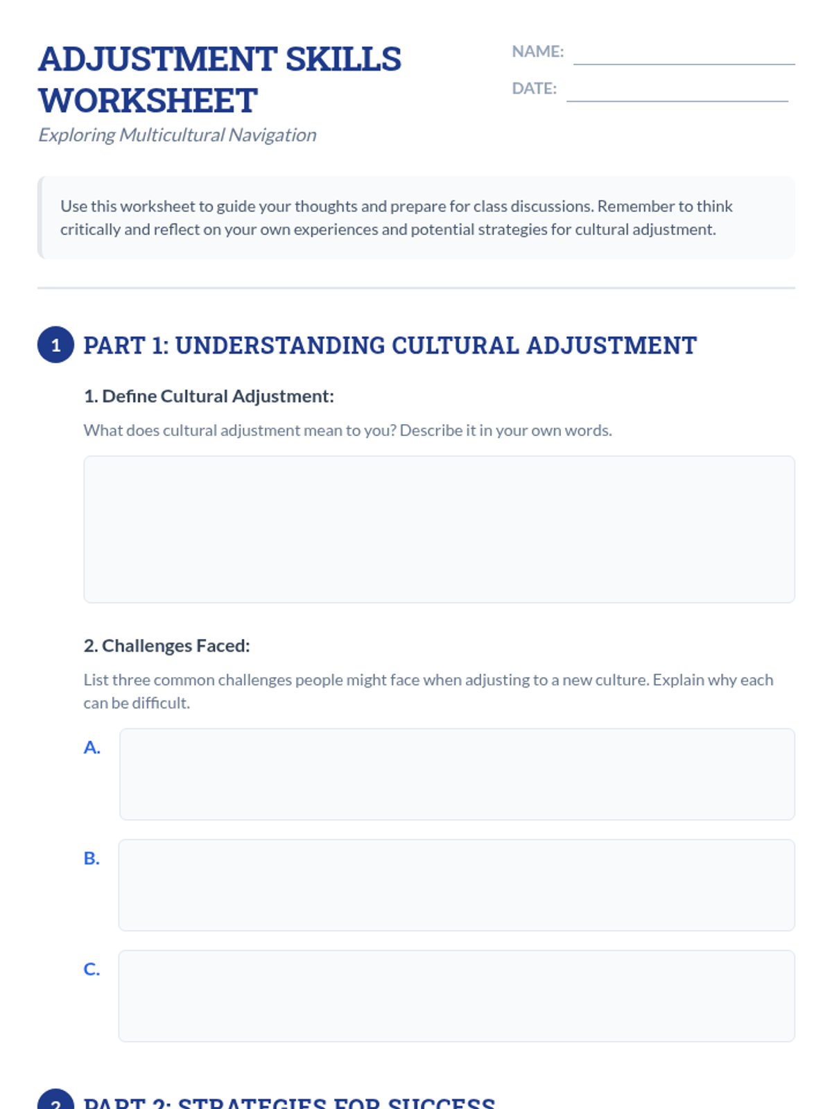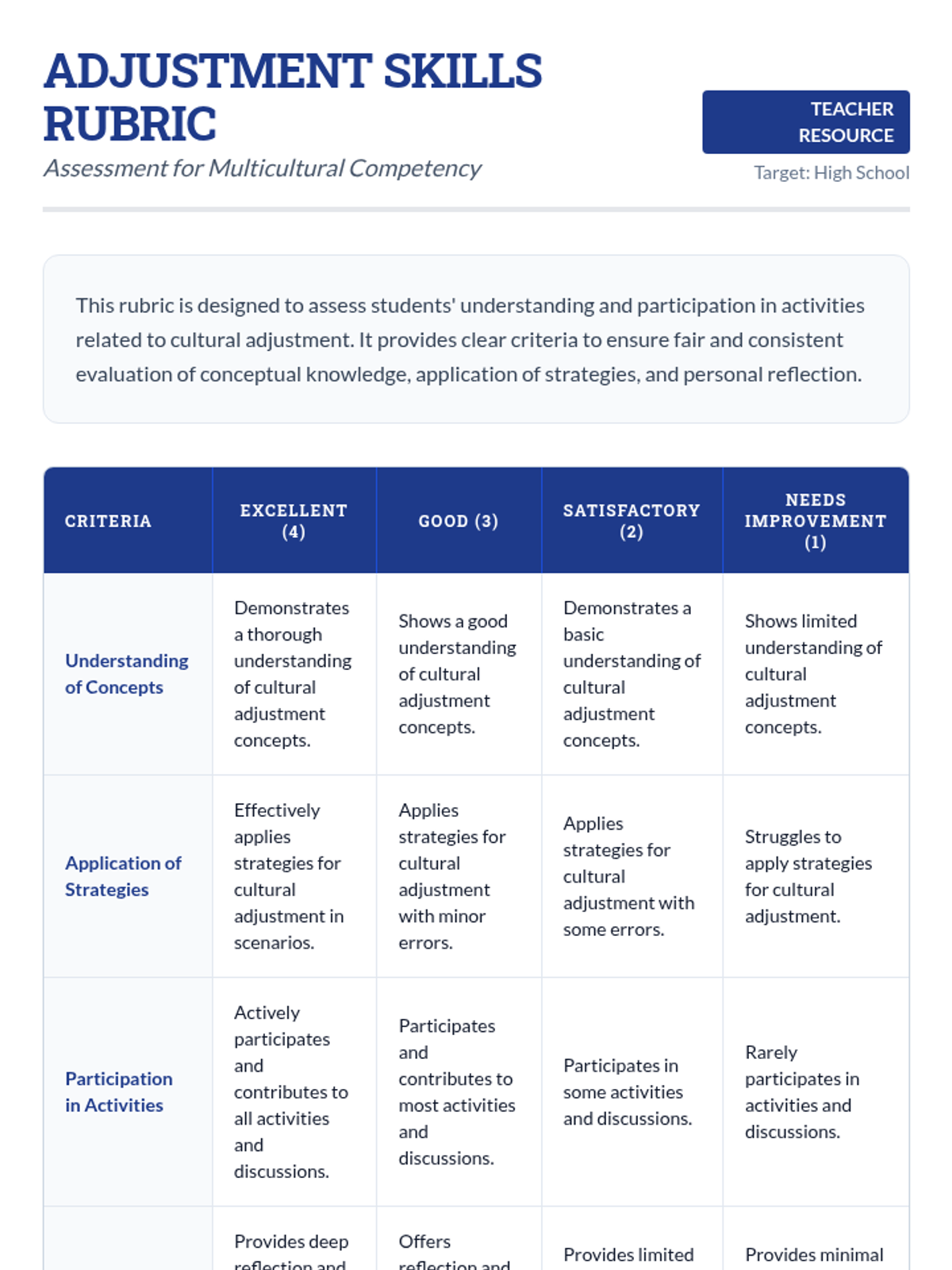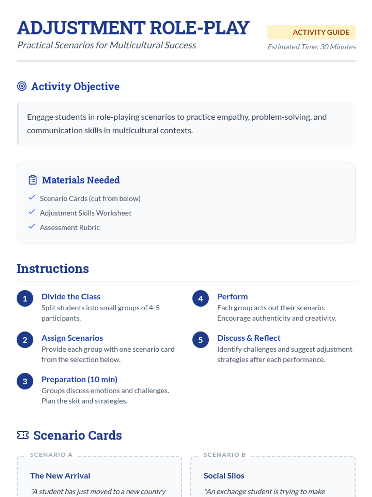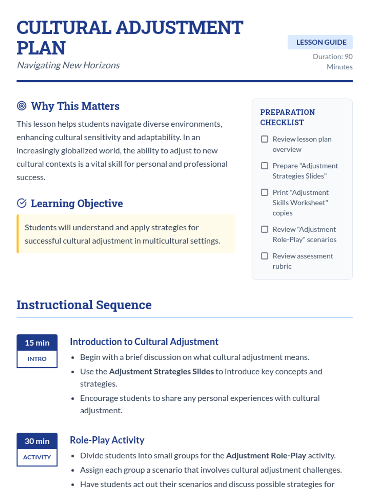 A comprehensive lesson designed for high school students to explore and apply strategies for successful cultural adjustment in diverse settings, utilizing interactive role-plays and reflective activities.