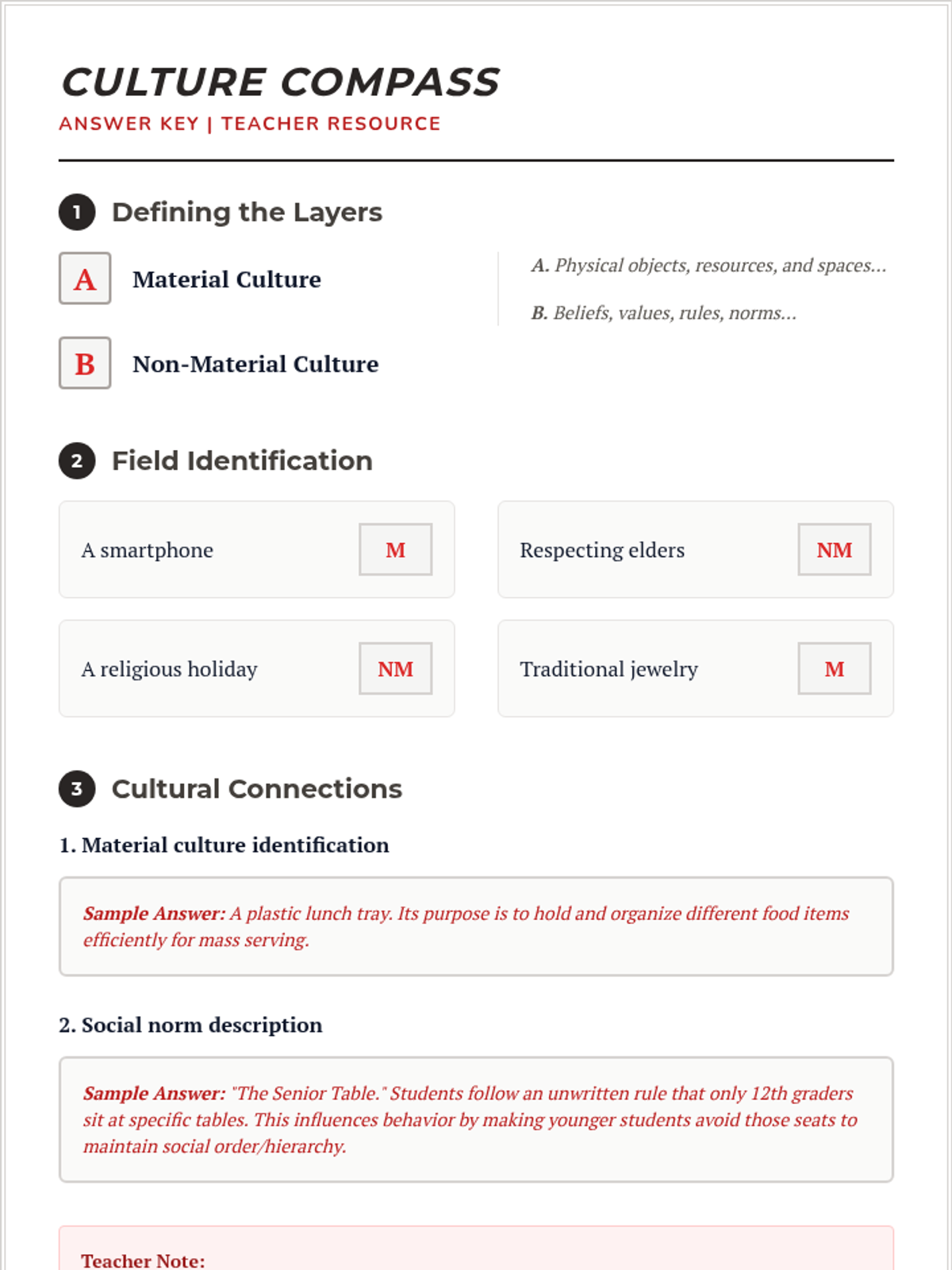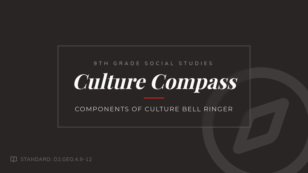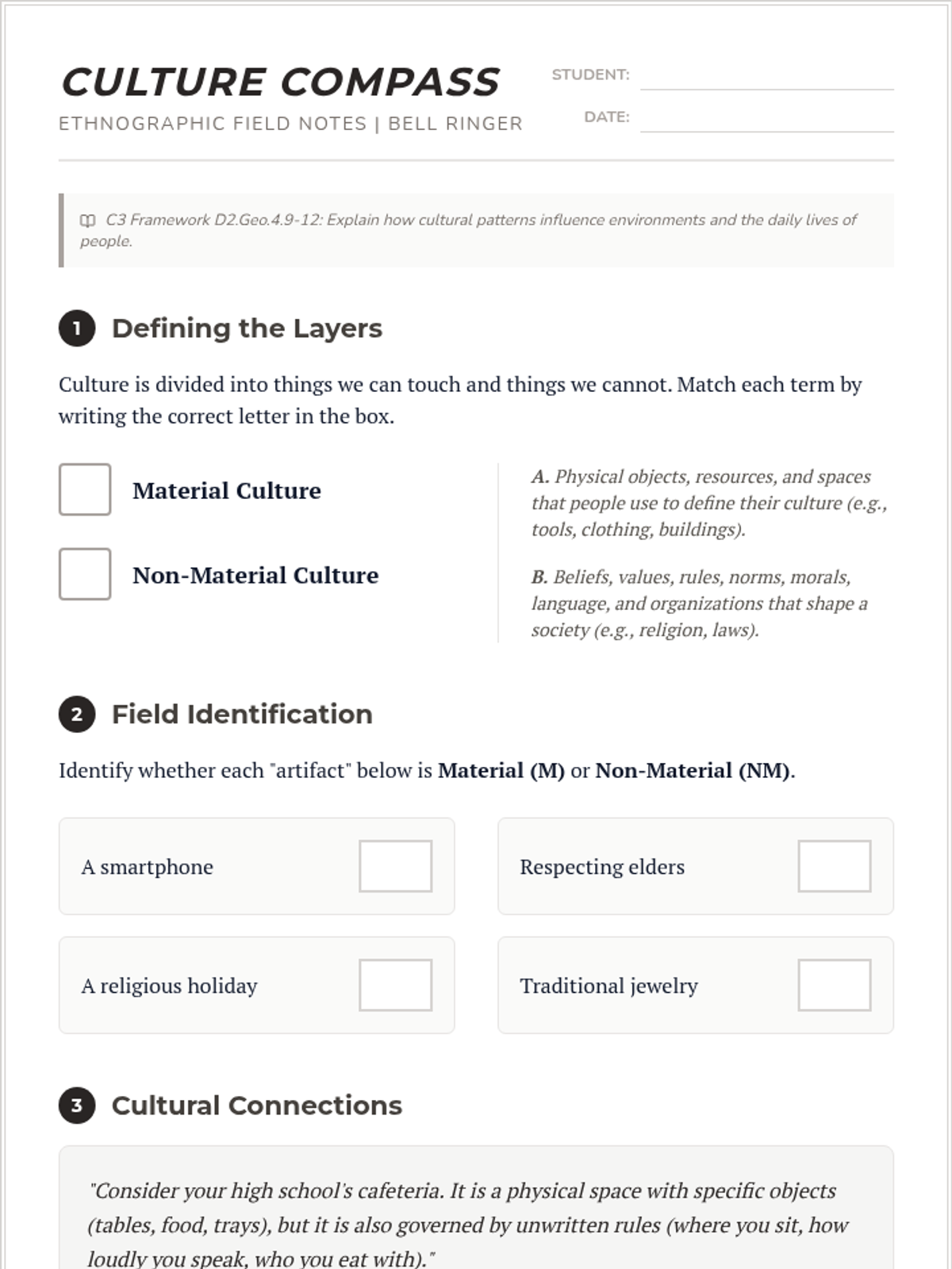 A short introductory bell ringer focused on identifying and analyzing material and non-material components of culture, aligned with C3 Framework geography standards.