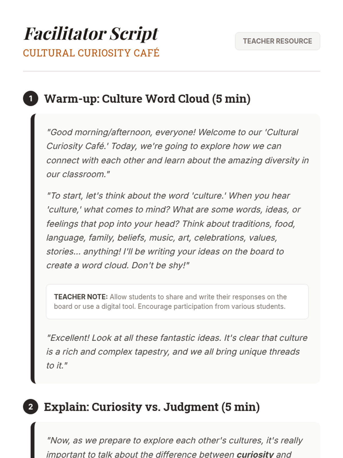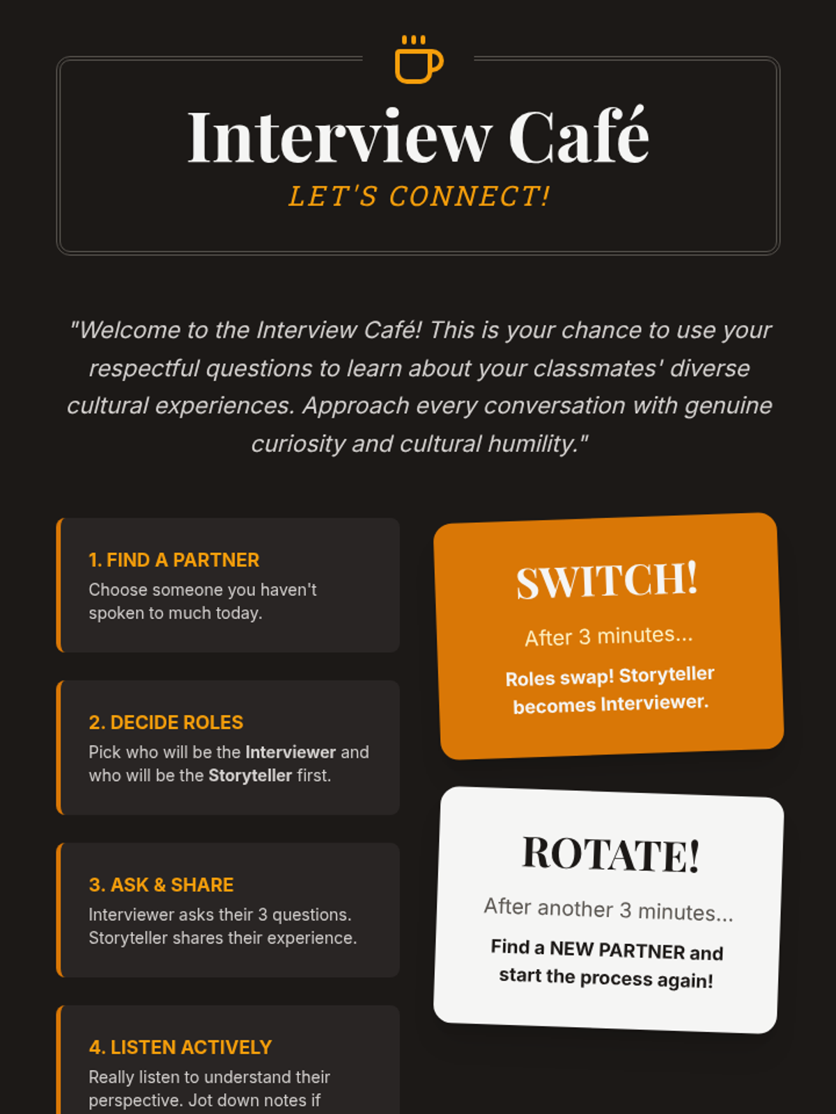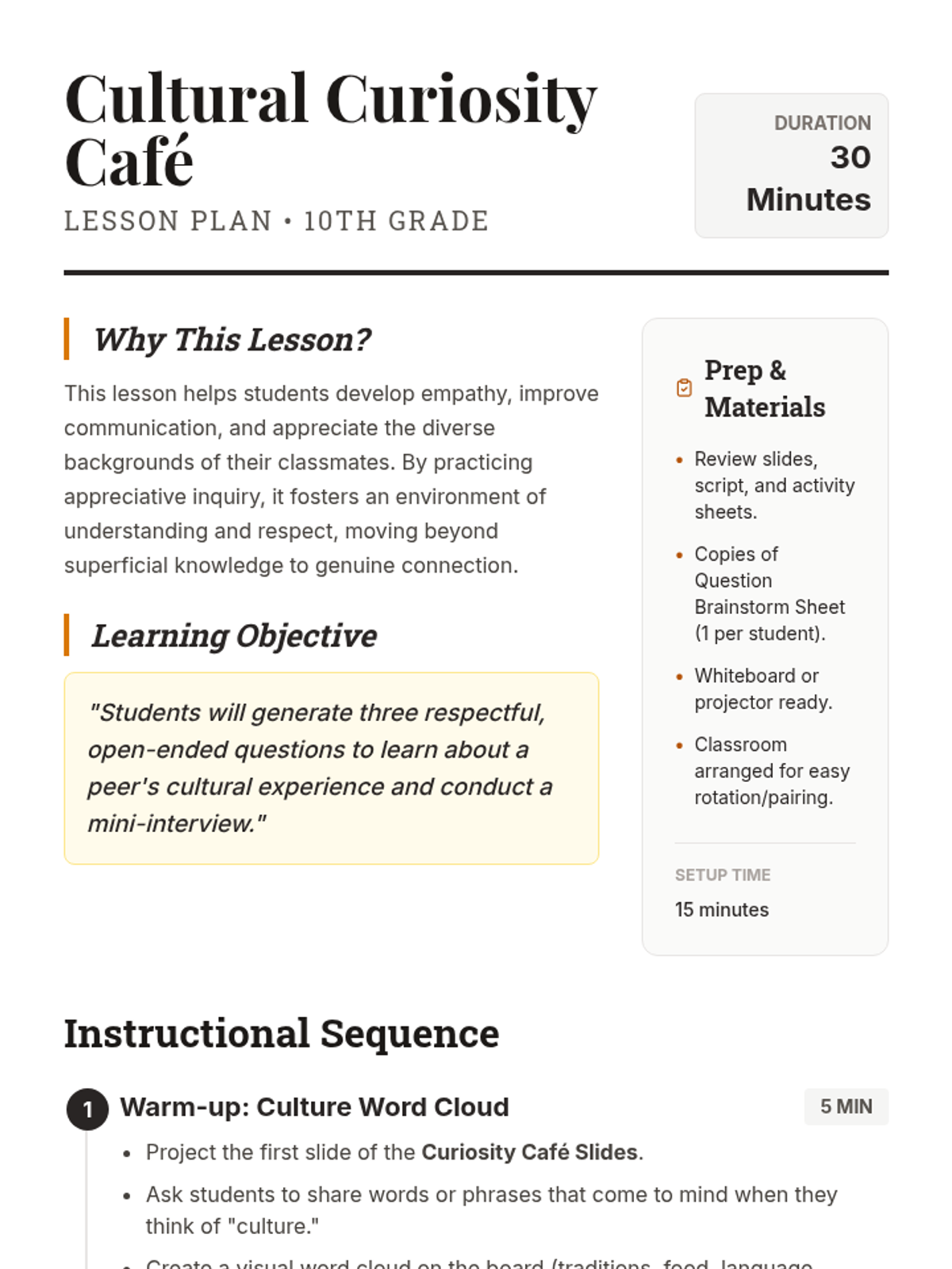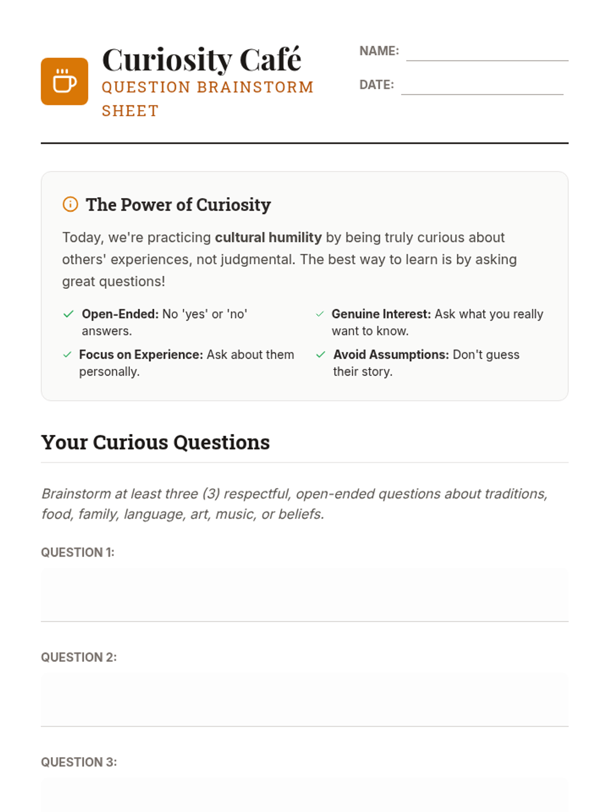 A 30-minute lesson for 10th graders to develop cultural humility and questioning skills through structured brainstorming and mini-interviews. Students learn to differentiate curiosity from judgment while engaging in appreciative inquiry about their peers' cultural backgrounds.