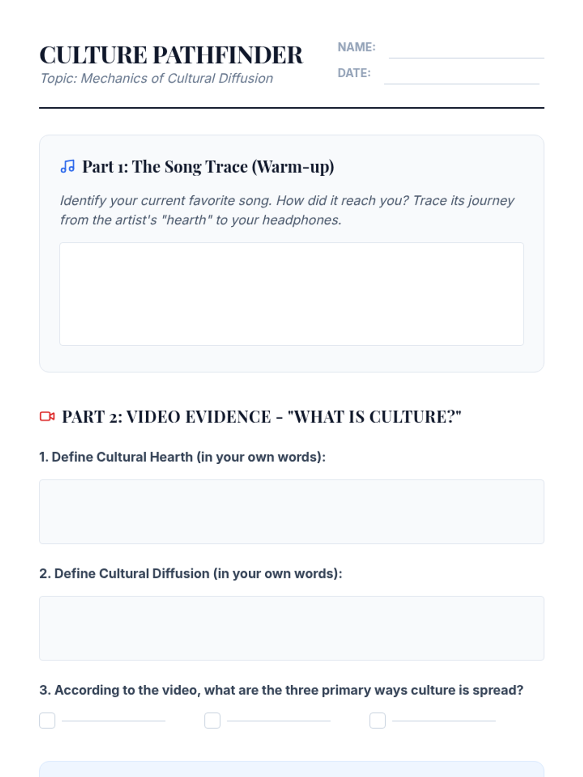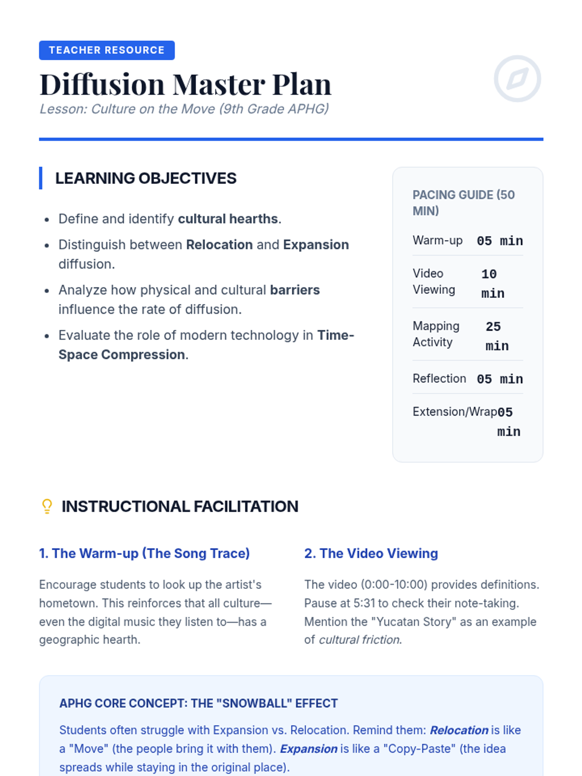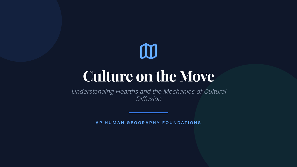 A foundational lesson for 9th-grade Human Geography focusing on cultural hearths and the mechanics of diffusion, using case studies like noodles, Buddhism, and soccer.