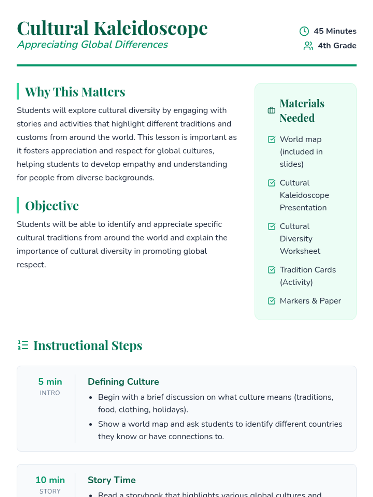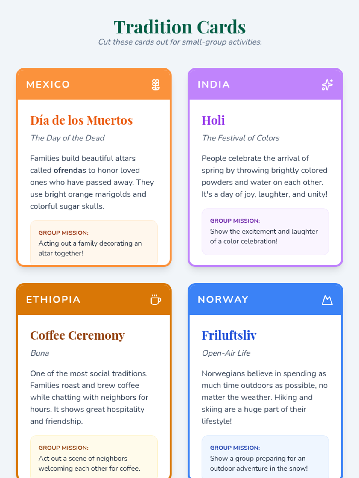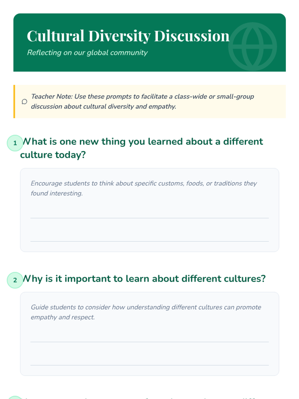 Students explore cultural diversity by engaging with stories and activities that highlight different traditions and customs from around the world, fostering empathy and global citizenship.