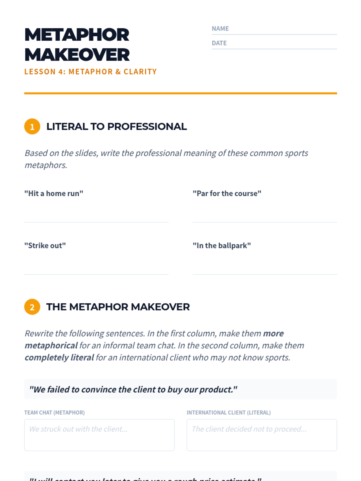 Students analyze culturally specific metaphors, particularly sports-based business English, and practice switching between metaphorical and literal language.