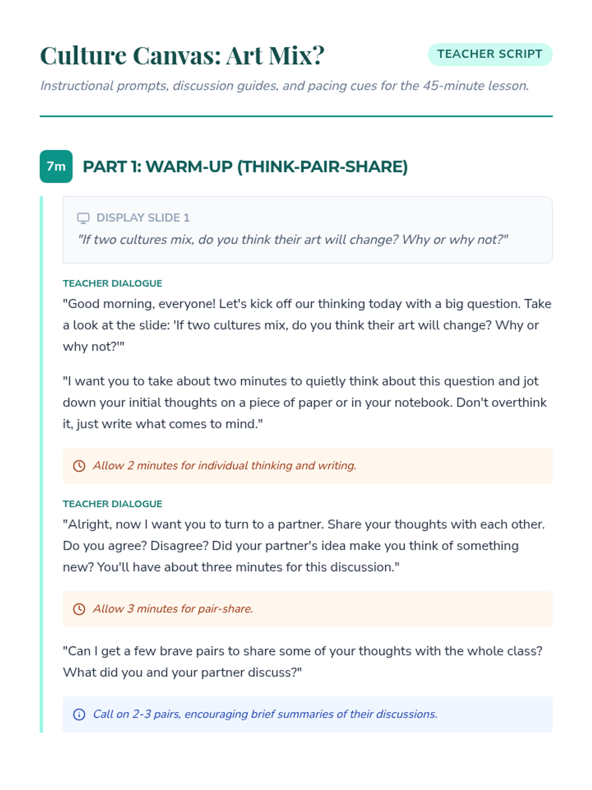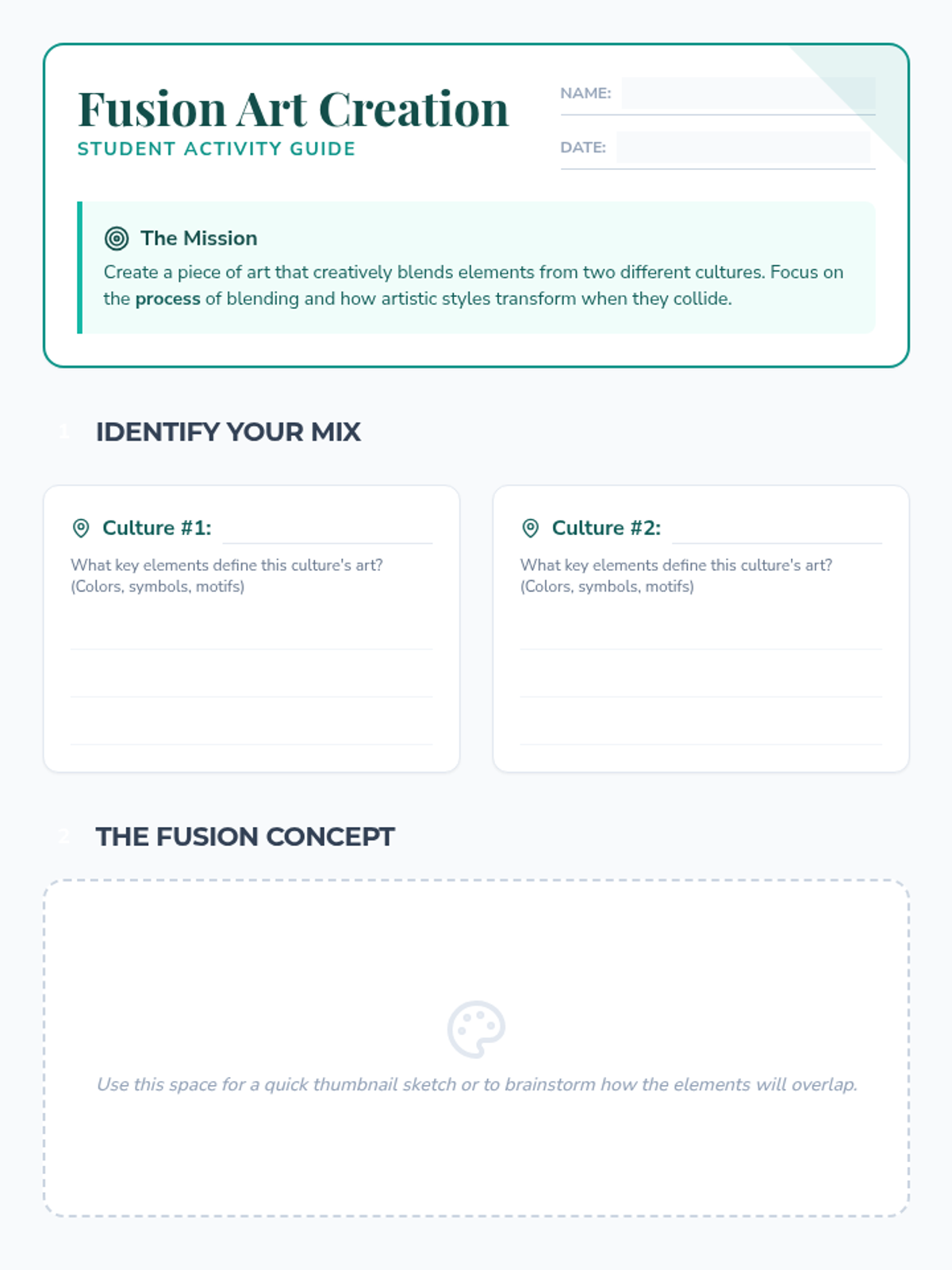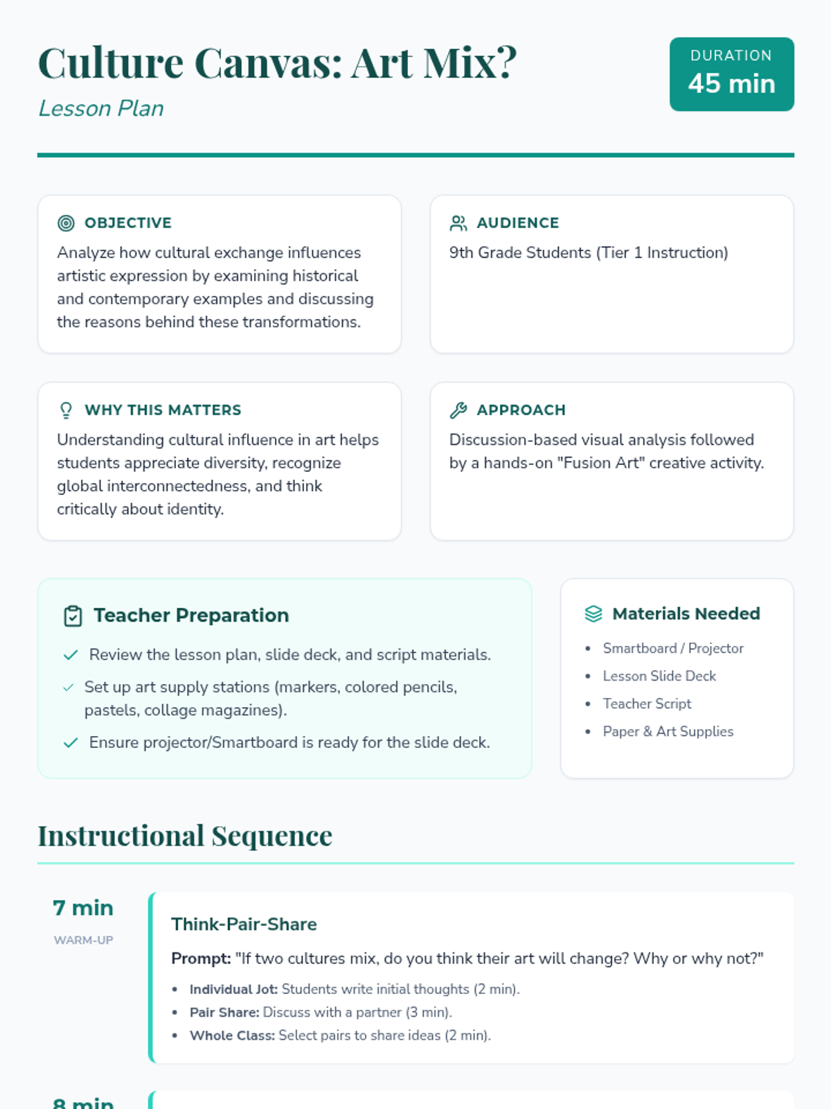A 45-minute art and culture lesson for 9th graders exploring how cultural exchange transforms artistic expression through visual analysis and a creative 'fusion' activity.