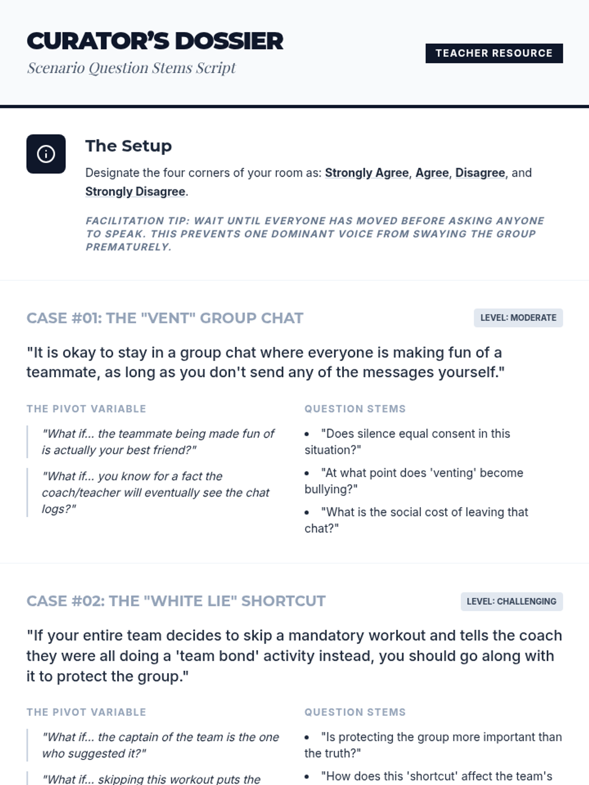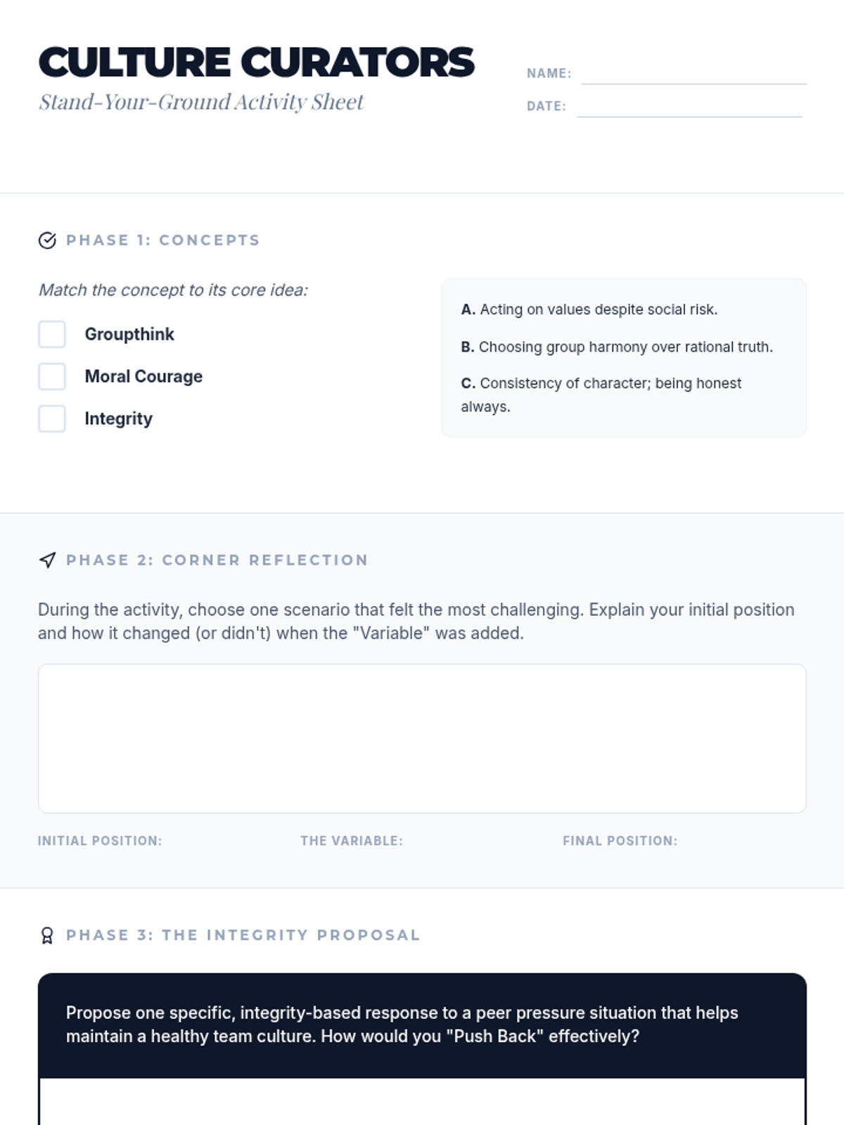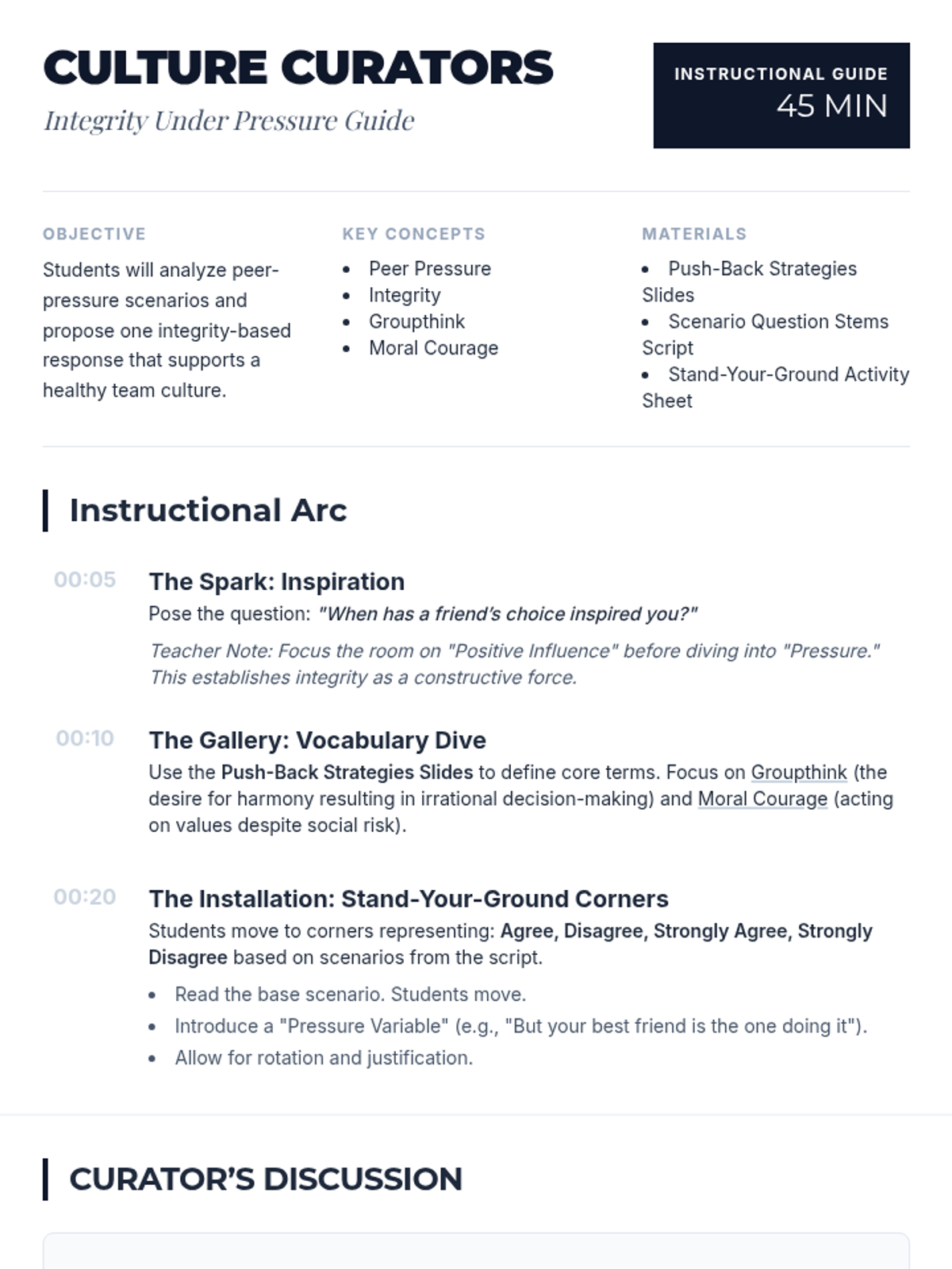 Students act as 'Culture Curators' to analyze peer pressure and groupthink. Through a movement-based activity and strategic discussion, they develop integrity-based responses to preserve a healthy team environment.