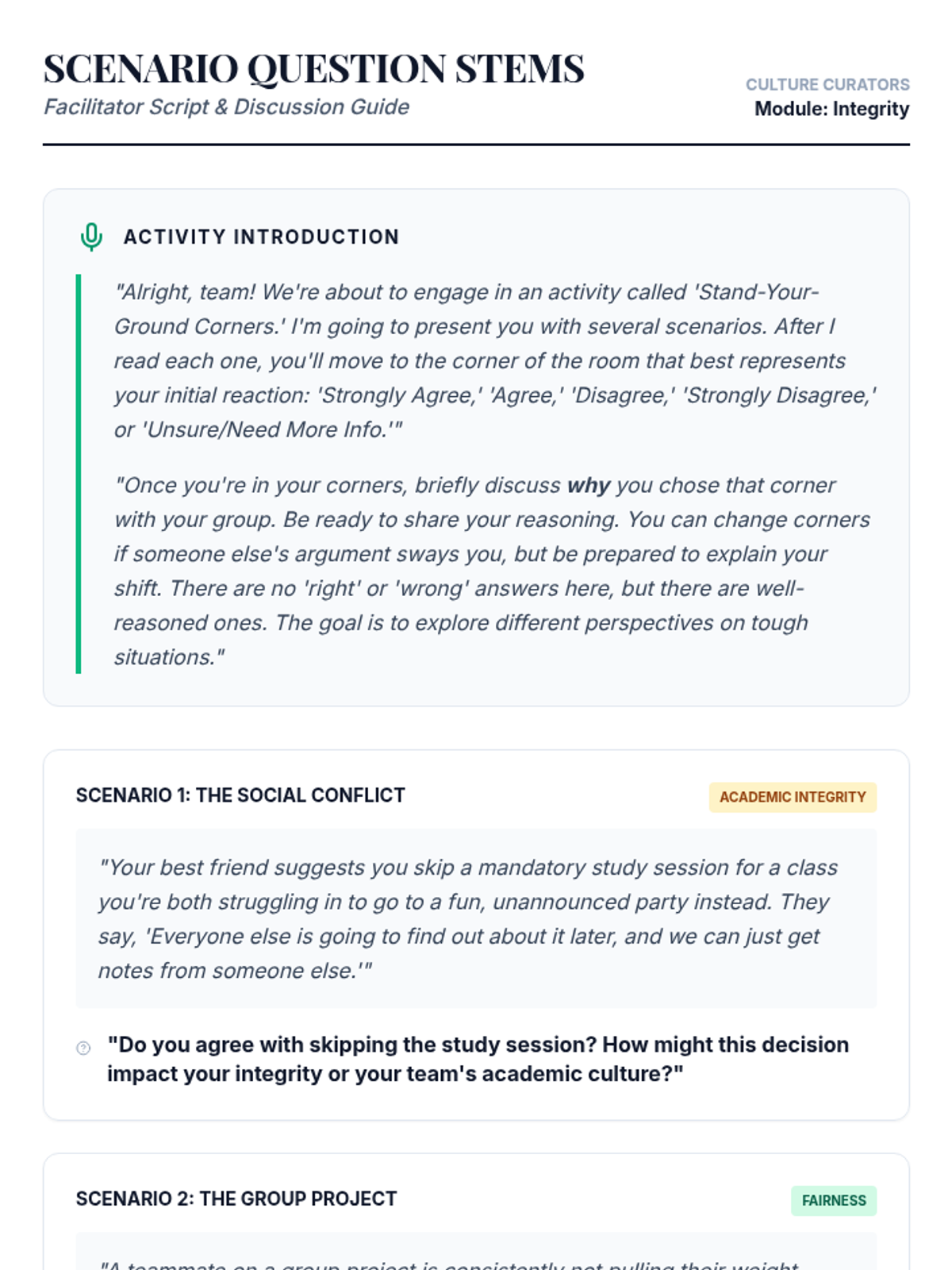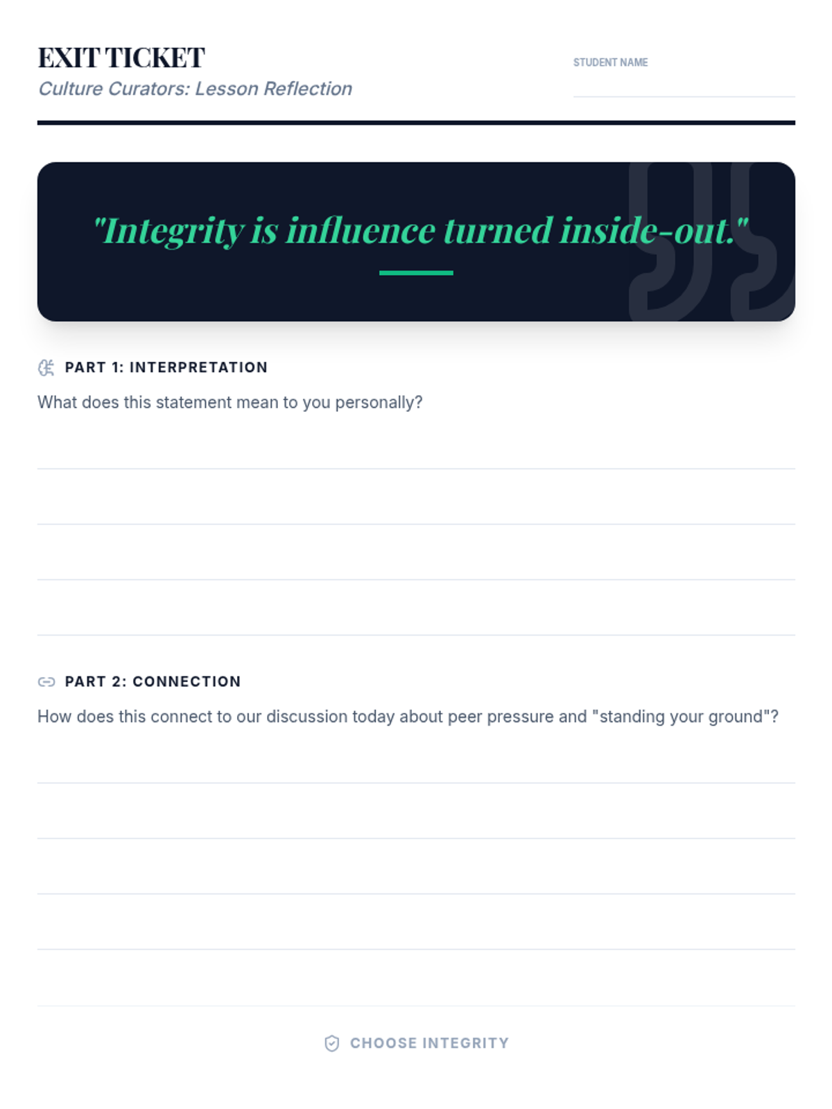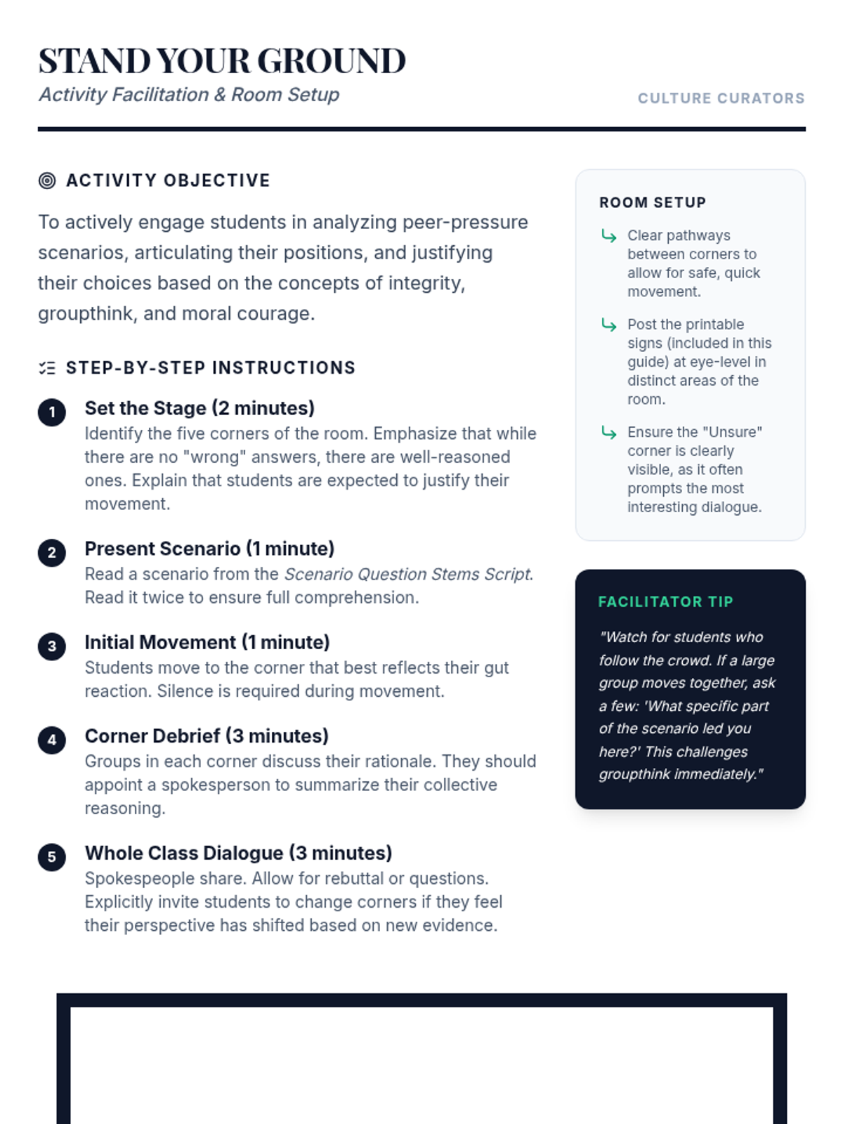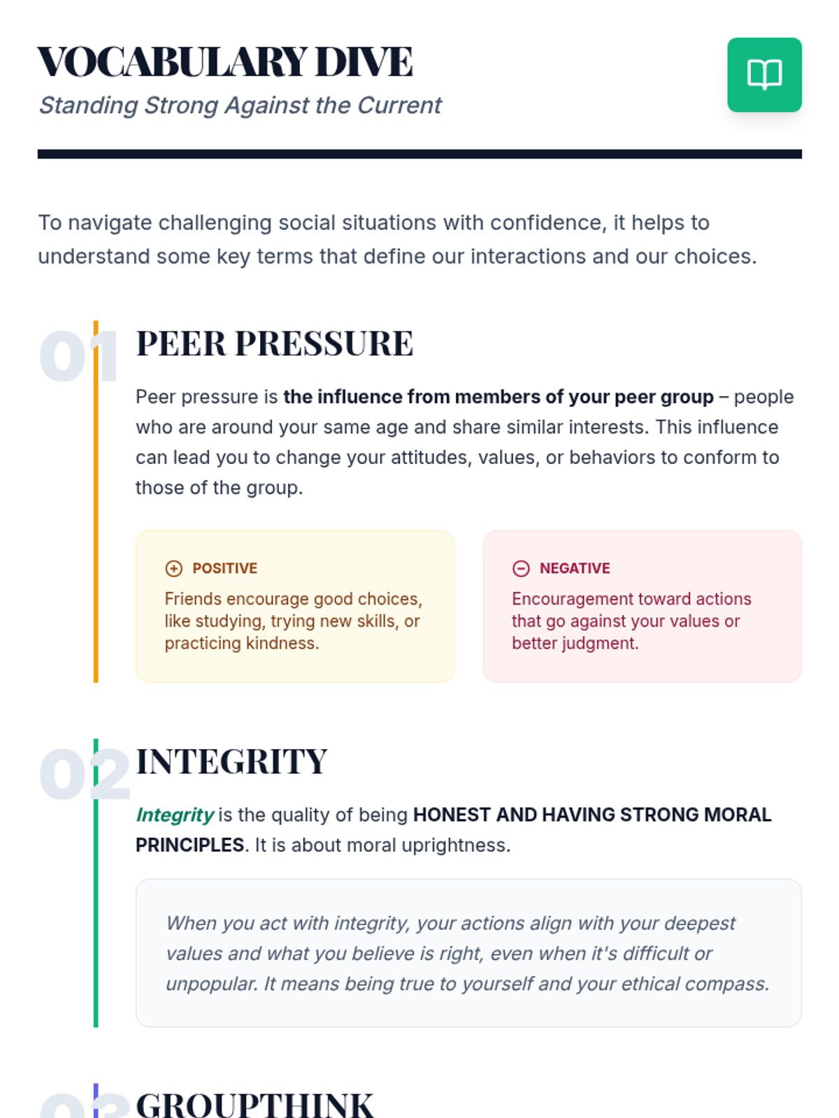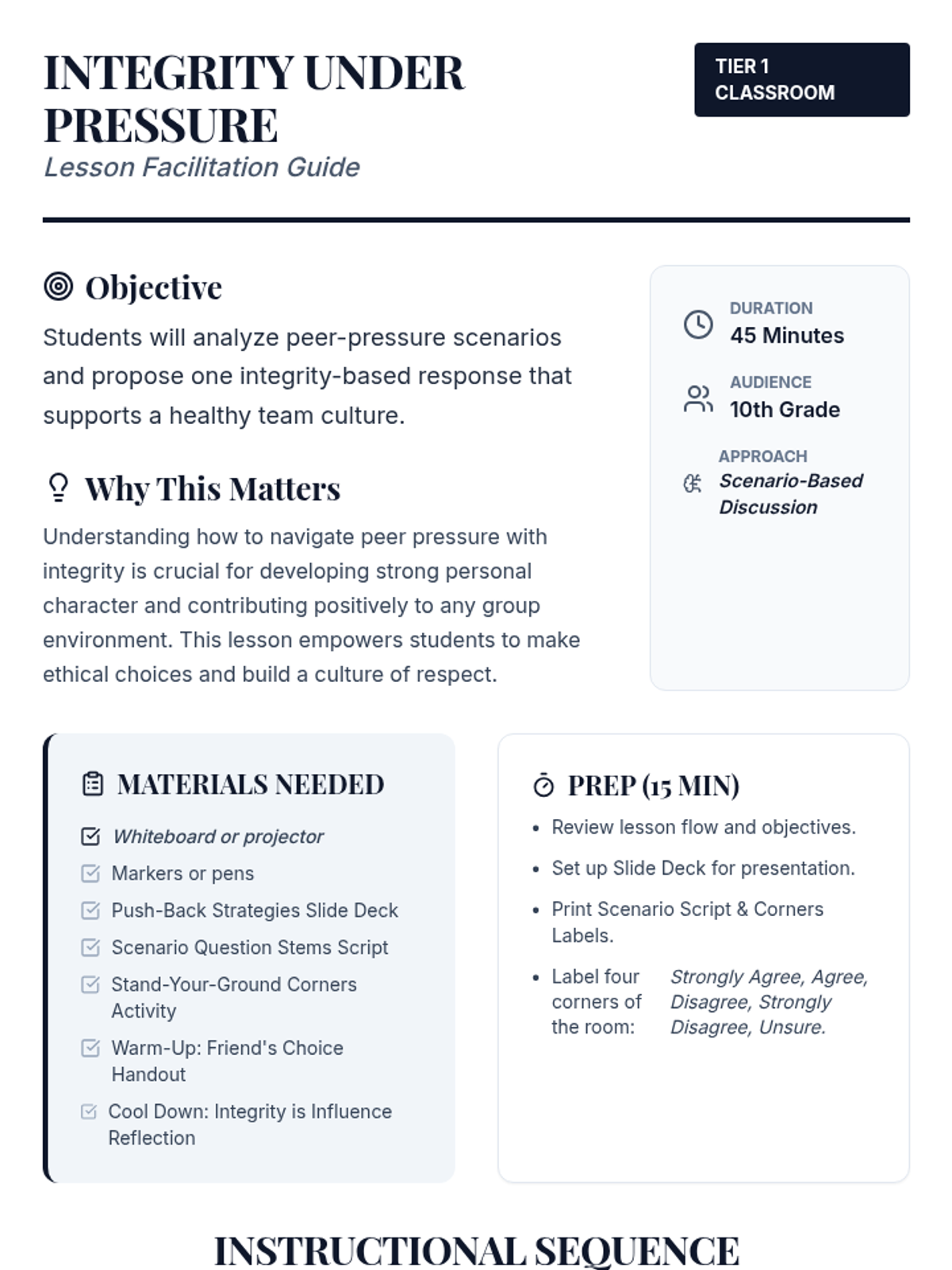 A 45-minute lesson for 10th graders focused on navigating peer pressure with integrity, utilizing scenario-based activities and vocabulary analysis to foster a healthy team culture.