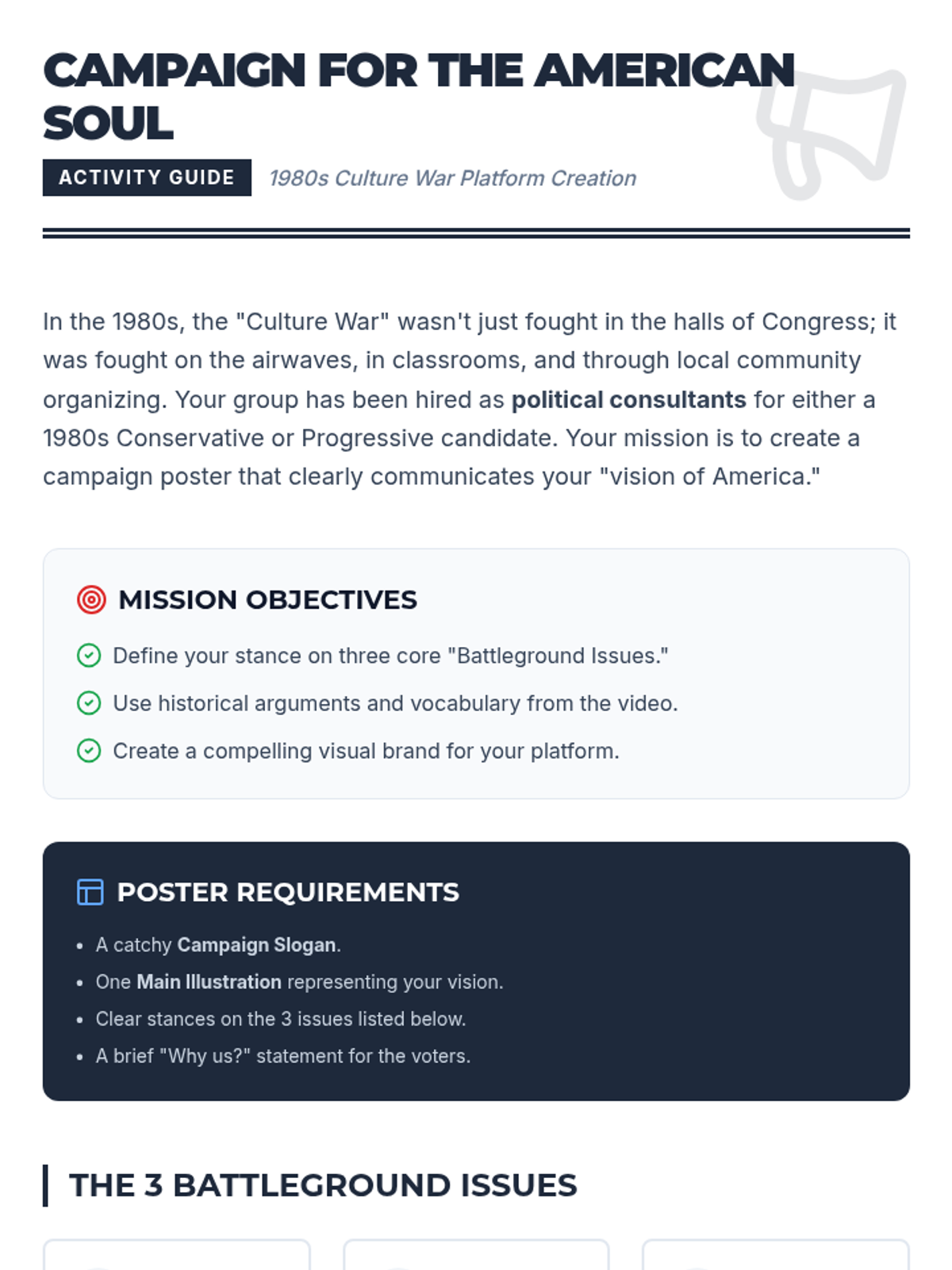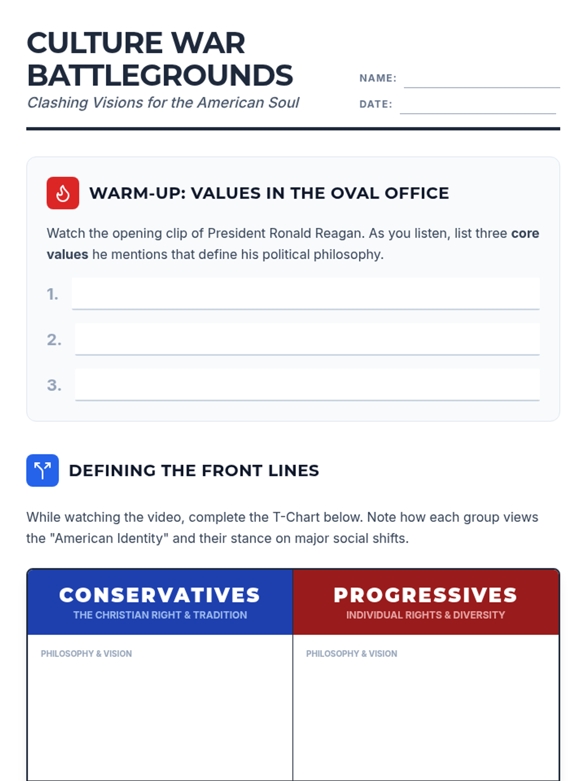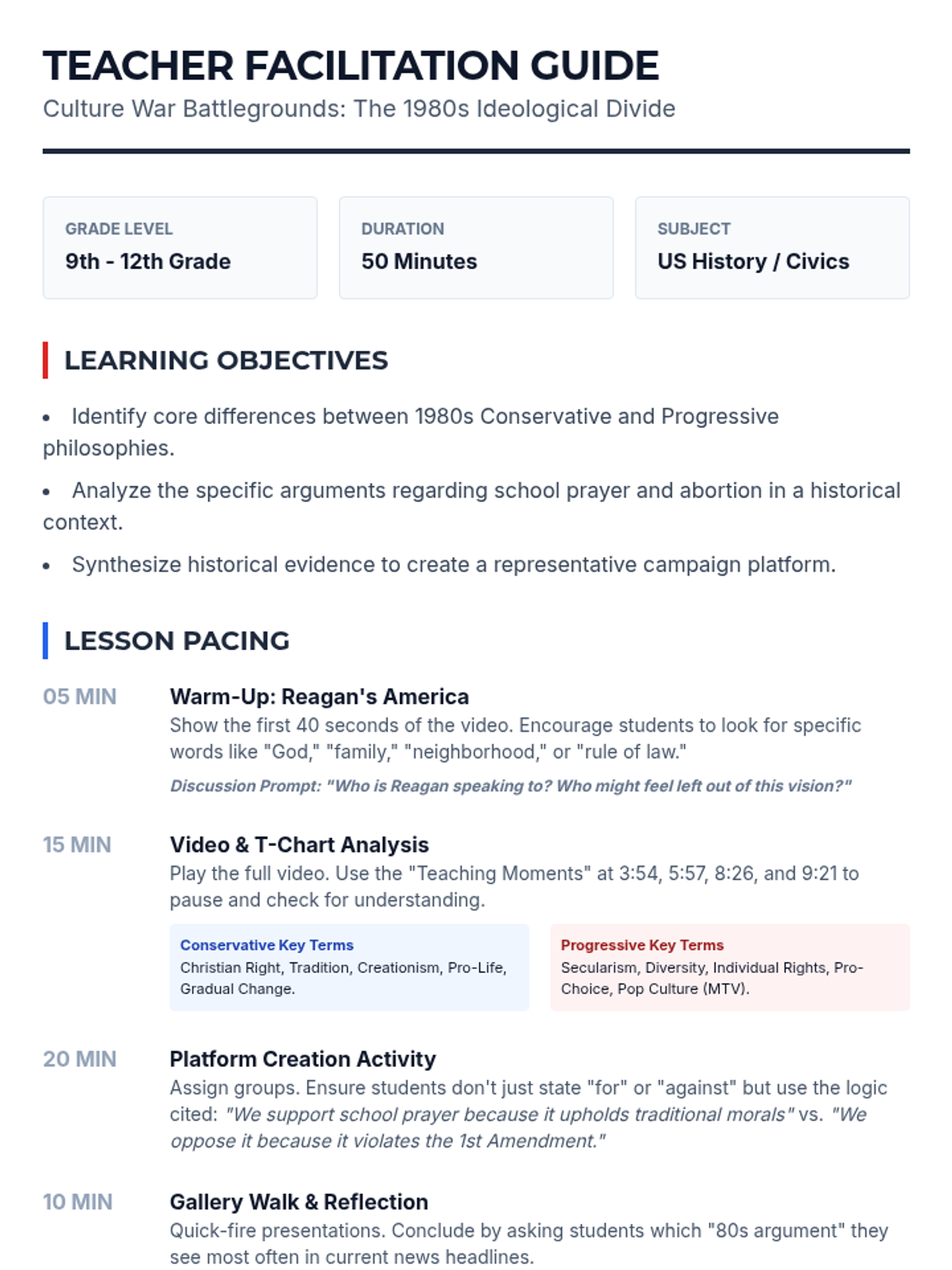A comprehensive lesson exploring the ideological divide of the 1980s Culture Wars, focusing on the conflicting values of Conservatives and Progressives regarding religion, social norms, and the vision for America's future.
