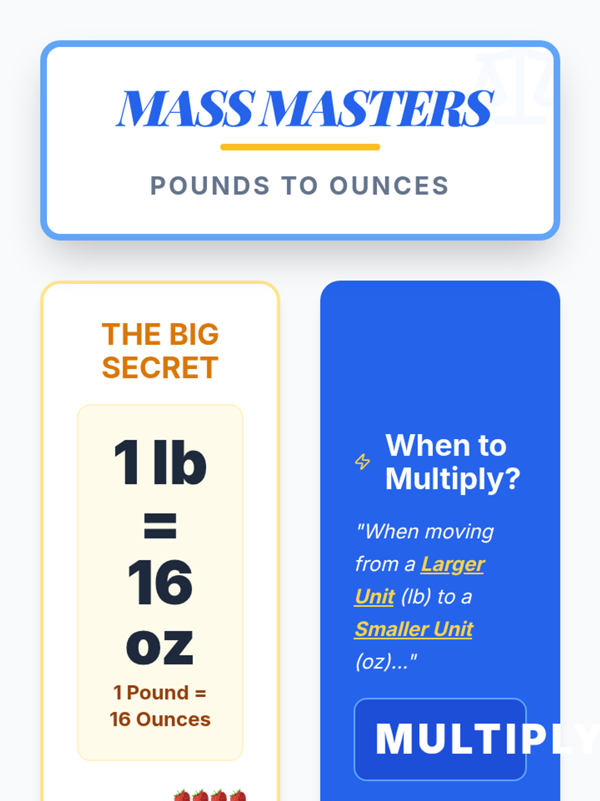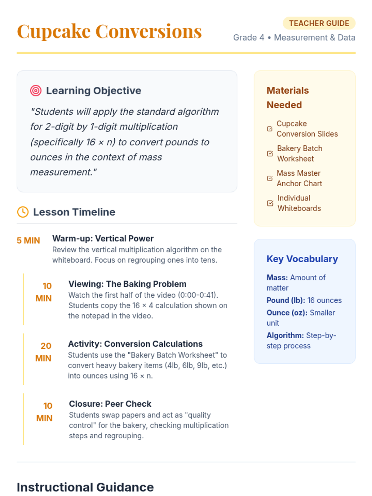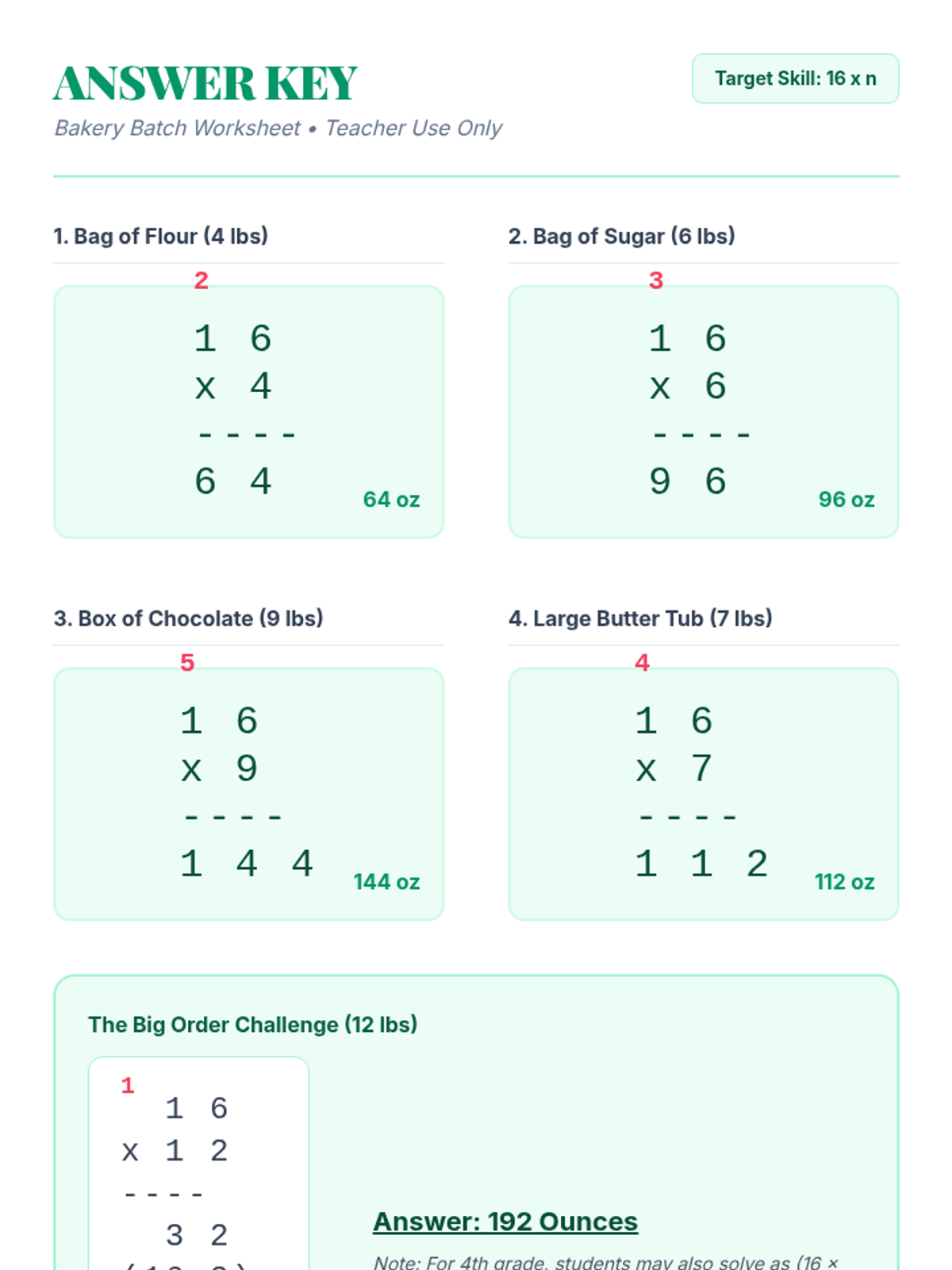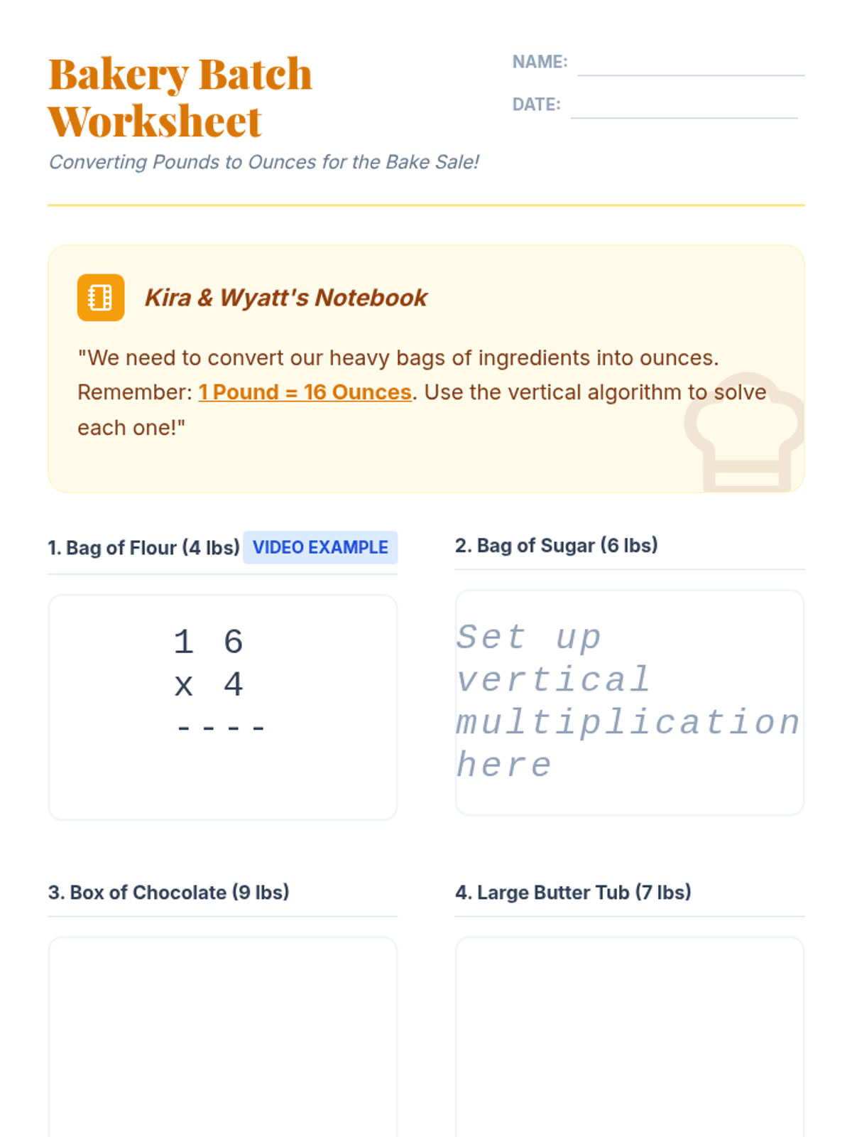 A 4th-grade math lesson focusing on 2-digit by 1-digit multiplication within the context of customary weight conversion (pounds to ounces). Students use the standard algorithm to solve real-world baking problems inspired by a video tutorial.