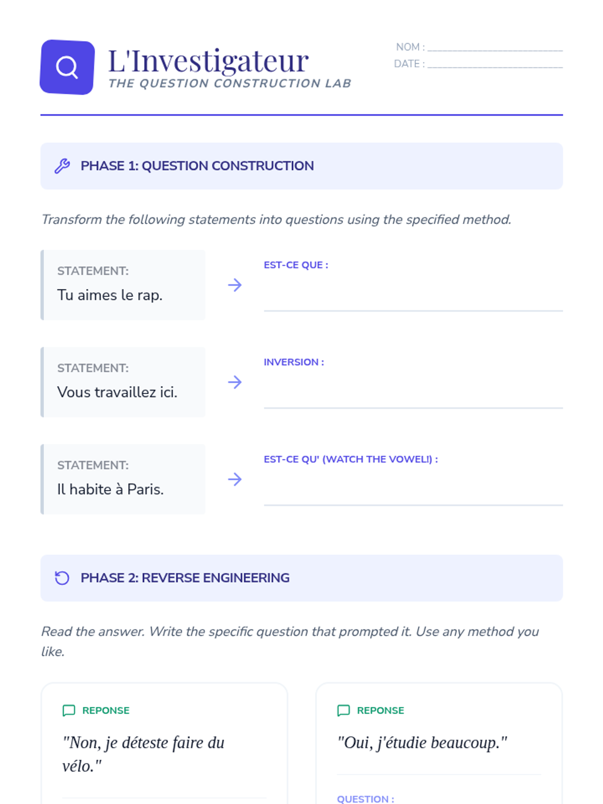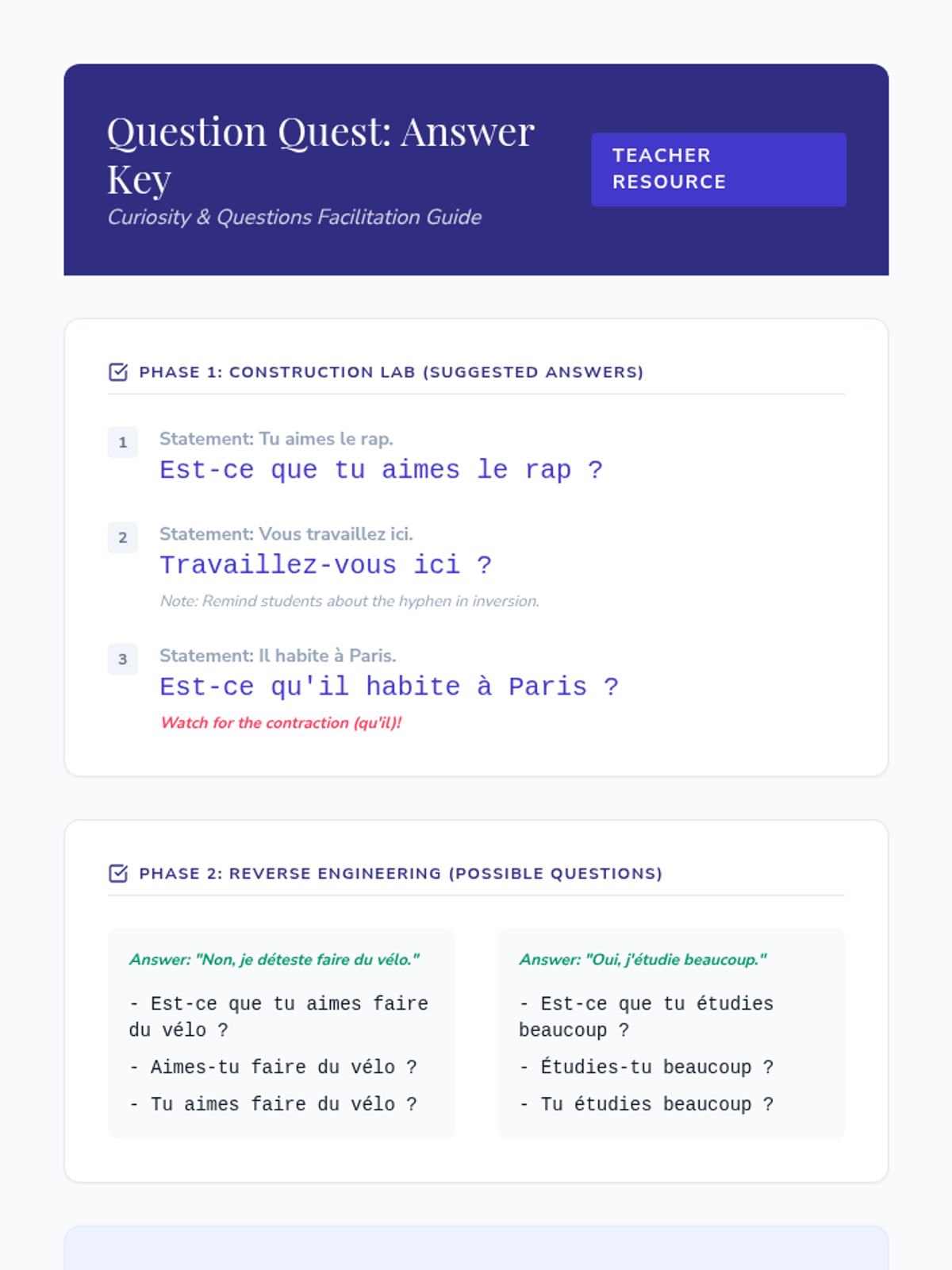 Focuses on the mechanics of French questions, teaching students to use intonation, 'est-ce que', and inversion. This builds the foundational tools for interviewing peers.