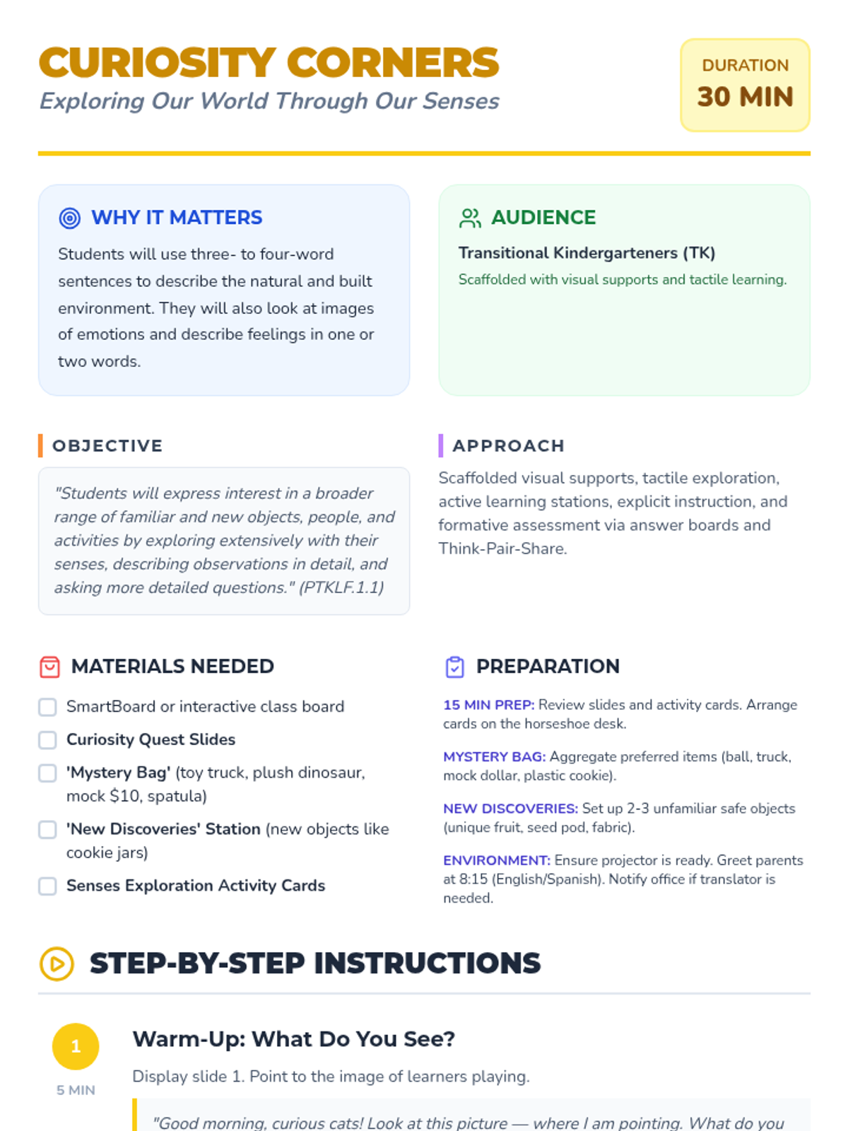 This lesson encourages Transitional Kindergarteners to explore their world using all five senses, articulate their observations, and ask inquisitive questions through hands-on 'Curiosity Corners'.
