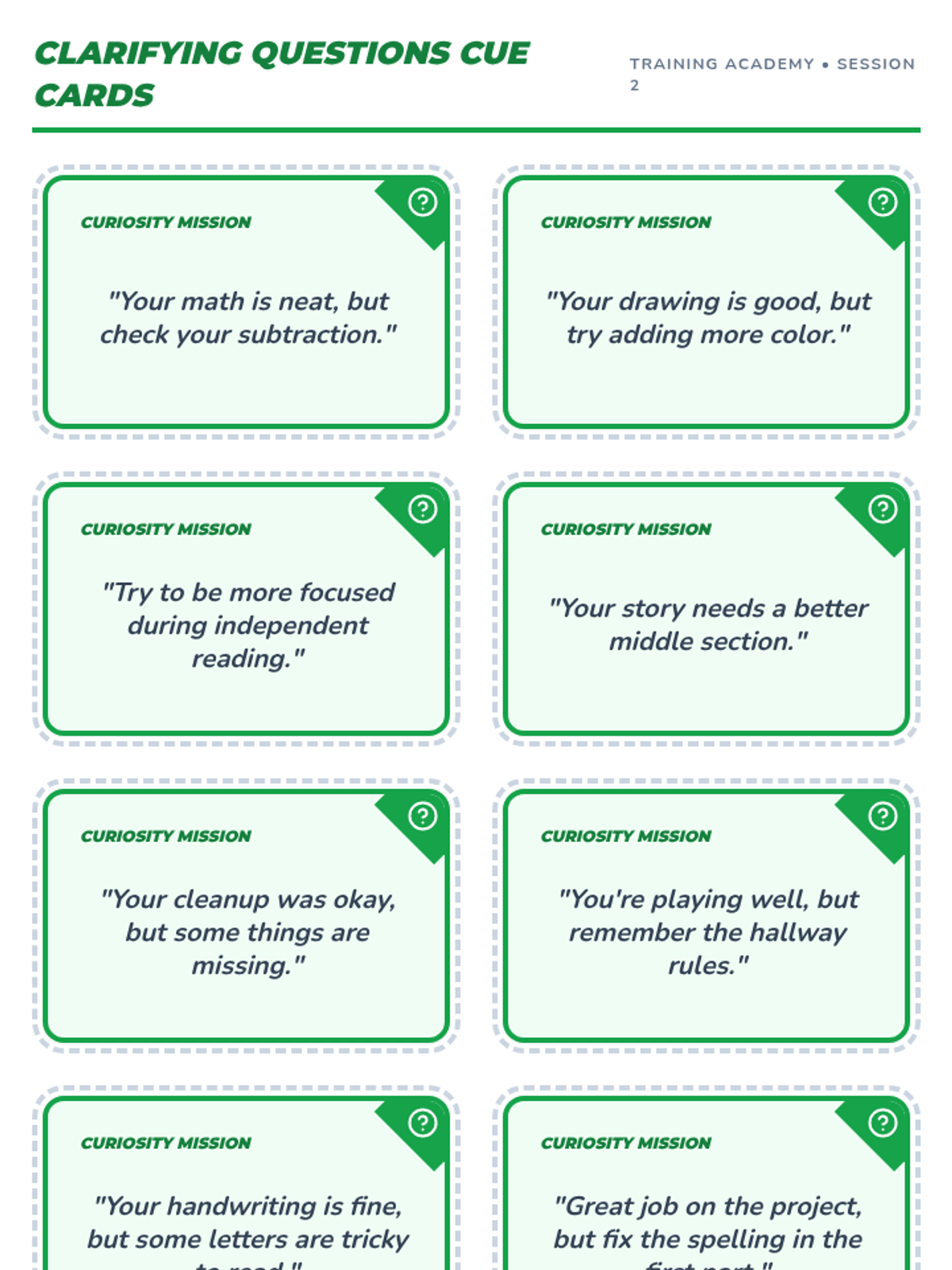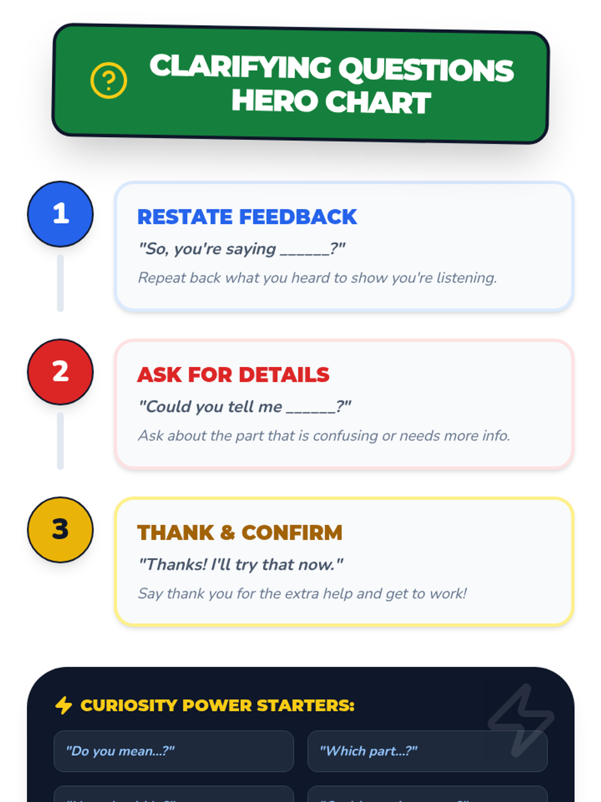 Teaches students to ask clarifying questions when feedback is unclear. Focuses on restating feedback, asking for specific details politely, and maintaining a growth mindset through curiosity.