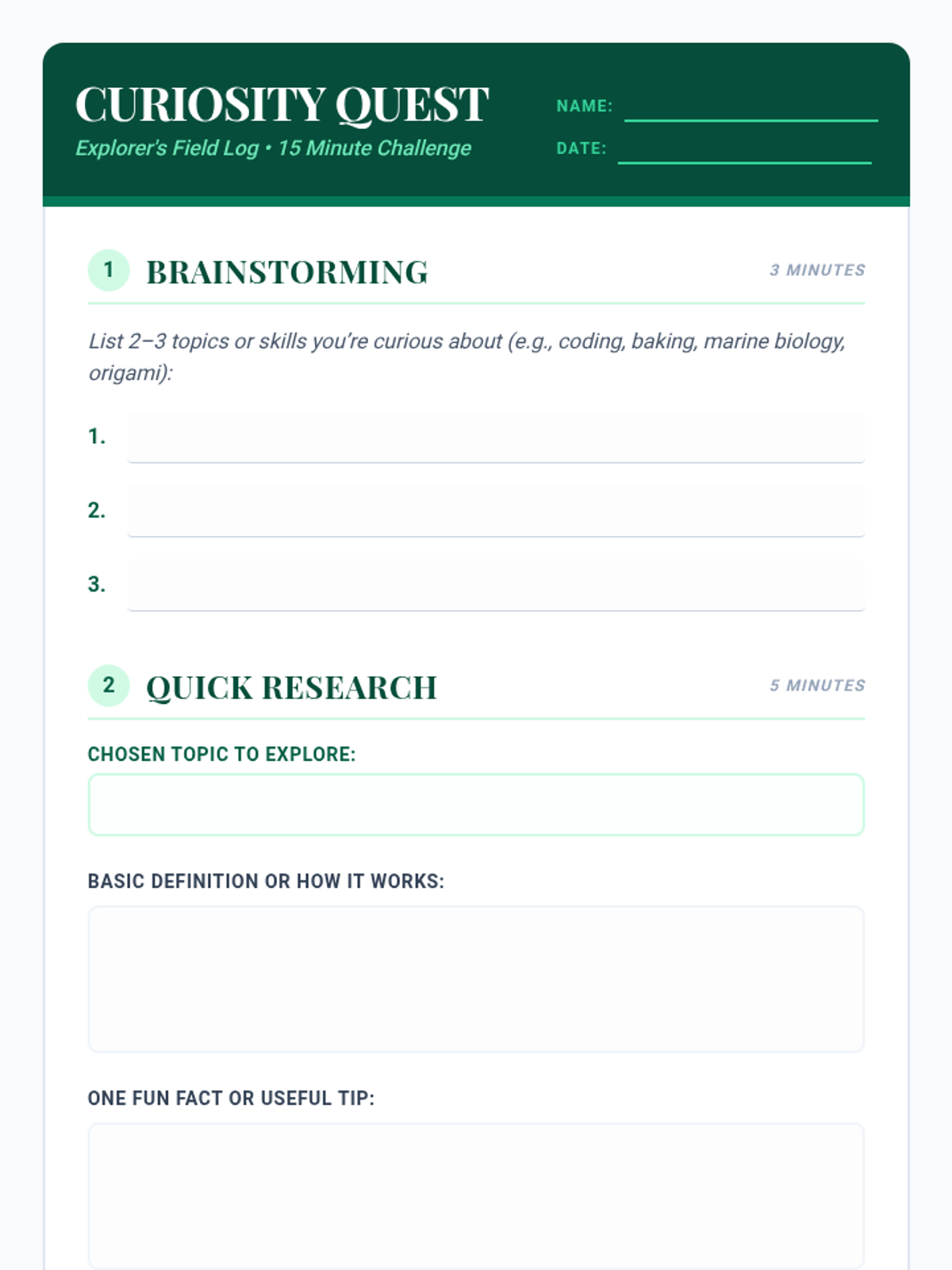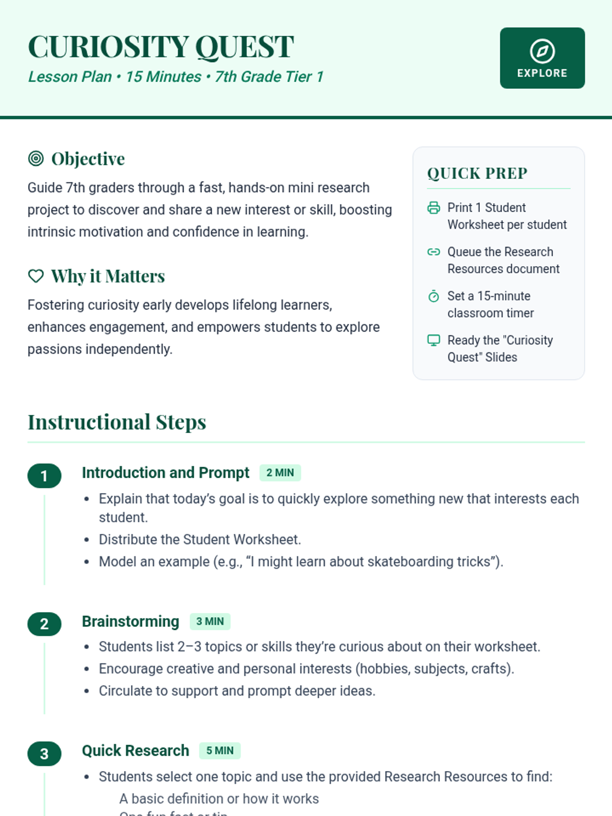 A 15-minute 7th grade mini-exploration activity designed to foster intrinsic motivation and lifelong learning skills through self-directed research and sharing.