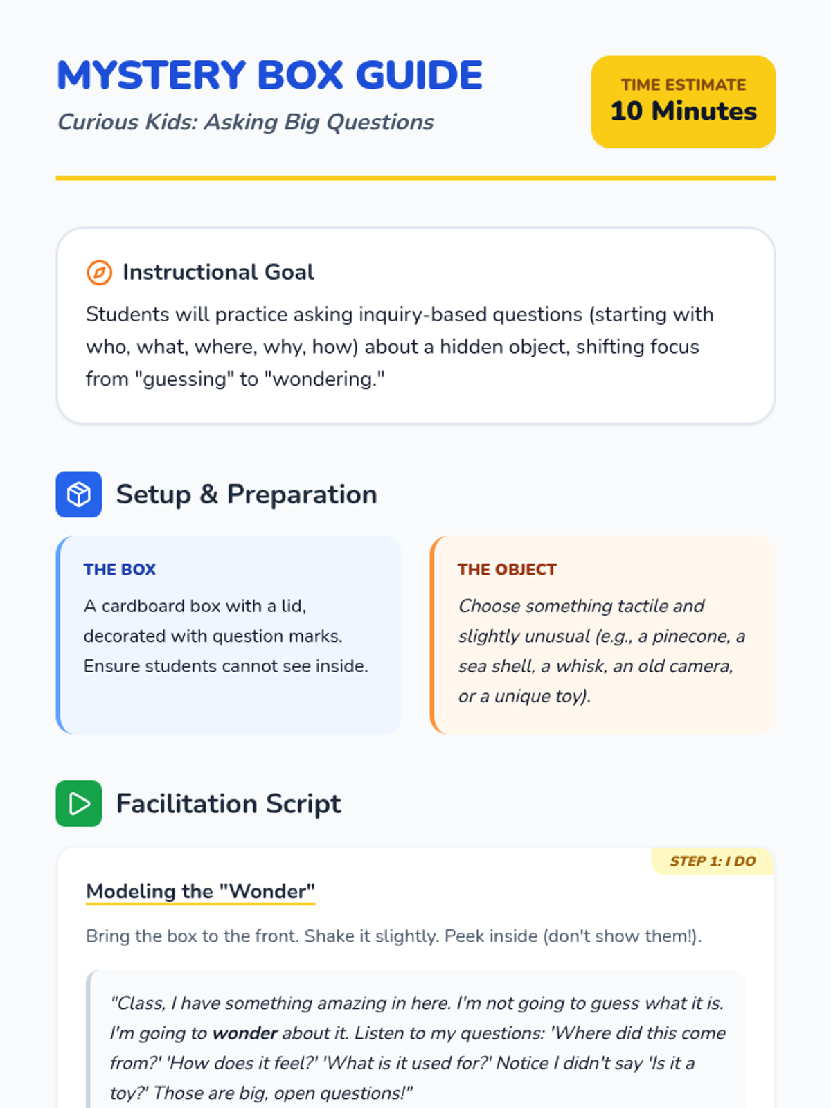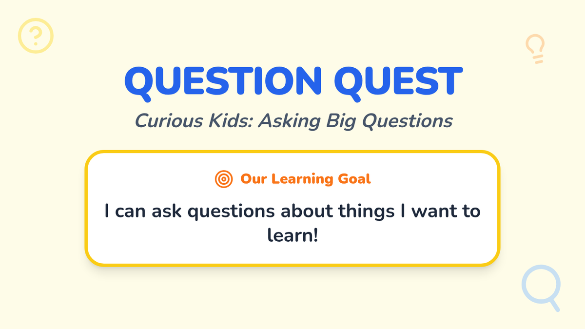 A 25-minute Kindergarten lesson focused on fostering curiosity and the ability to ask inquiry-based questions. Students will learn how to formulate questions and identify various sources for finding answers.