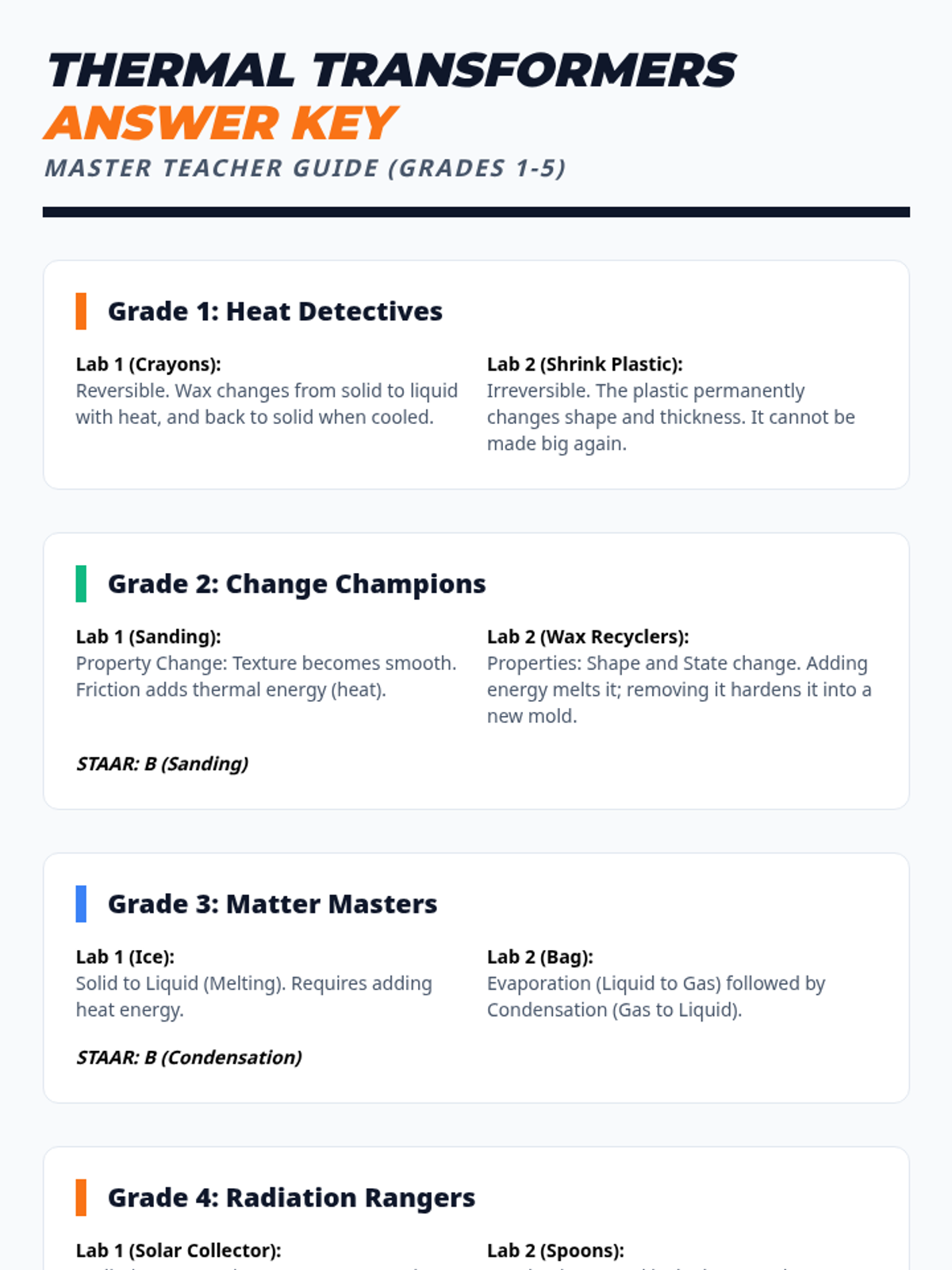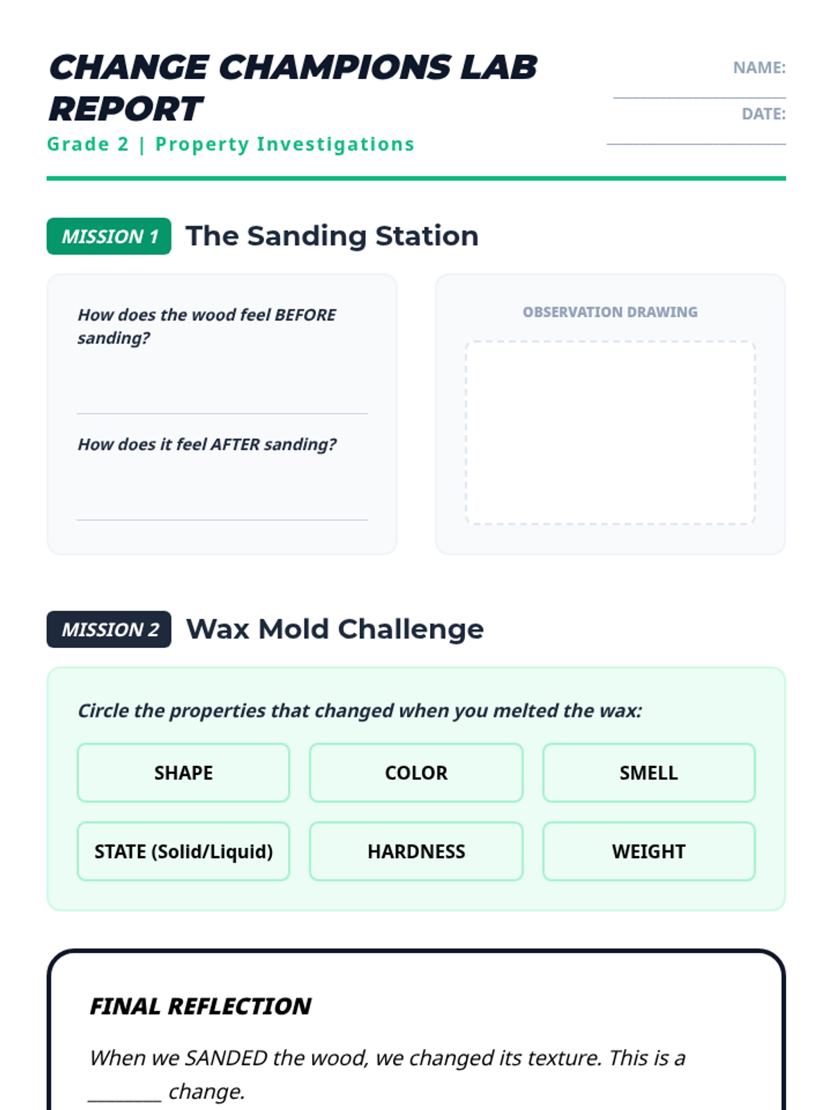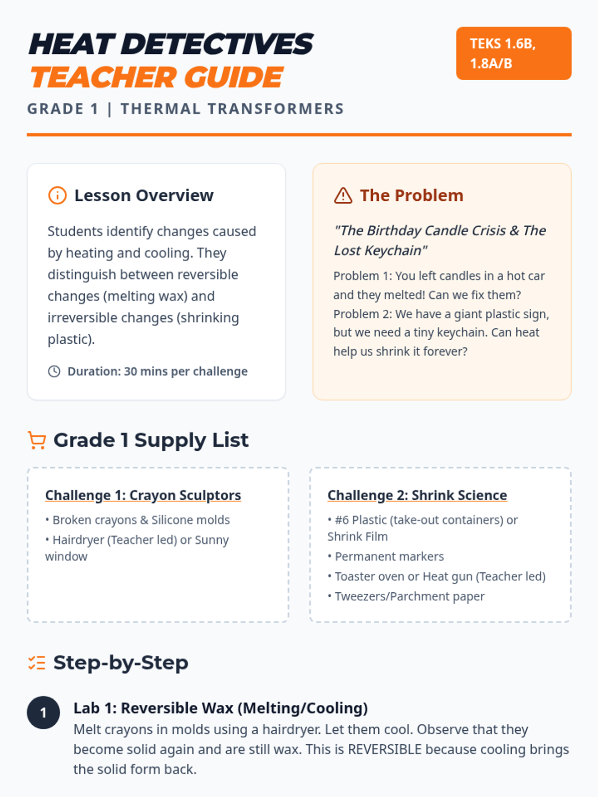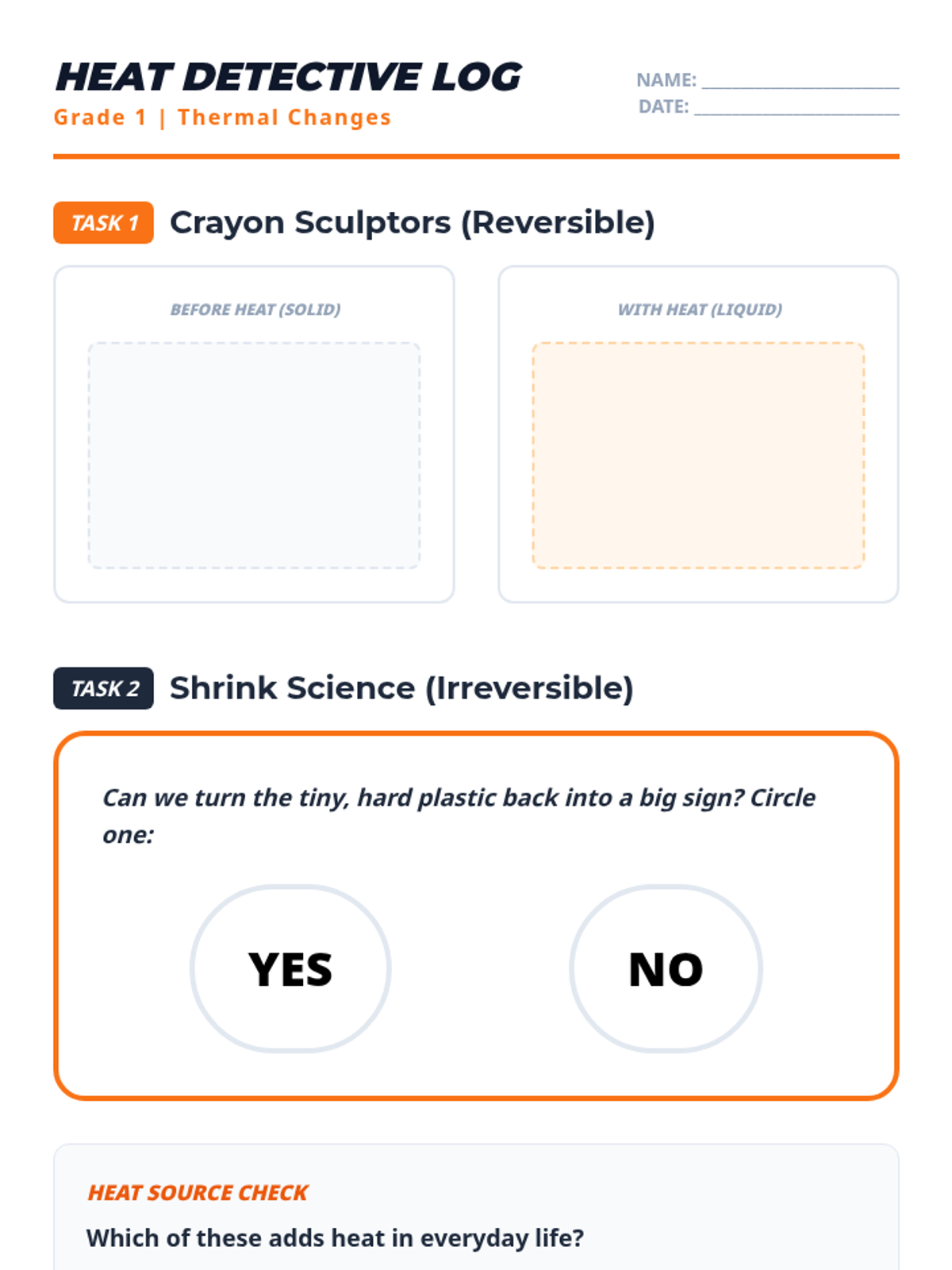 Focuses on identifying changes caused by heating and cooling, specifically distinguishing between reversible (melting wax) and irreversible (baking/cooking) changes. Includes 'Crayon Sculptors' and 'Pancake Puzzle'.