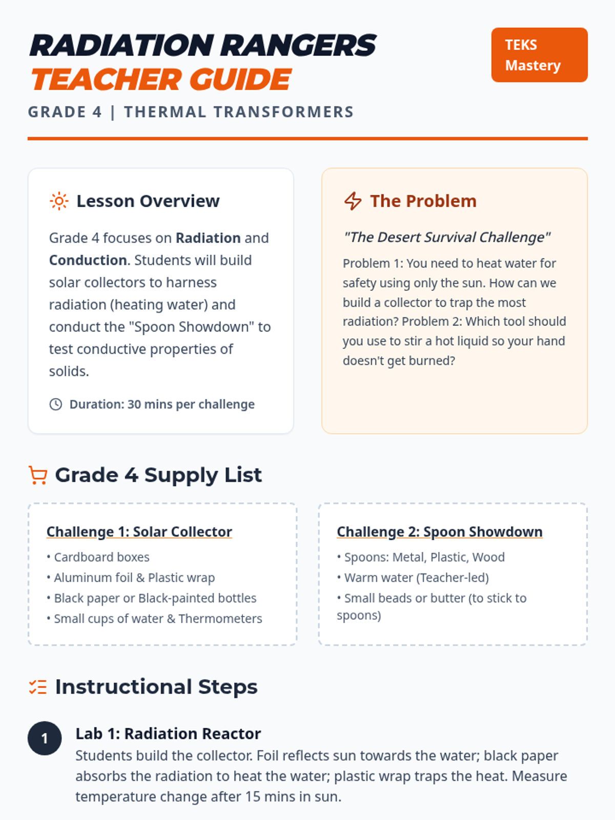 Focuses on Radiation and Conduction. Students build Solar Ovens to harness radiation and conduct the 'Spoon Showdown' to test how different materials transfer heat via conduction.