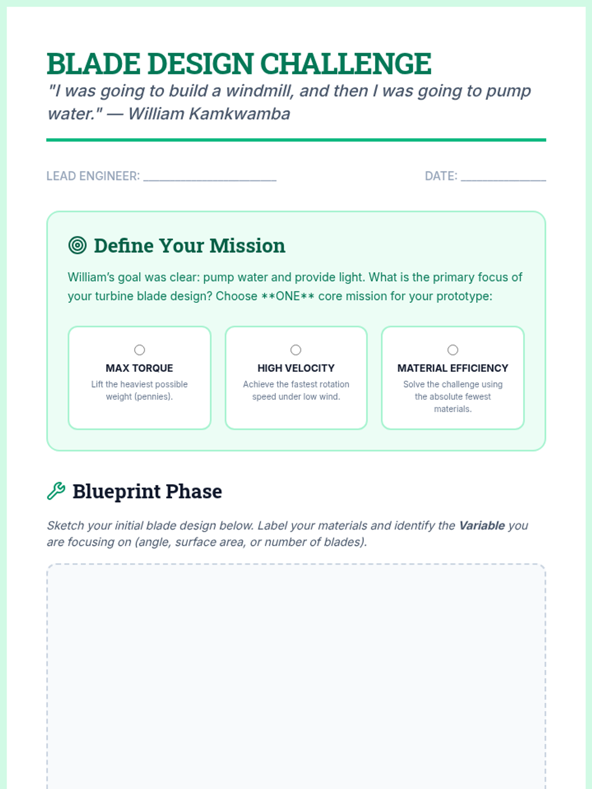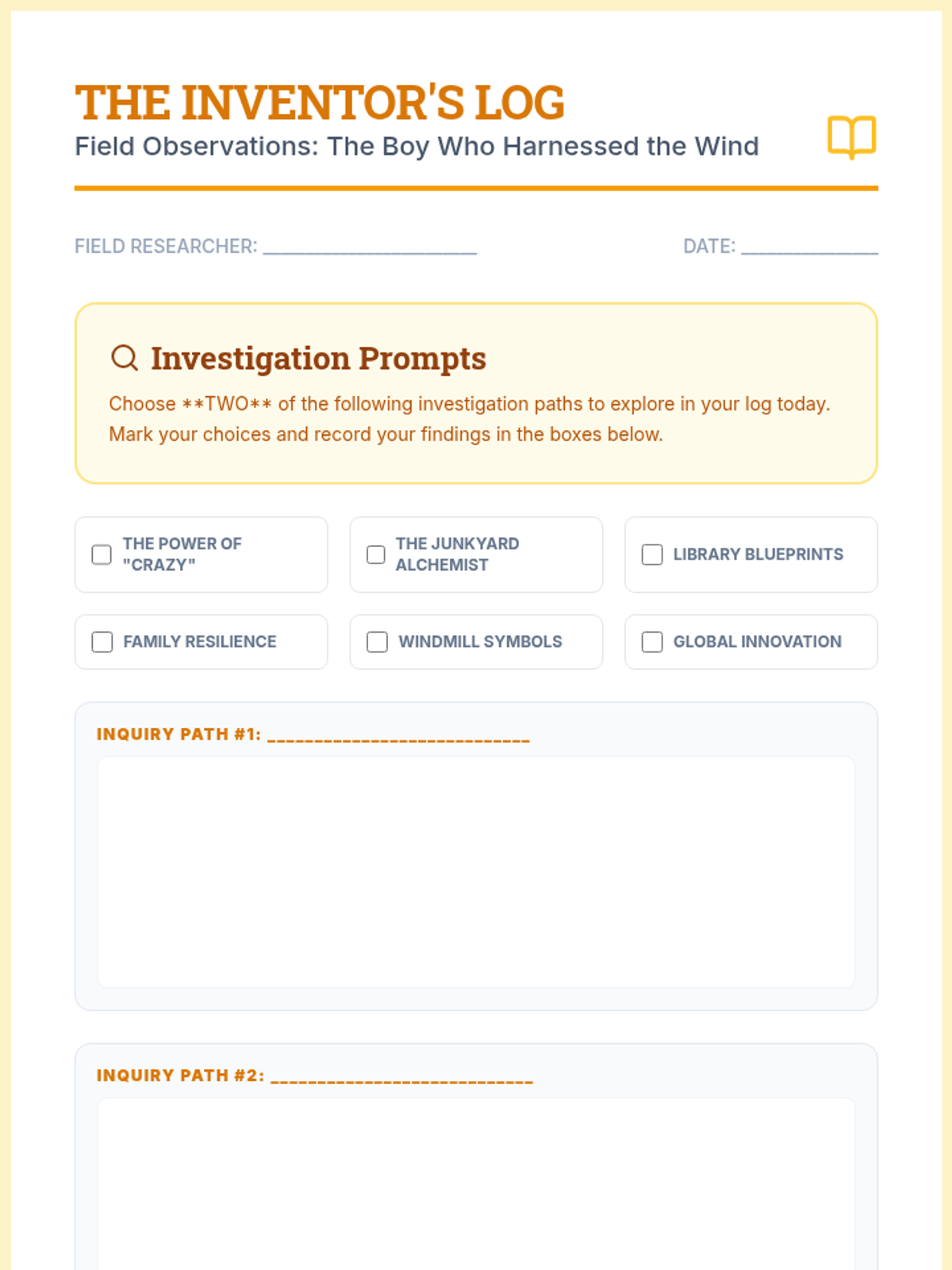 A comprehensive set of extension activities for the book 'The Boy Who Harnessed the Wind', featuring reading analysis, creative writing, renewable energy research, and a hands-on STEM engineering challenge.