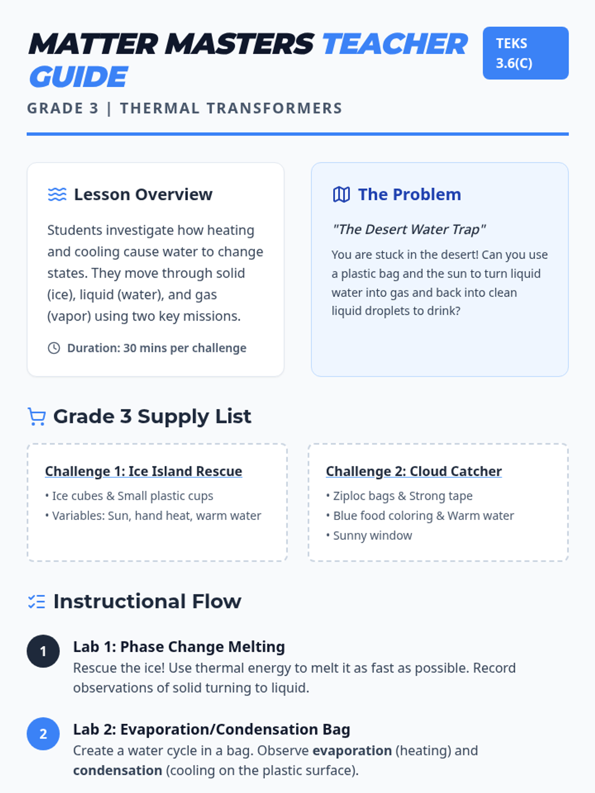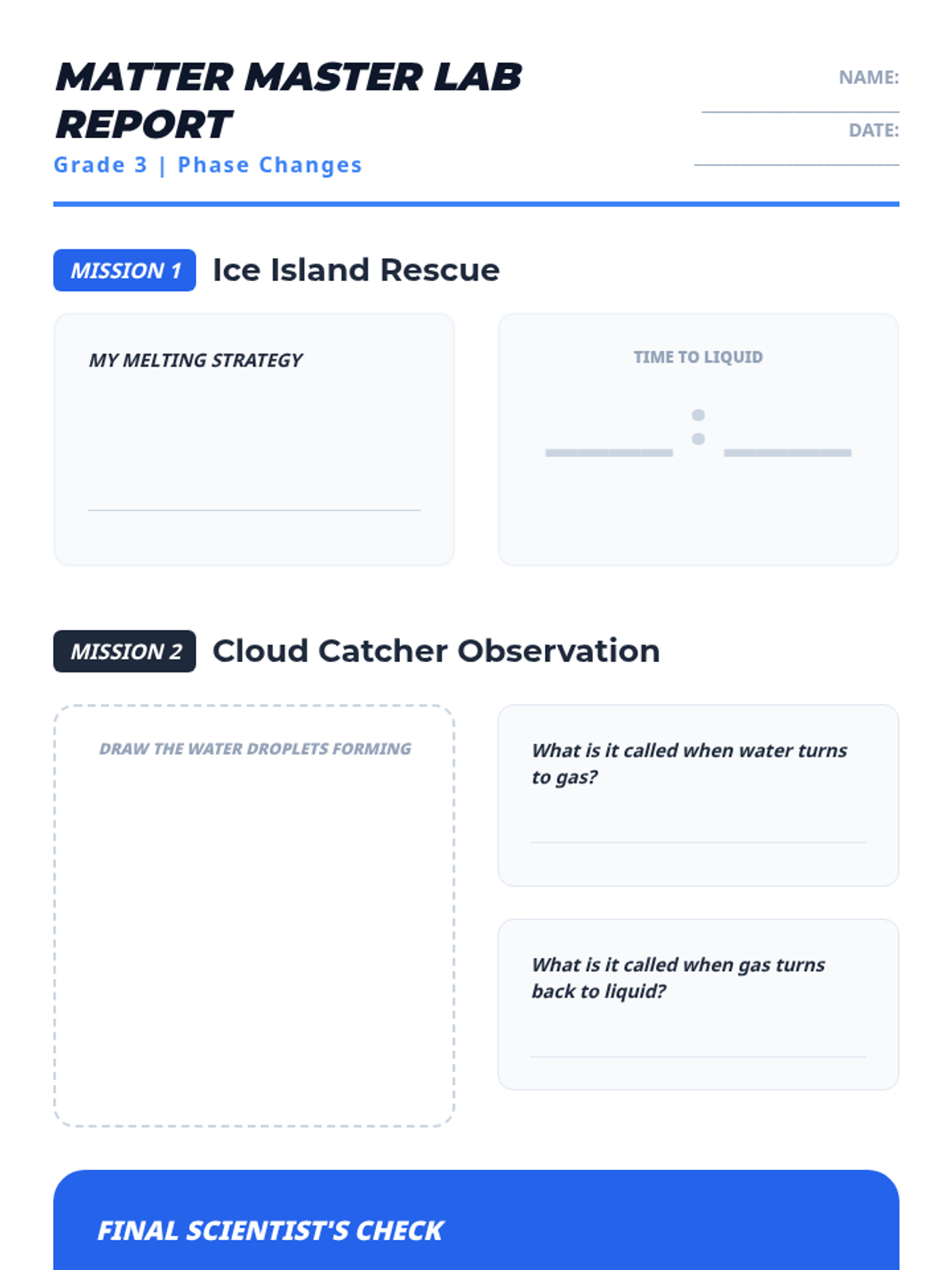 Explores phase changes in water (solid, liquid, gas). Students solve the "Desert Water Trap" using 'Ice Island Rescue' and 'Cloud Catcher' activities to master evaporation and condensation.