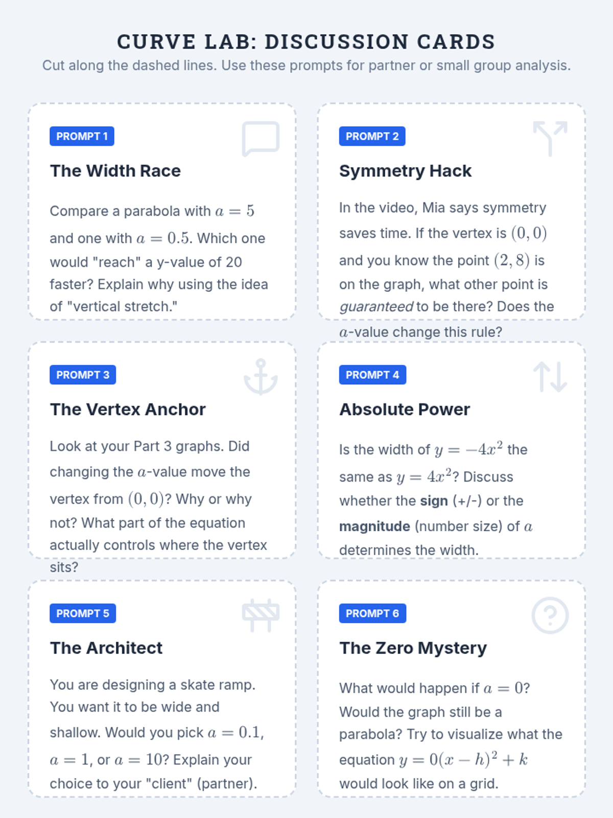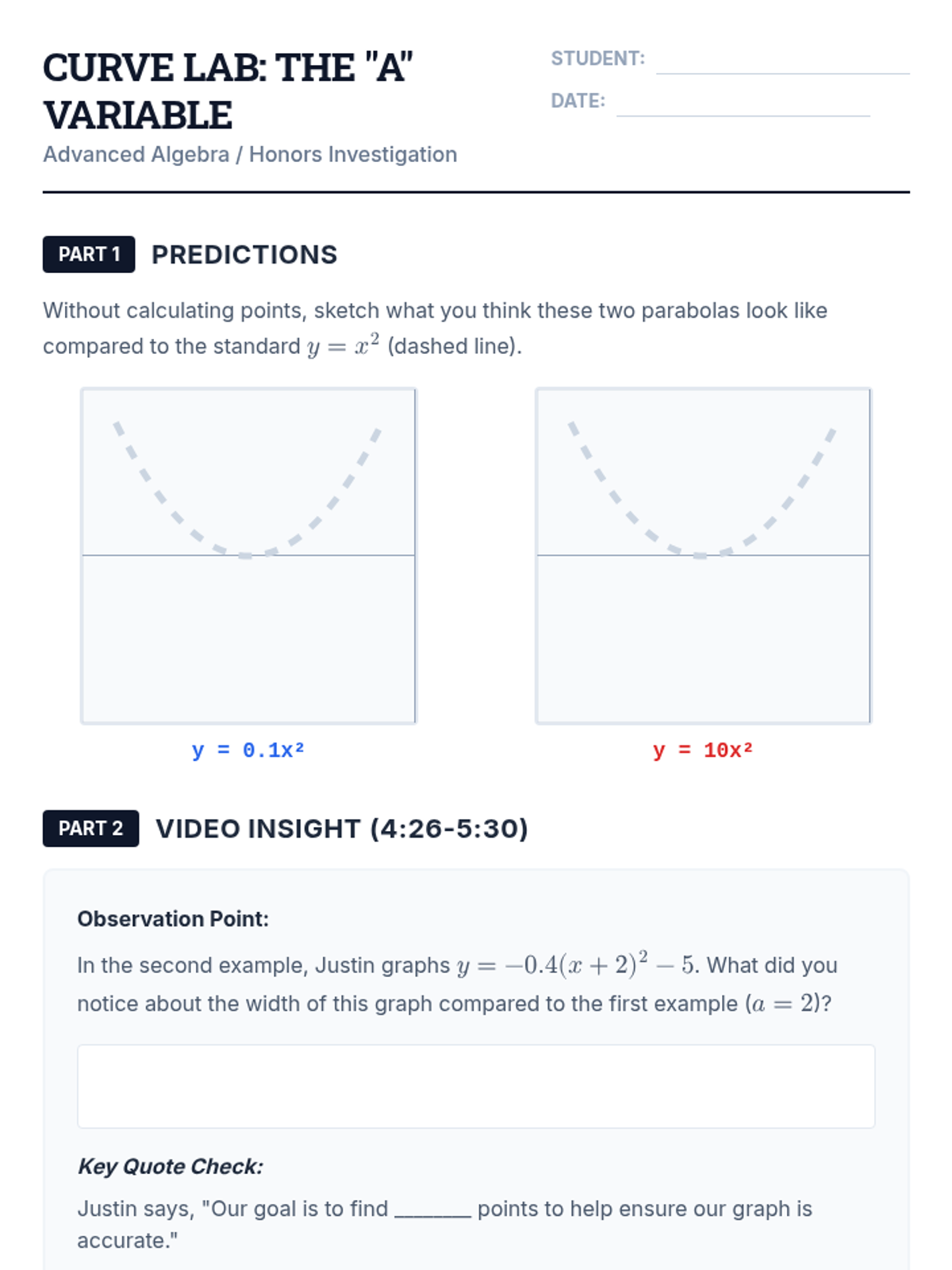 Students will investigate how the 'a' coefficient in vertex form influences the vertical stretch, compression, and direction of parabolas through graphing and video analysis.