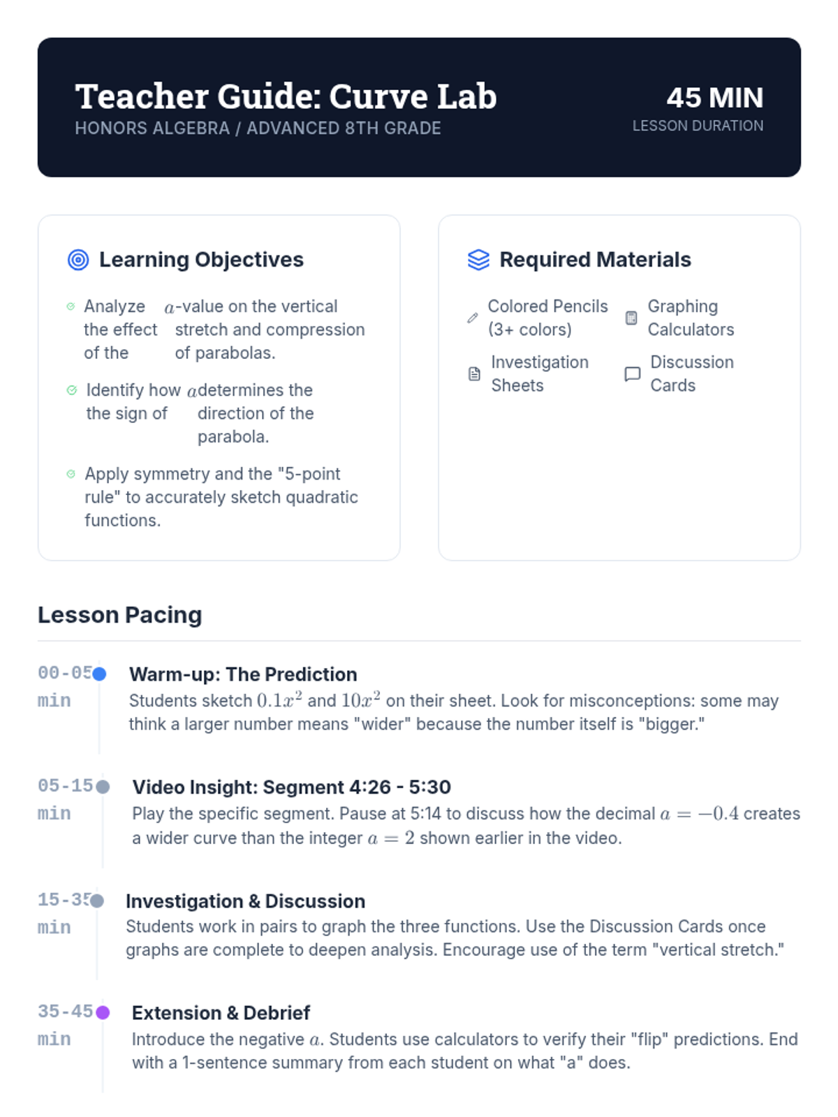 A comprehensive 35-minute lesson on graphing quadratic functions in standard form, covering vertex, axis of symmetry, end behavior, and zeros.