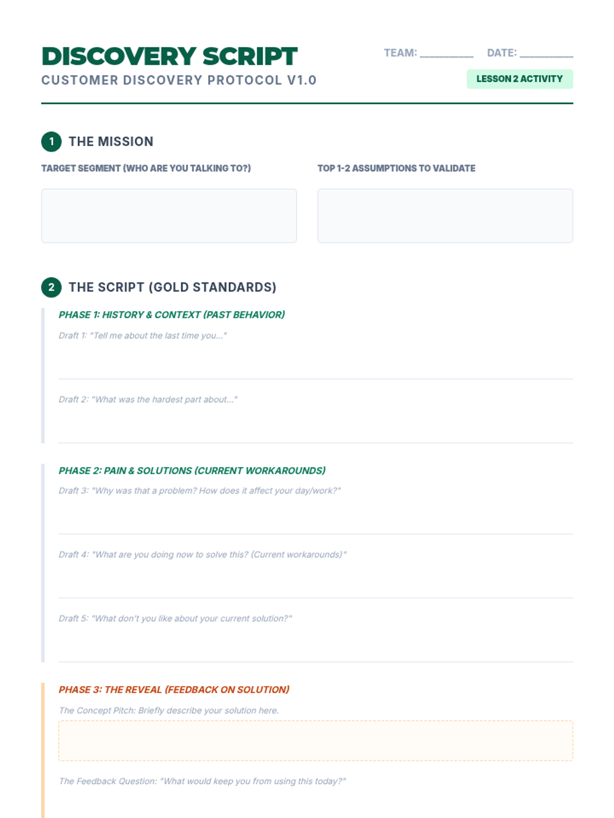 Focused on the 'Mom Test' and unbiased questioning, students design and prepare for customer discovery interviews to validate their value propositions with qualitative data.