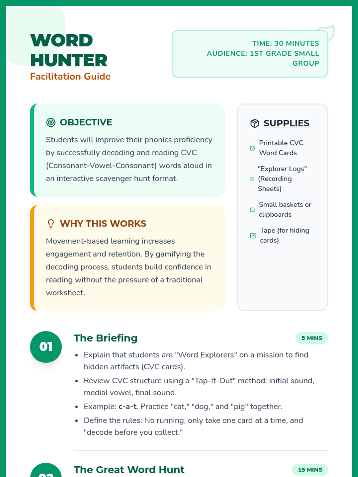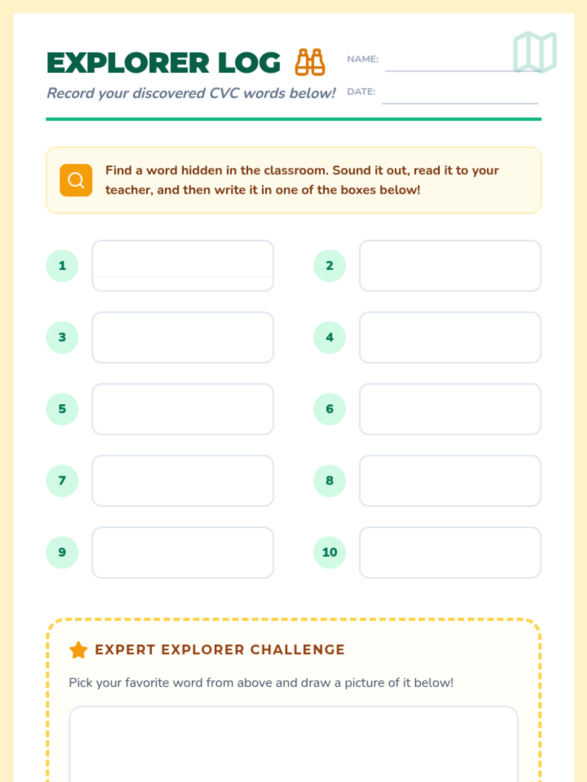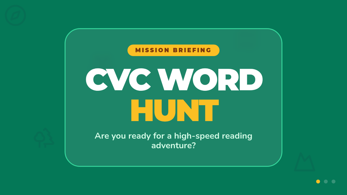 Students participate in a high-energy scavenger hunt to find hidden CVC word cards. They will practice decoding and reading words aloud to reinforce early phonics skills in a playful, interactive setting.