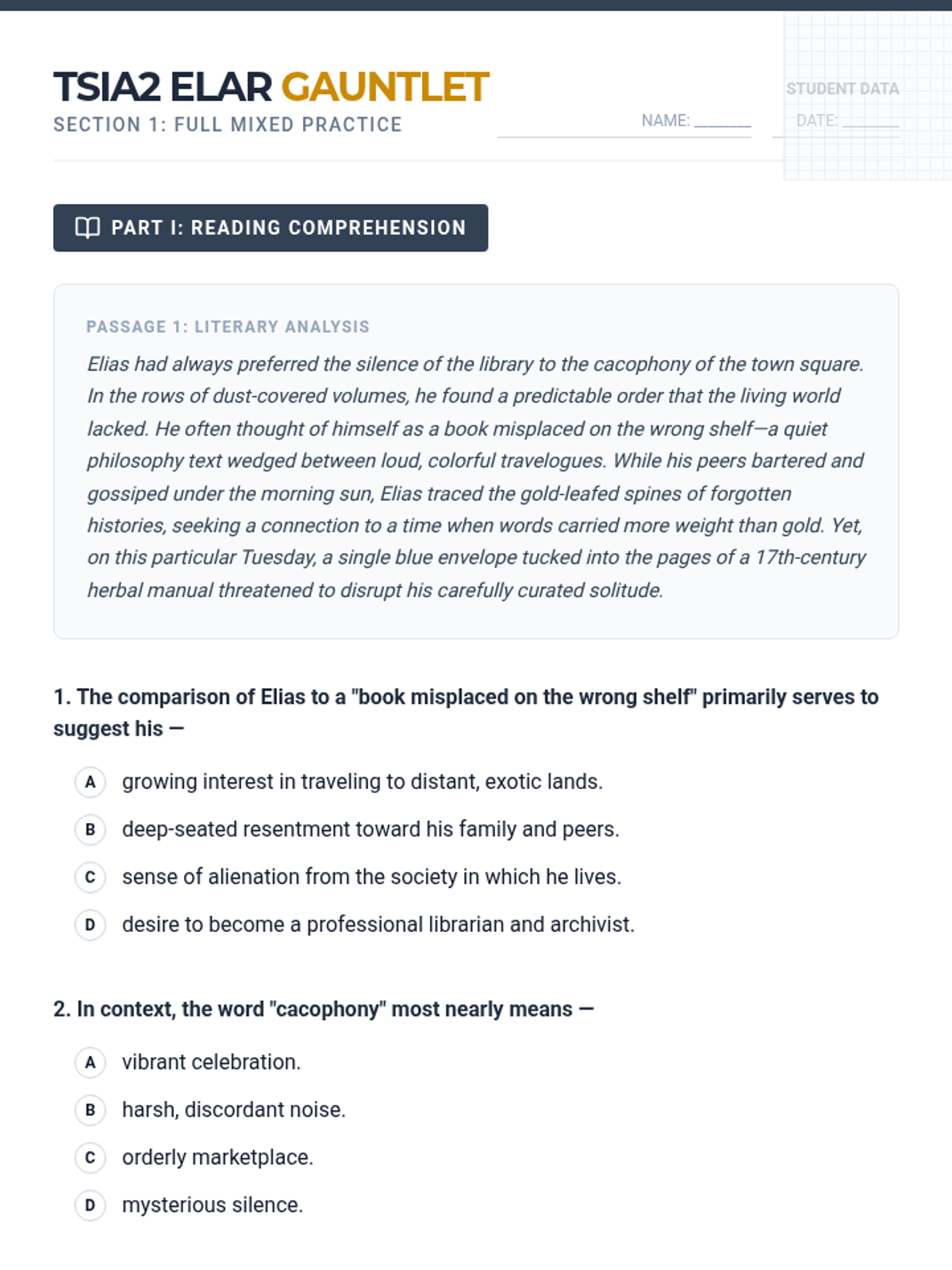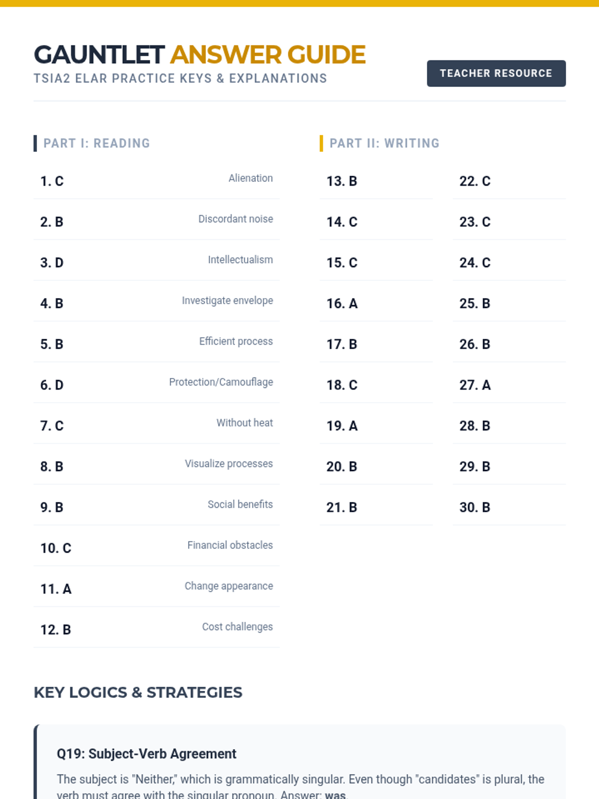 A comprehensive lesson covering TSIA2 grammar standards, including sentence structure, punctuation, agreement, and logical diction. Includes instructional slides, a 20-question practice exam, and a detailed explanation key.