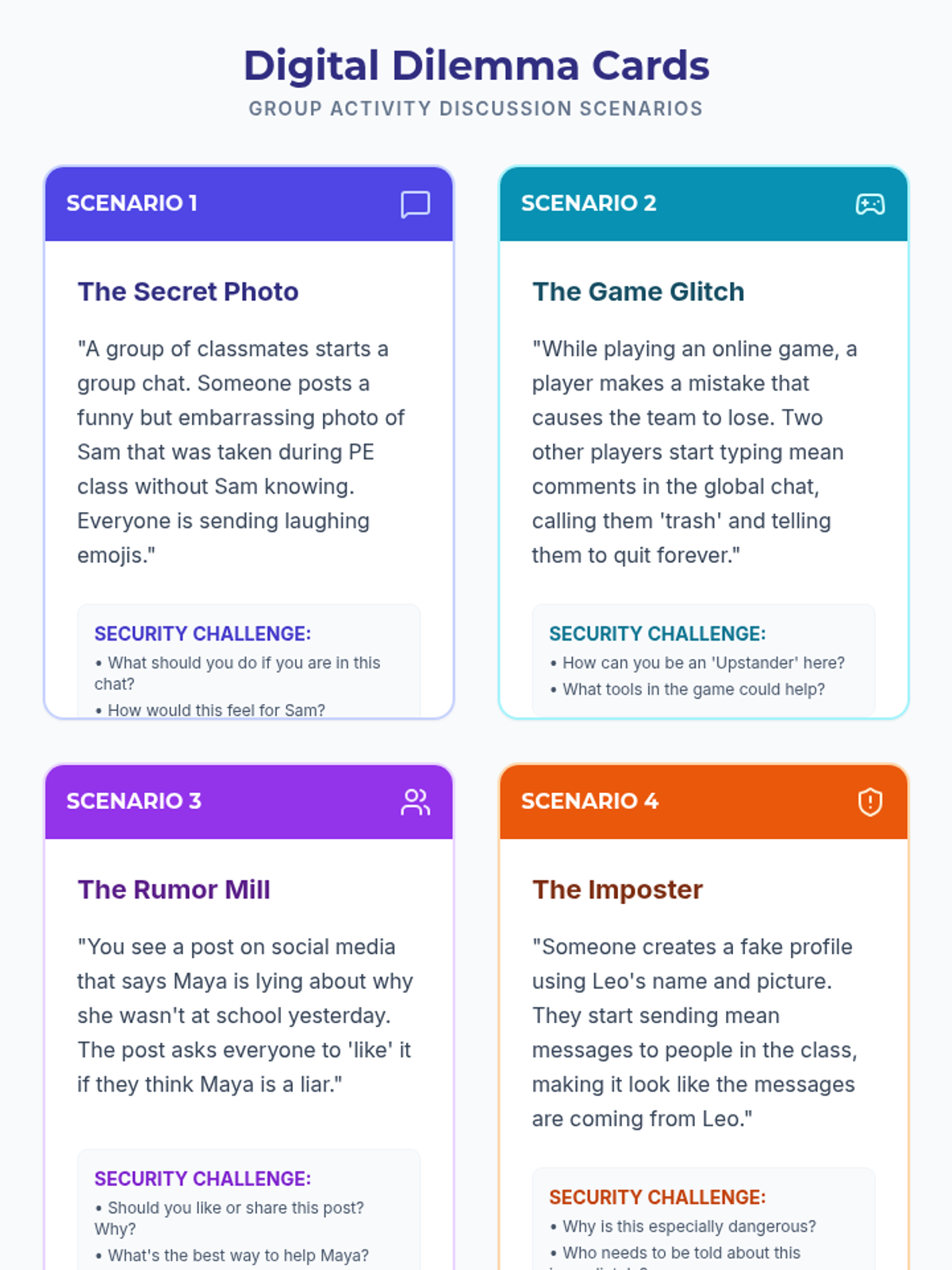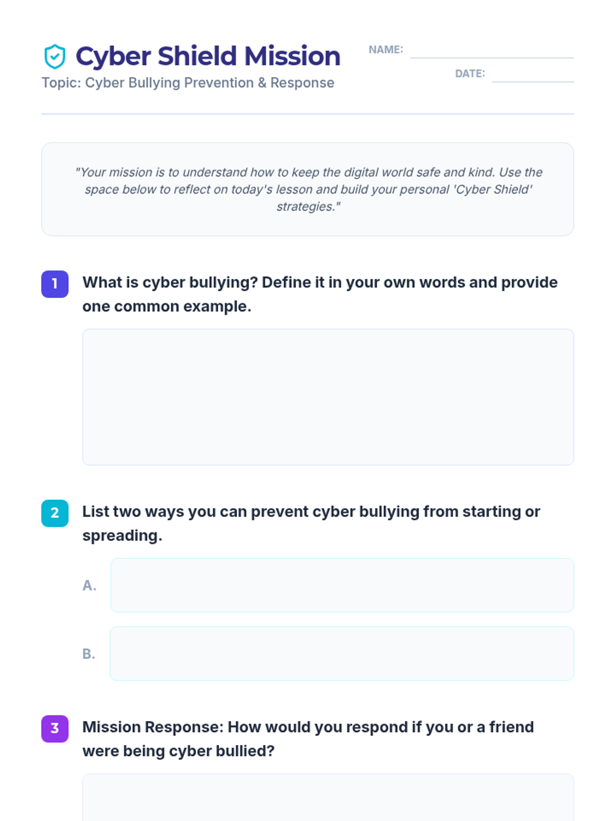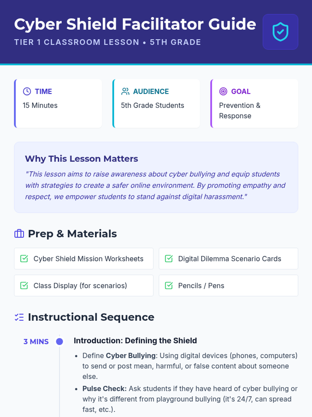 A short, impactful lesson for 5th graders to recognize, prevent, and respond to cyberbullying through discussion and reflection.