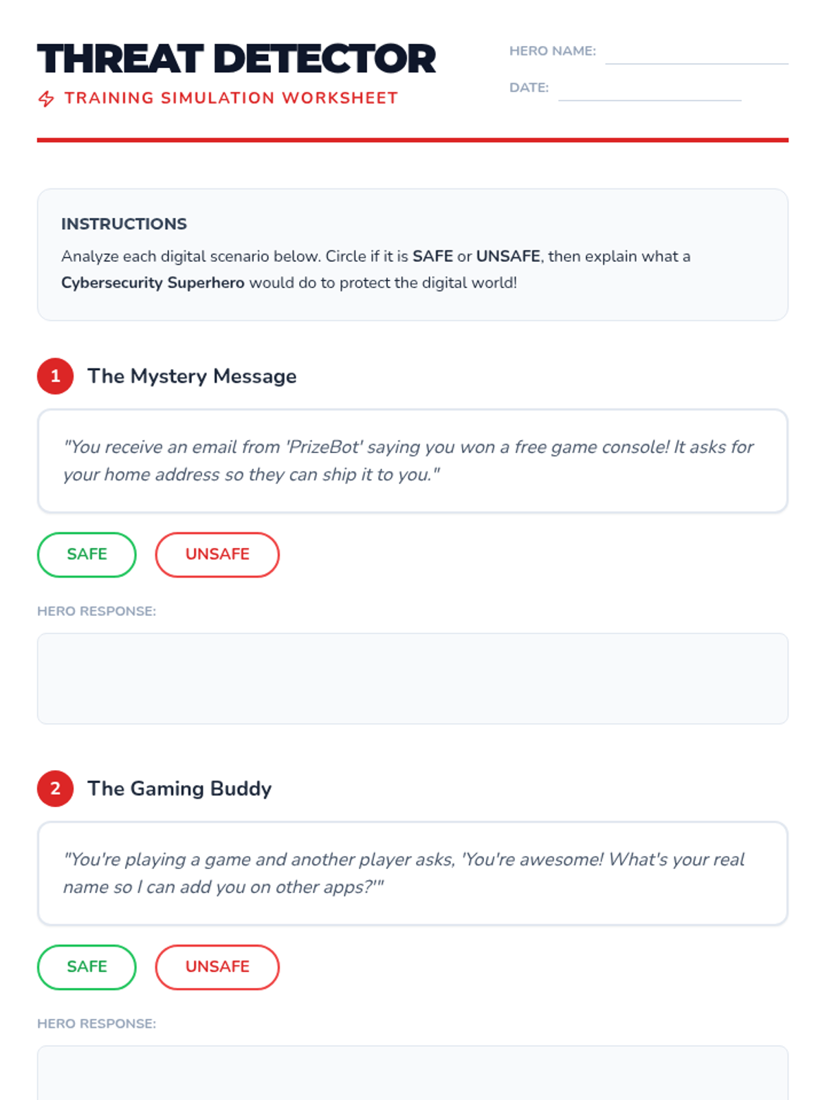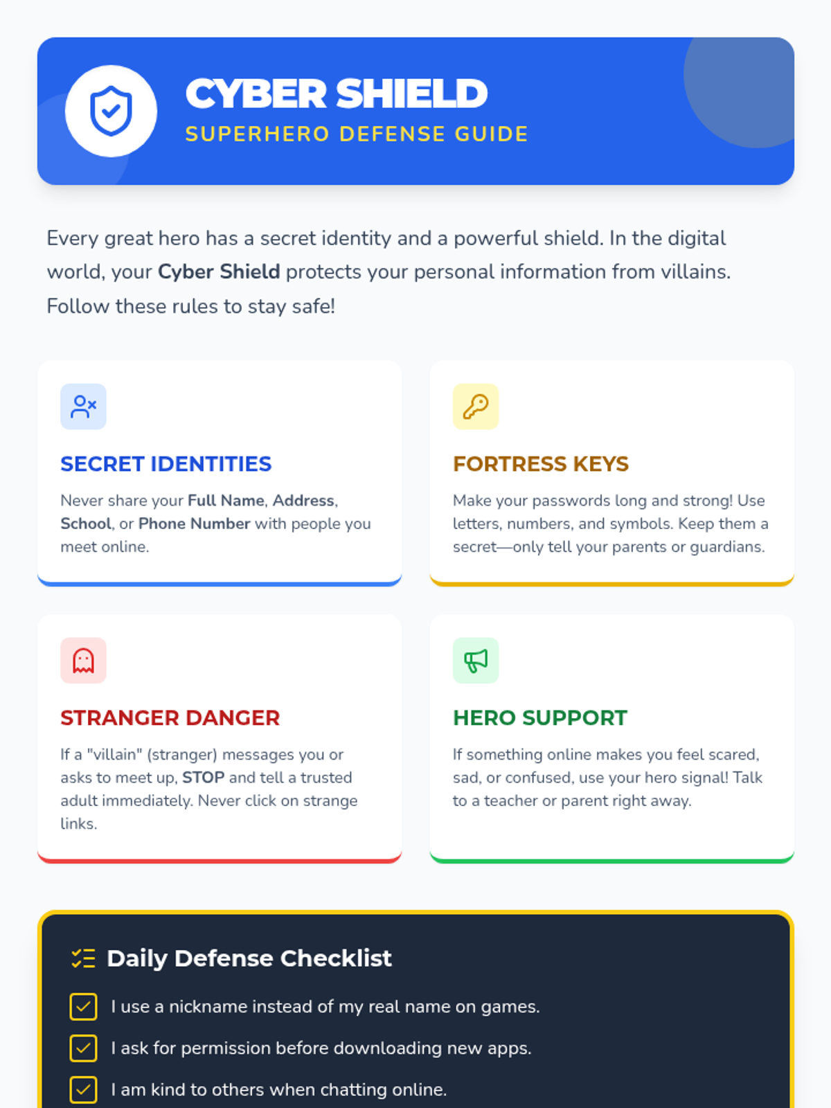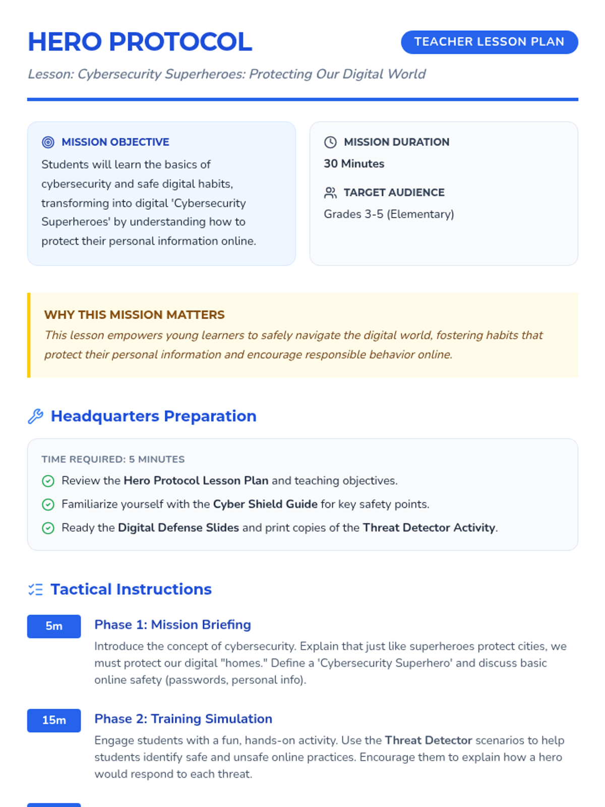 A 30-minute introductory lesson for grades 3-5 that teaches basic cybersecurity principles through a superhero-themed interactive experience. Students learn to identify safe online practices and protect their personal information.
