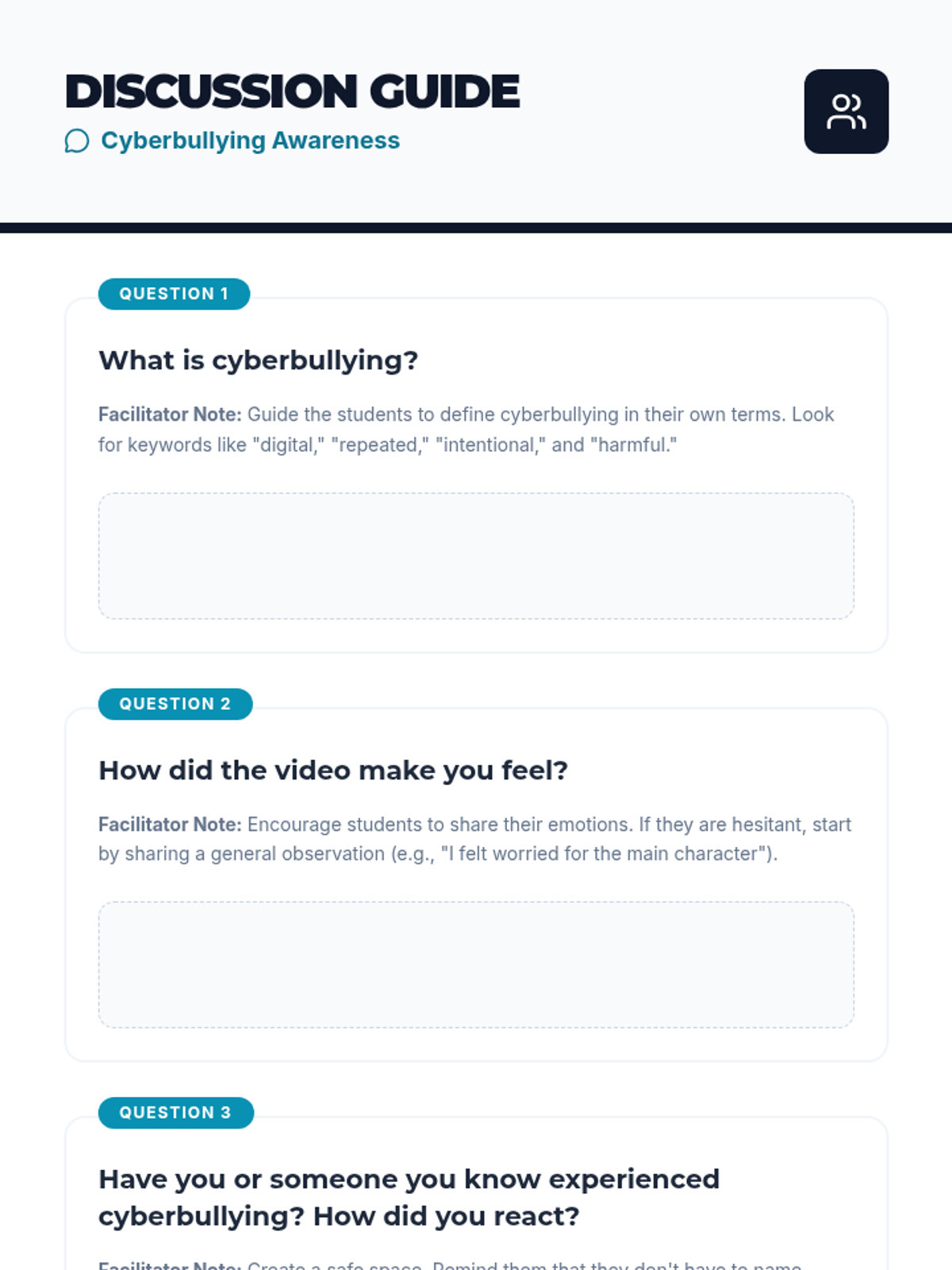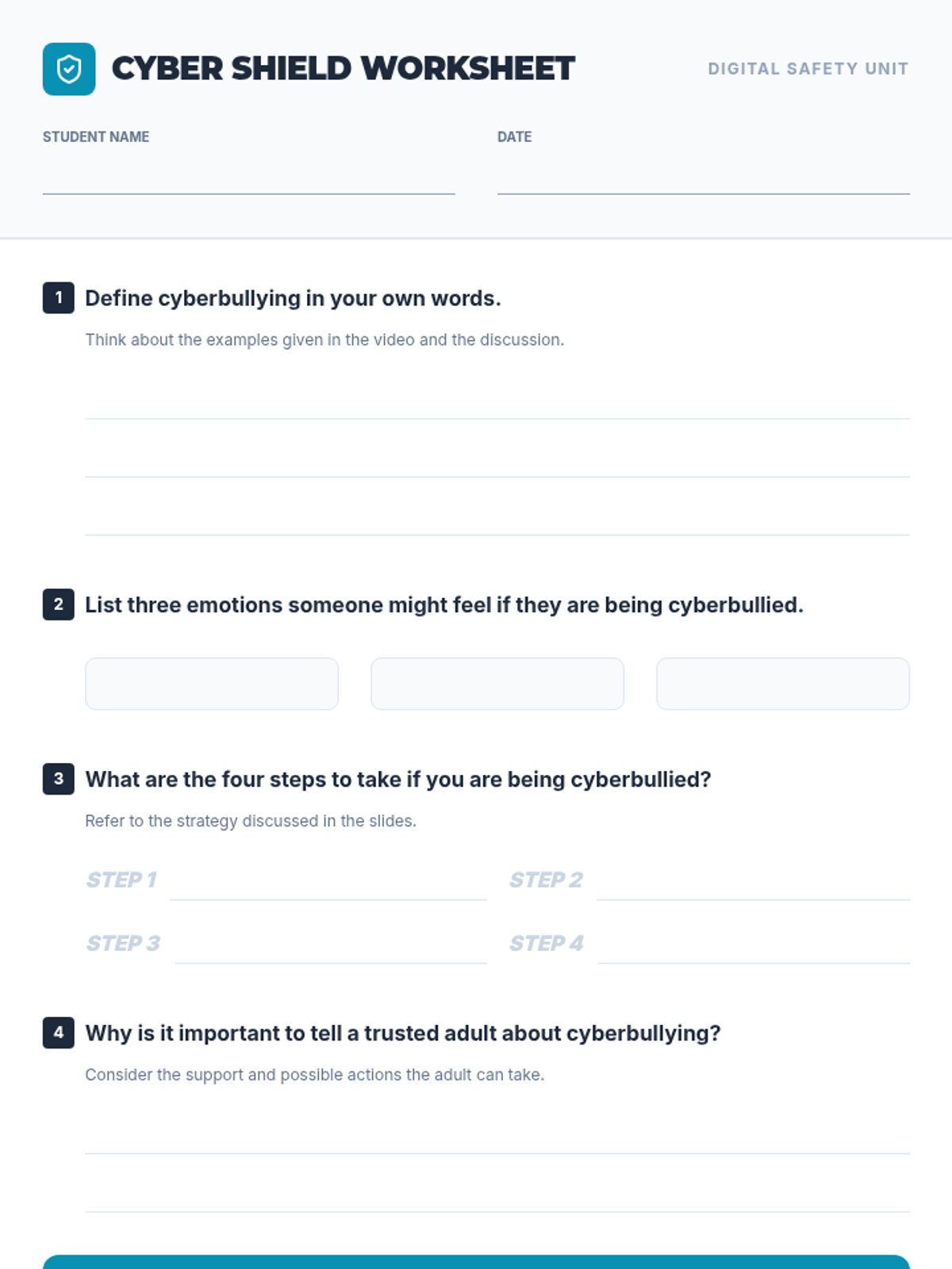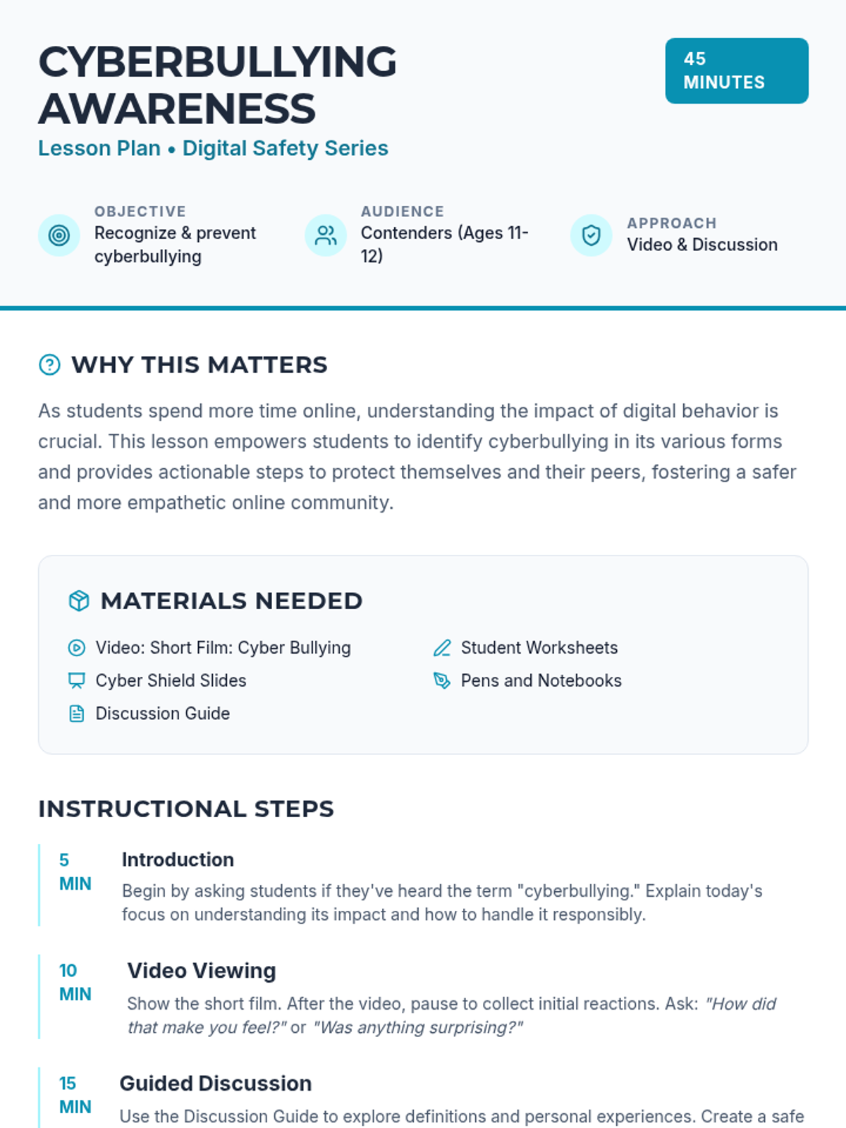 Students will learn to recognize, prevent, and report cyberbullying through a video-based discussion and interactive worksheet. The lesson emphasizes online safety and the importance of seeking help from trusted adults.