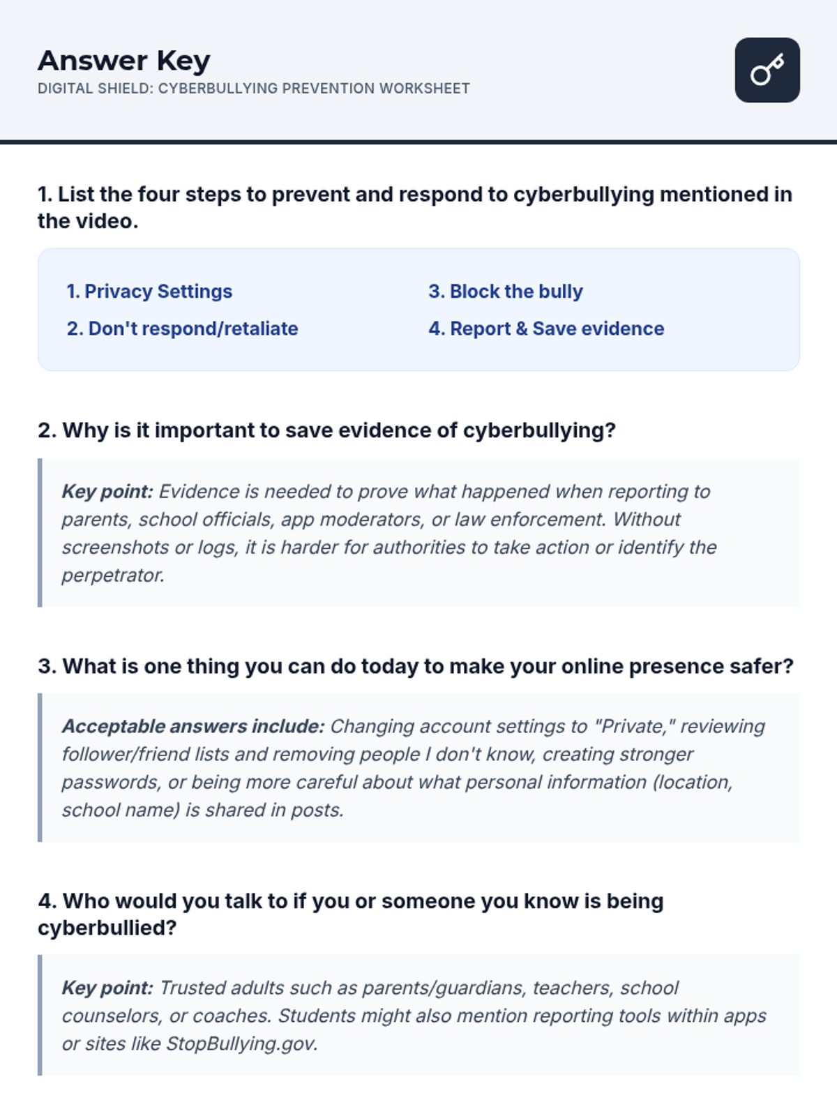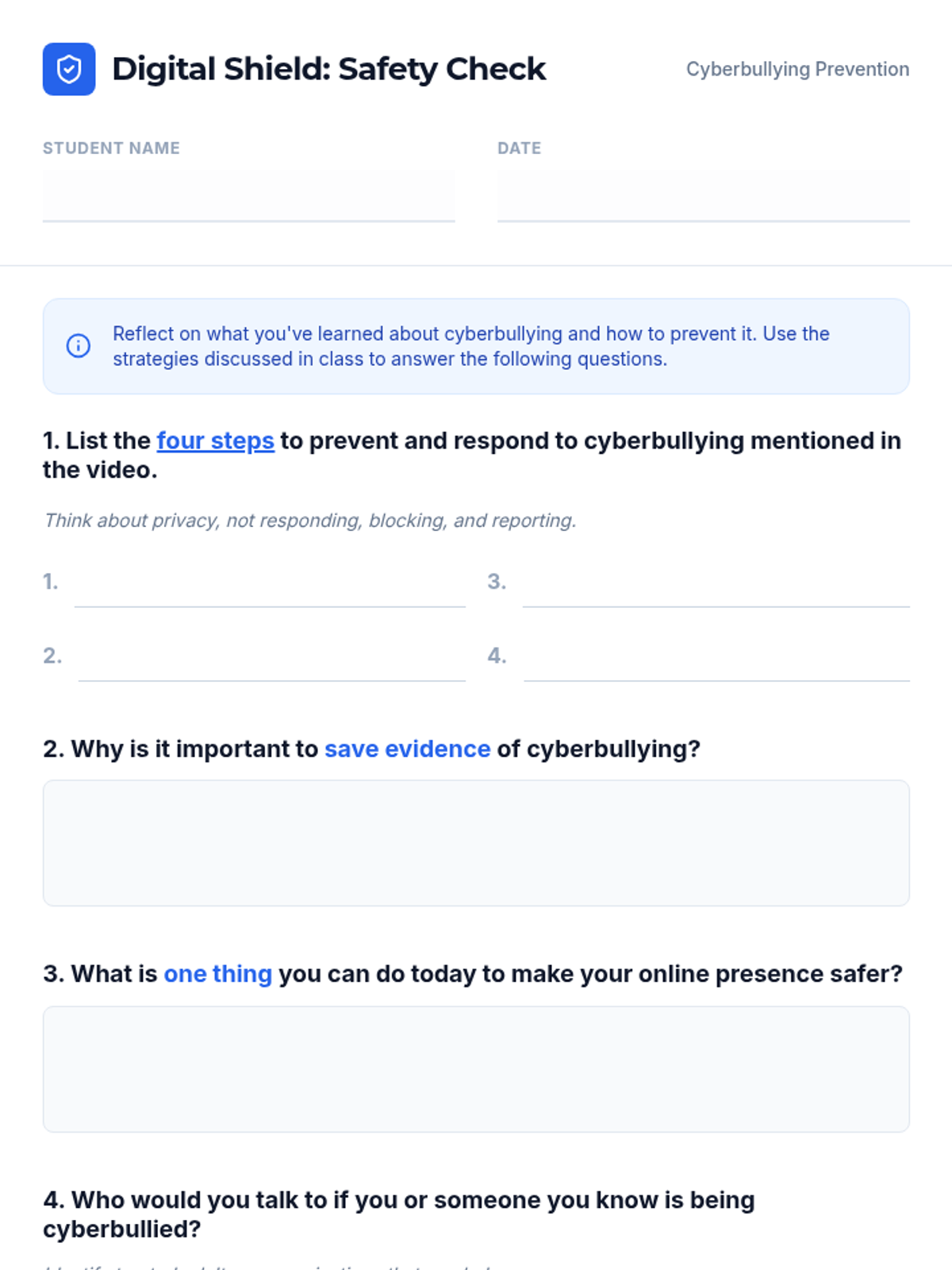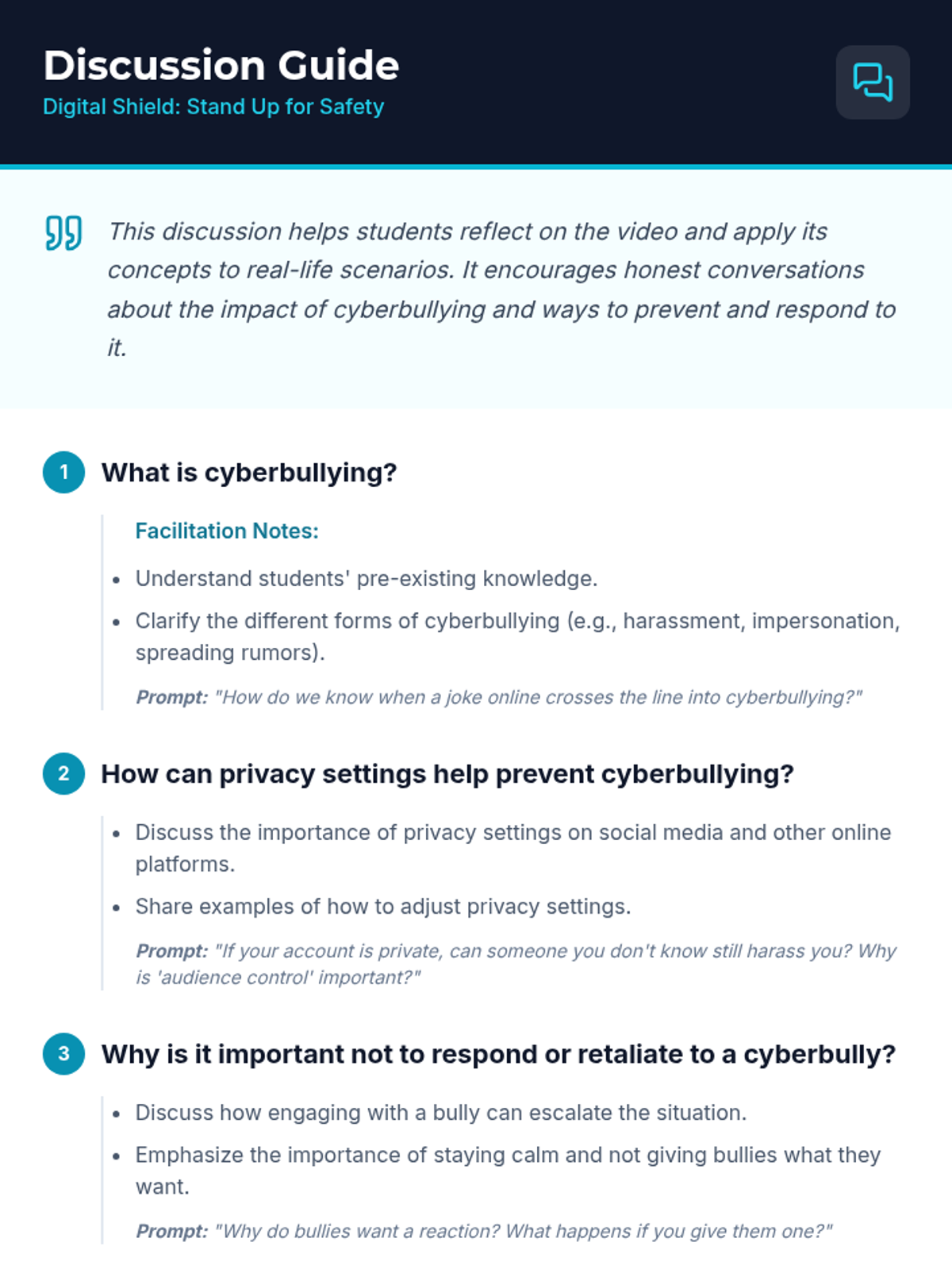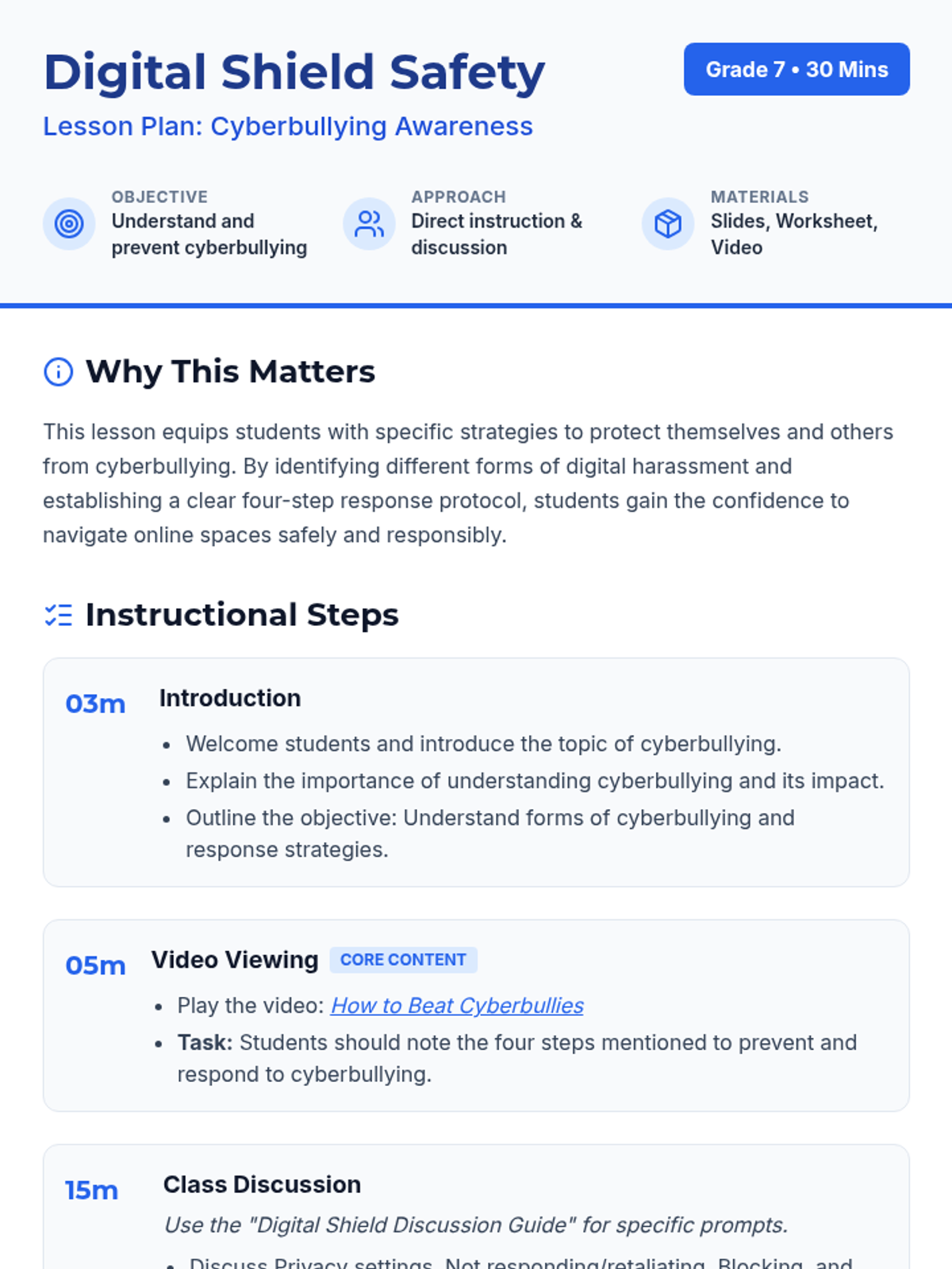A comprehensive 30-minute lesson for Grade 7 students on identifying, preventing, and responding to cyberbullying. Students learn a four-step response strategy and explore the impact of digital citizenship.