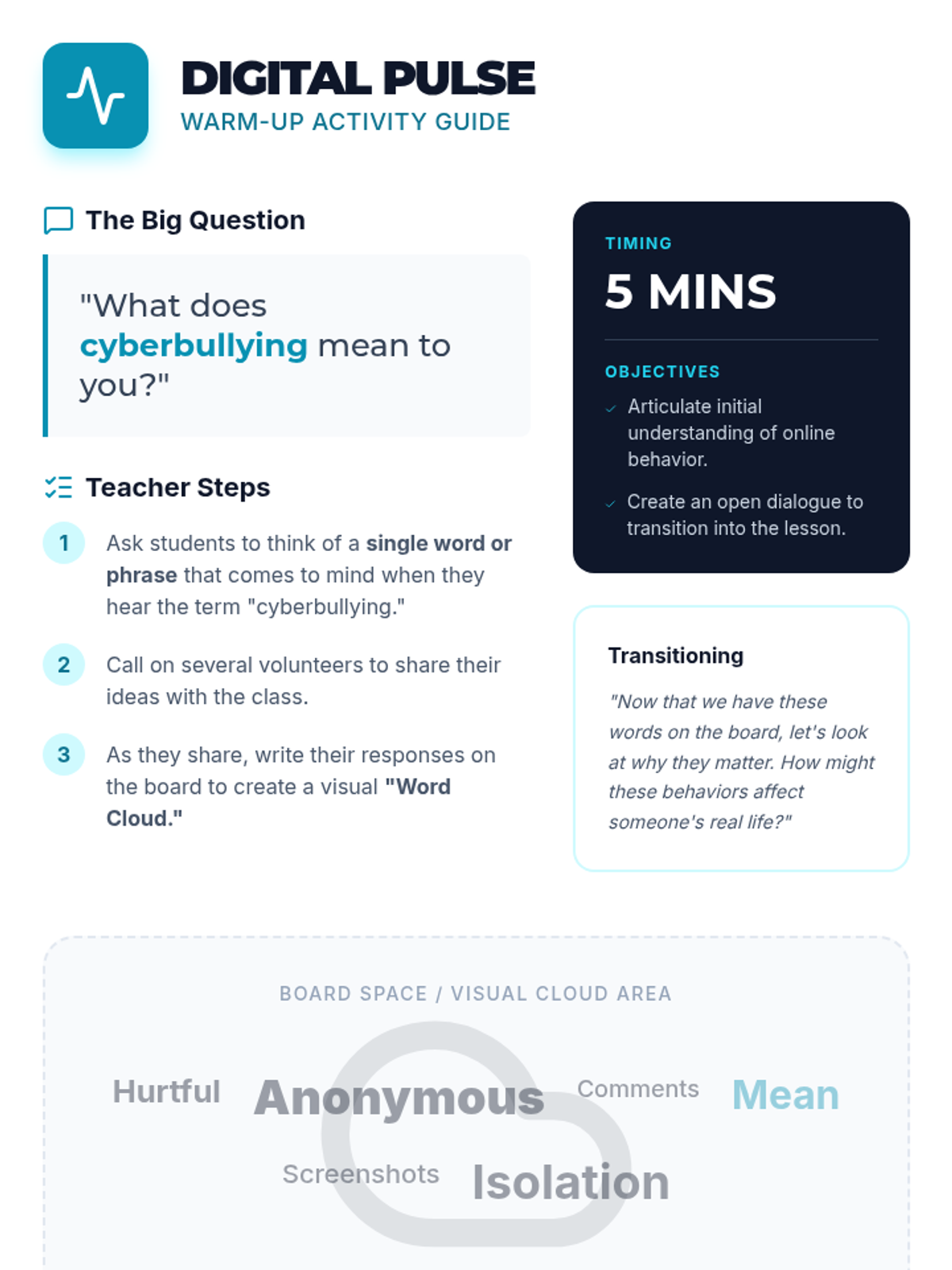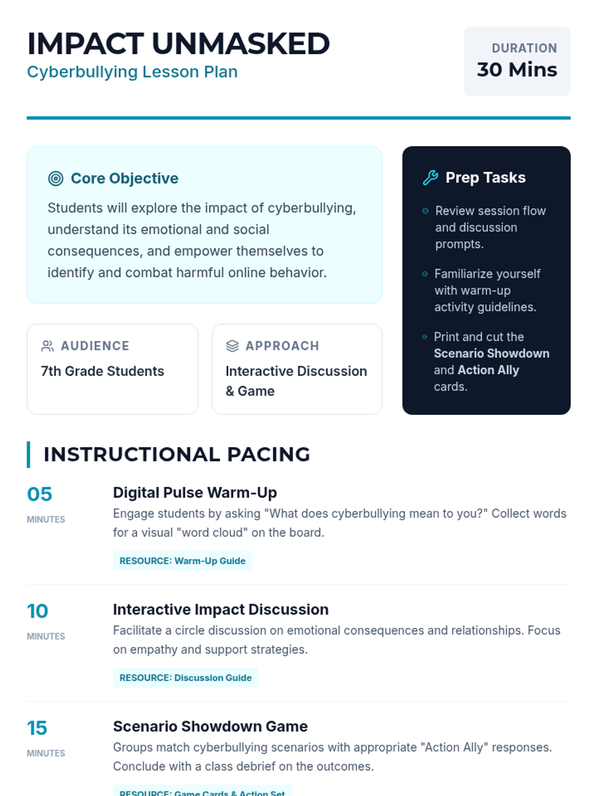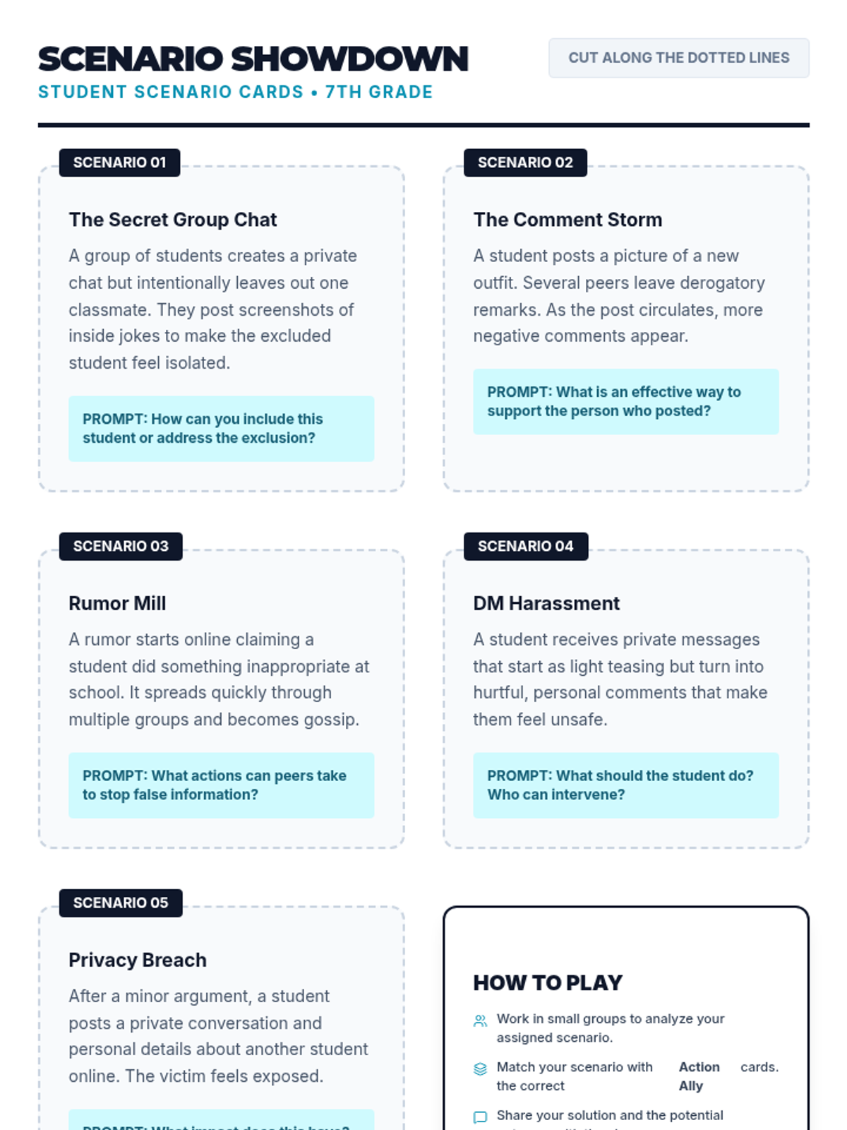 A 30-minute lesson for 7th graders to explore the emotional and social impacts of cyberbullying and develop strategies to combat it.