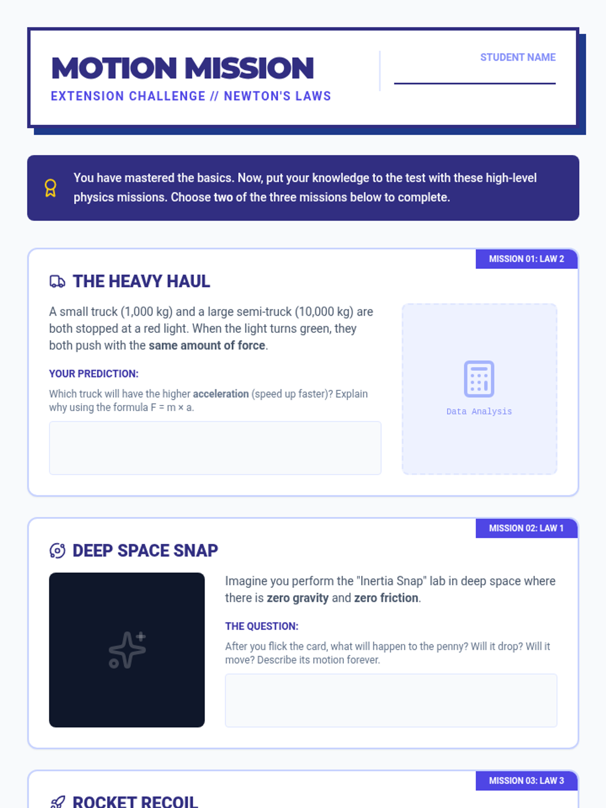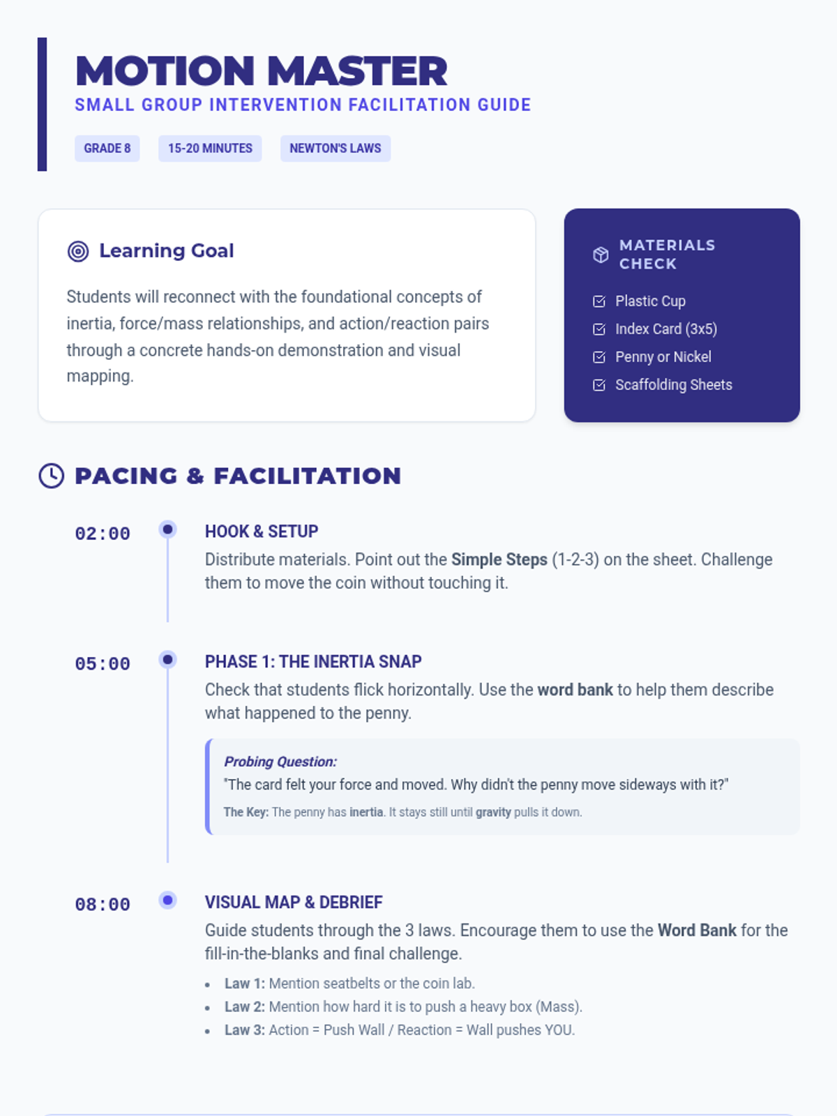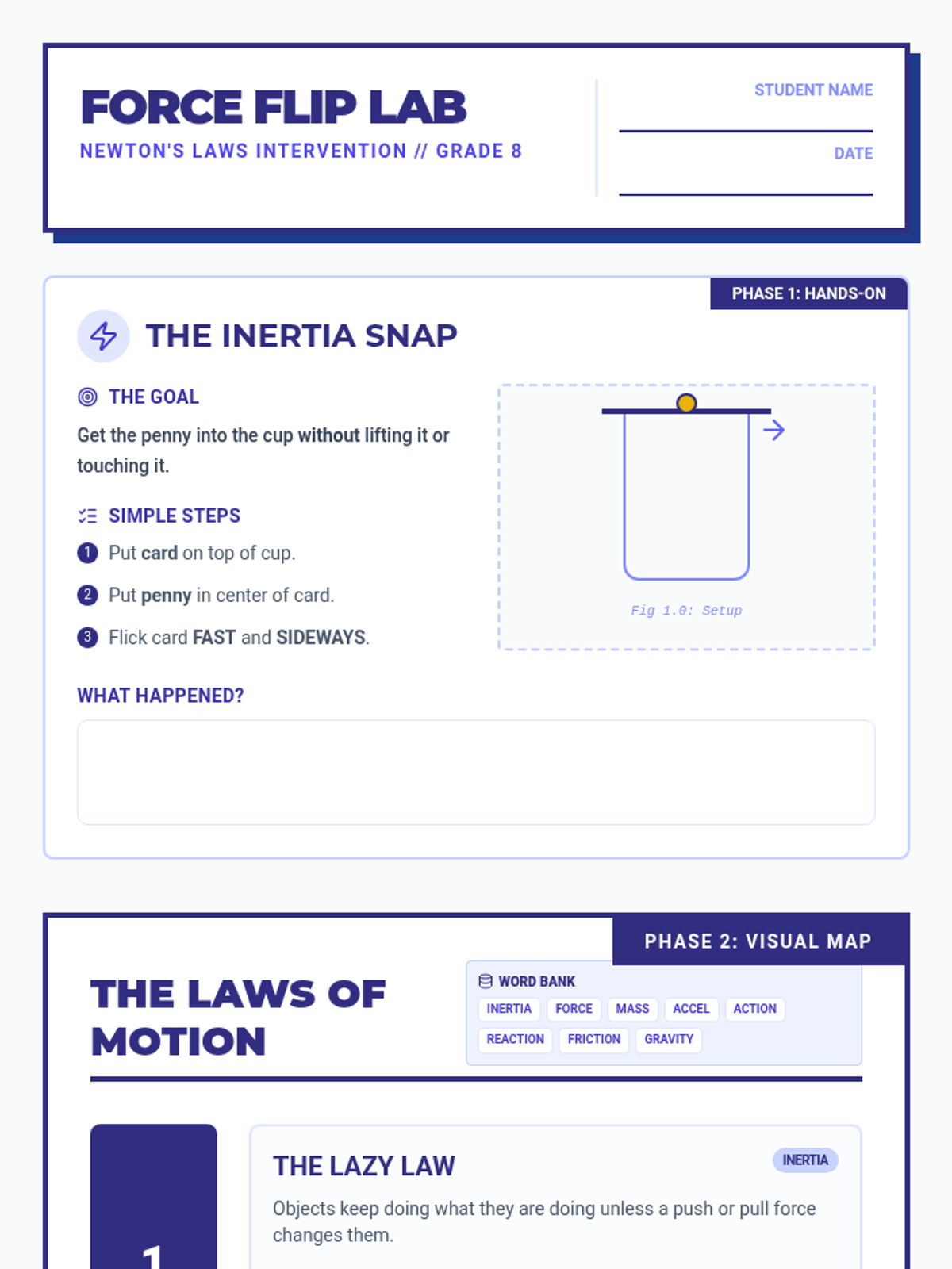 A rapid-fire intervention lesson designed to solidify the fundamentals of Newton's Laws through hands-on experimentation and visual mapping. Perfect for small group remediation or a quick refresher before transitioning to new physics concepts.