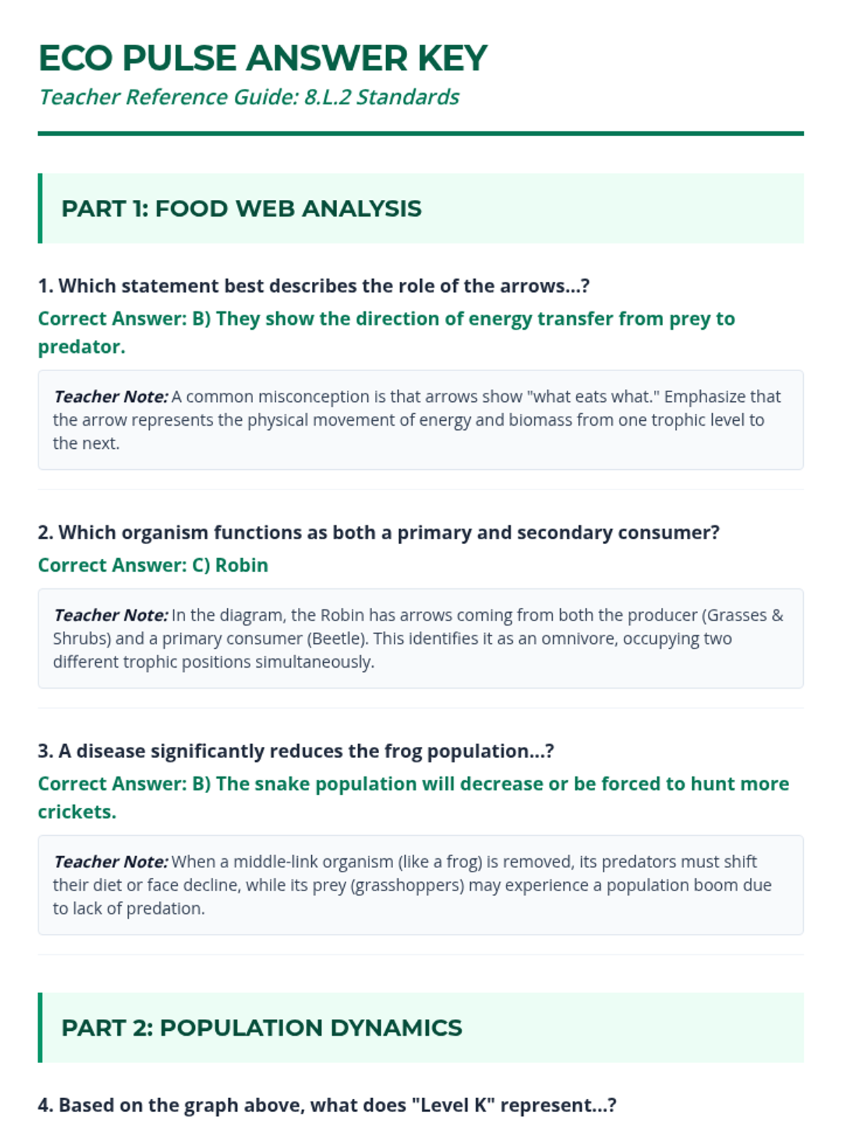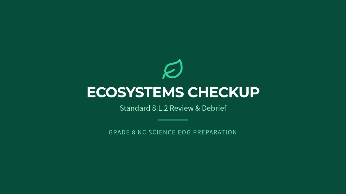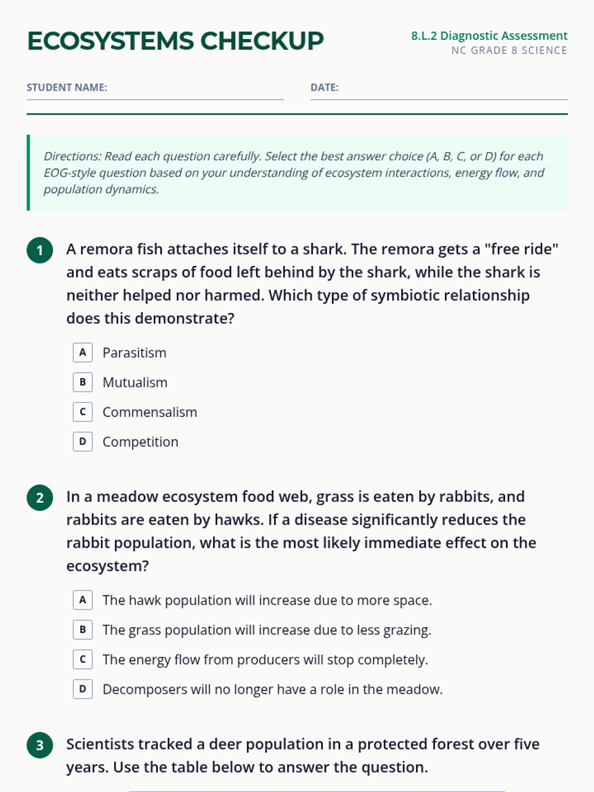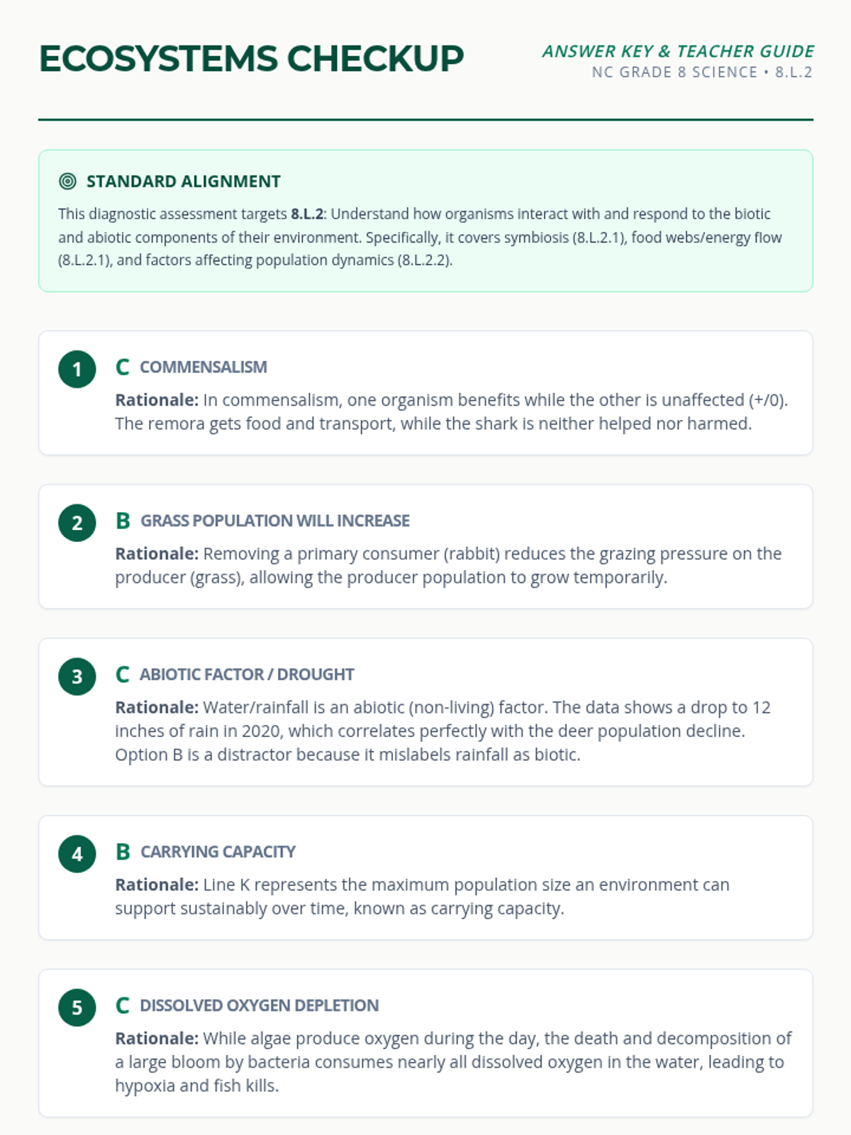 A mini-assessment focused on NC Grade 8 Science standard 8.L.2, covering ecosystem interactions, energy flow, and population dynamics. This lesson provides a diagnostic tool to evaluate student understanding of biotic and abiotic factors before the EOG.