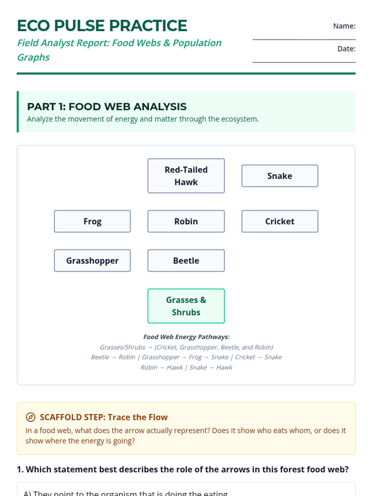 A guided practice set focused on interpreting food webs and population graphs, aligned with Grade 8 NC Science standards for ecosystems. Students analyze energy flow and predict the effects of environmental changes using EOG-style questions with integrated scaffolding.