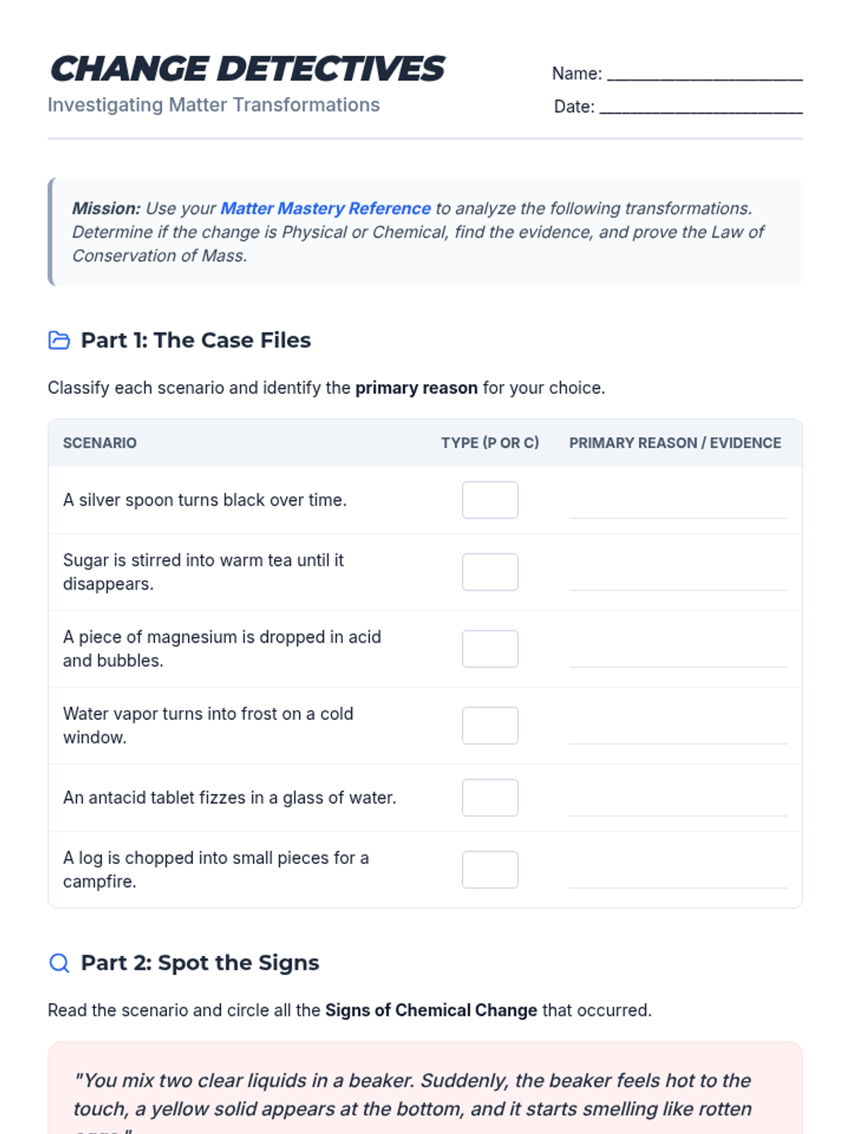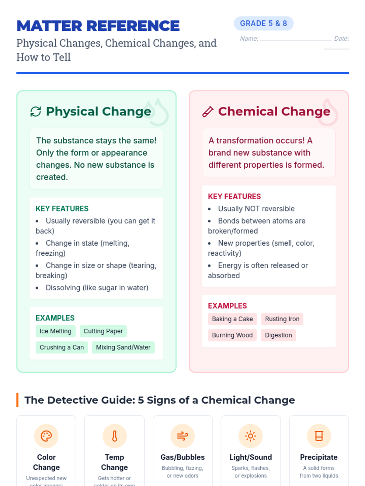 A comprehensive exploration of physical and chemical changes in matter, designed for Grade 5 and Grade 8 science standards. This lesson provides clear visual references for distinguishing between types of changes and understanding the conservation of mass.