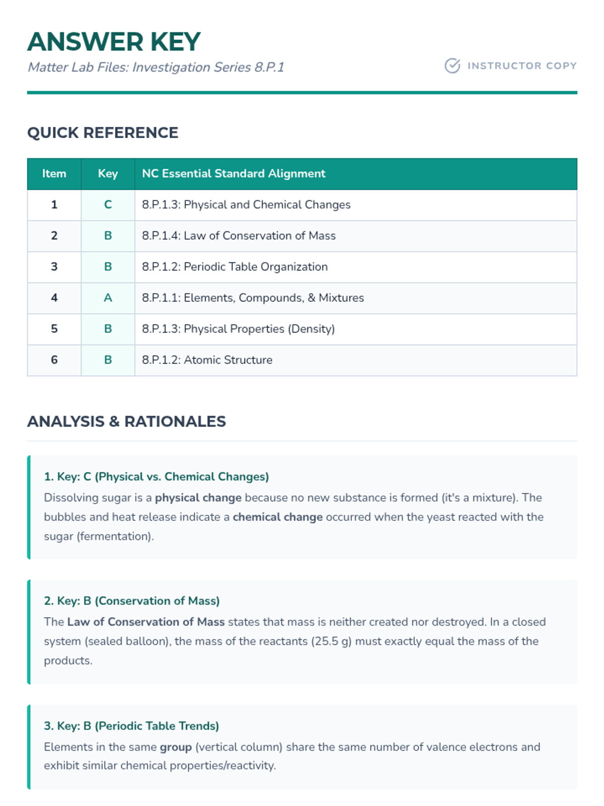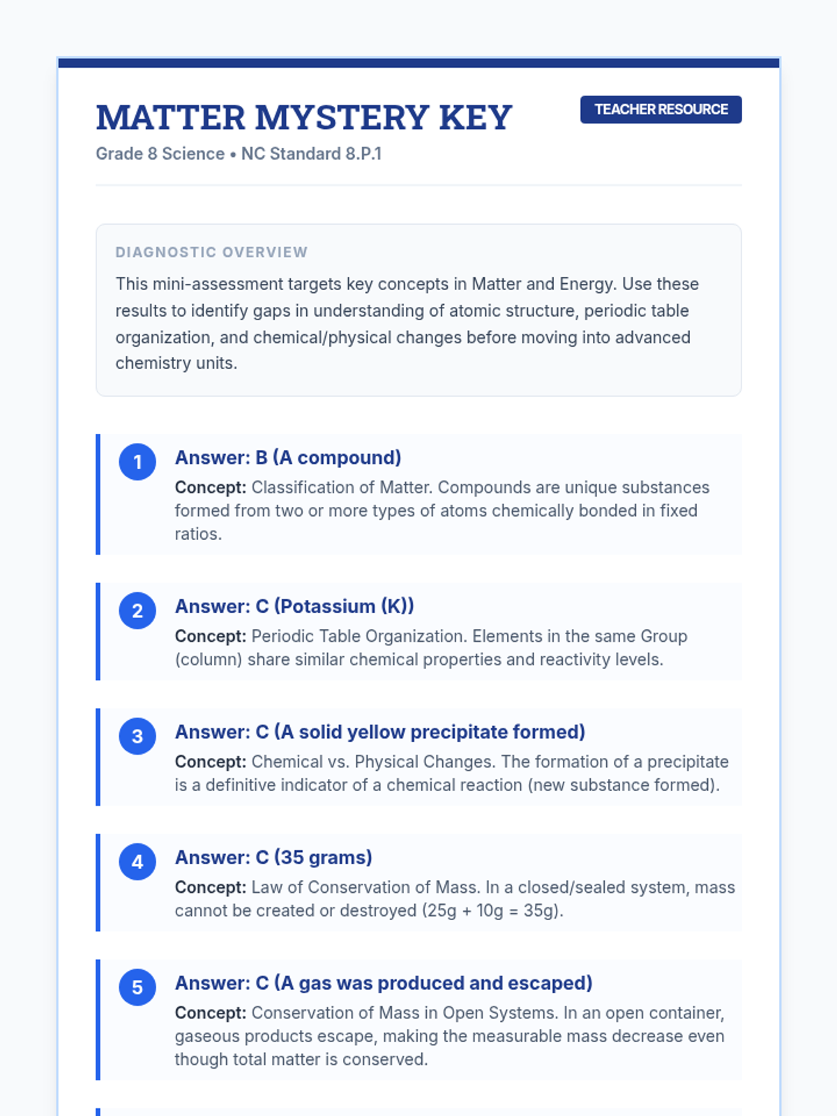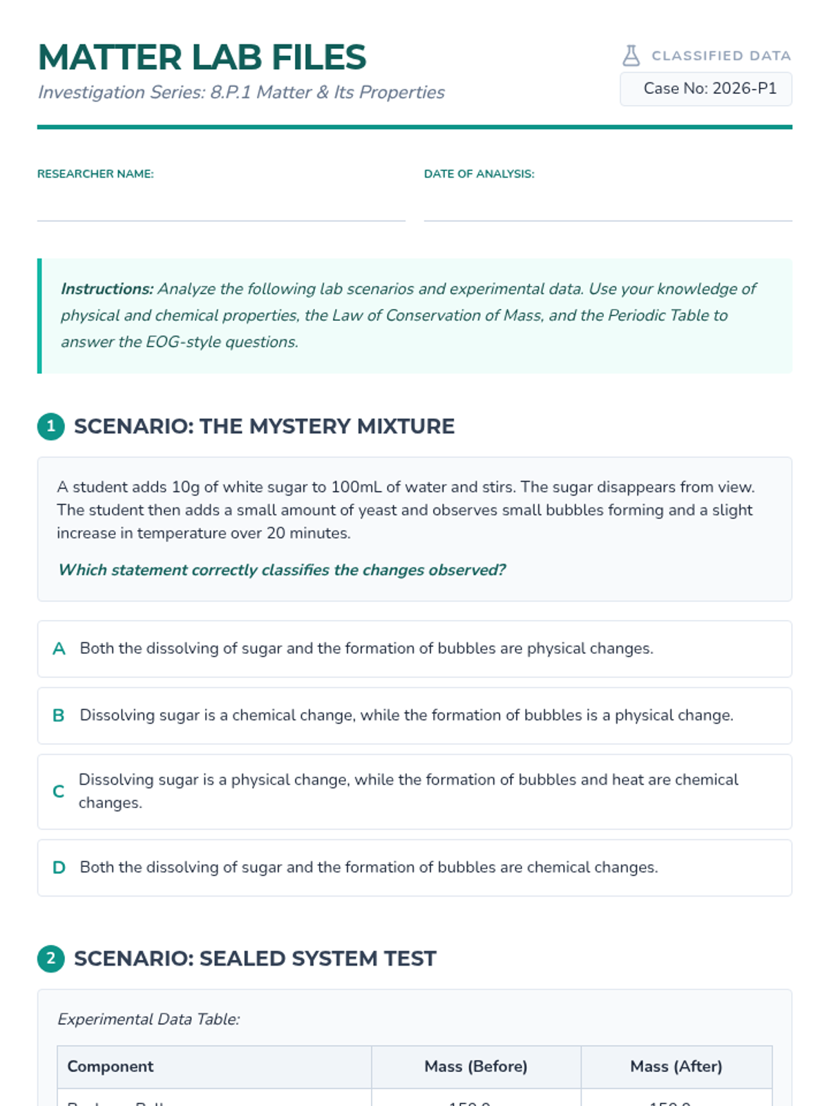 A comprehensive practice set focusing on Grade 8 North Carolina Science standards for matter (8.P.1). Students analyze lab scenarios involving physical and chemical changes, conservation of mass, and periodic table trends through EOG-style questions.