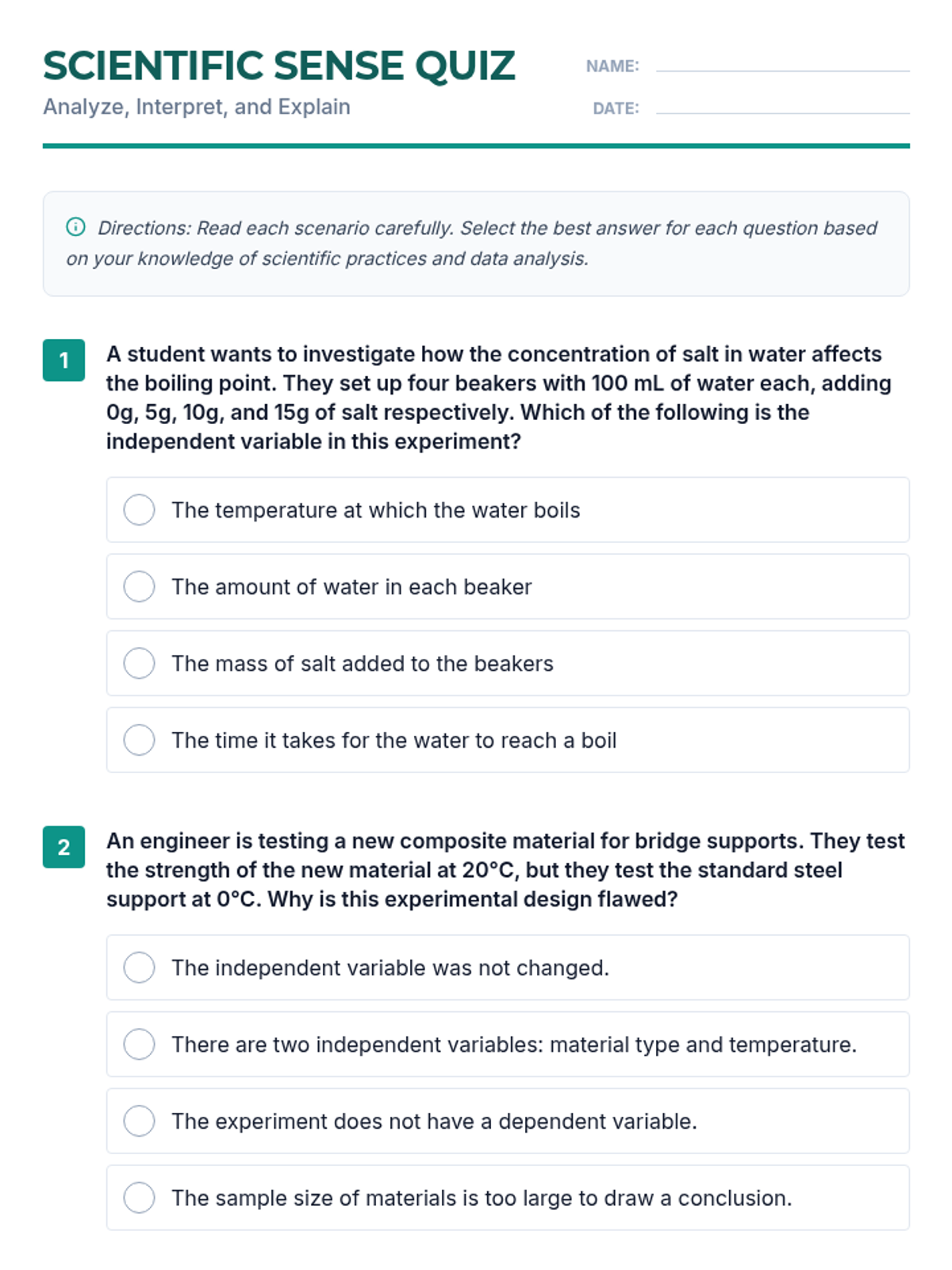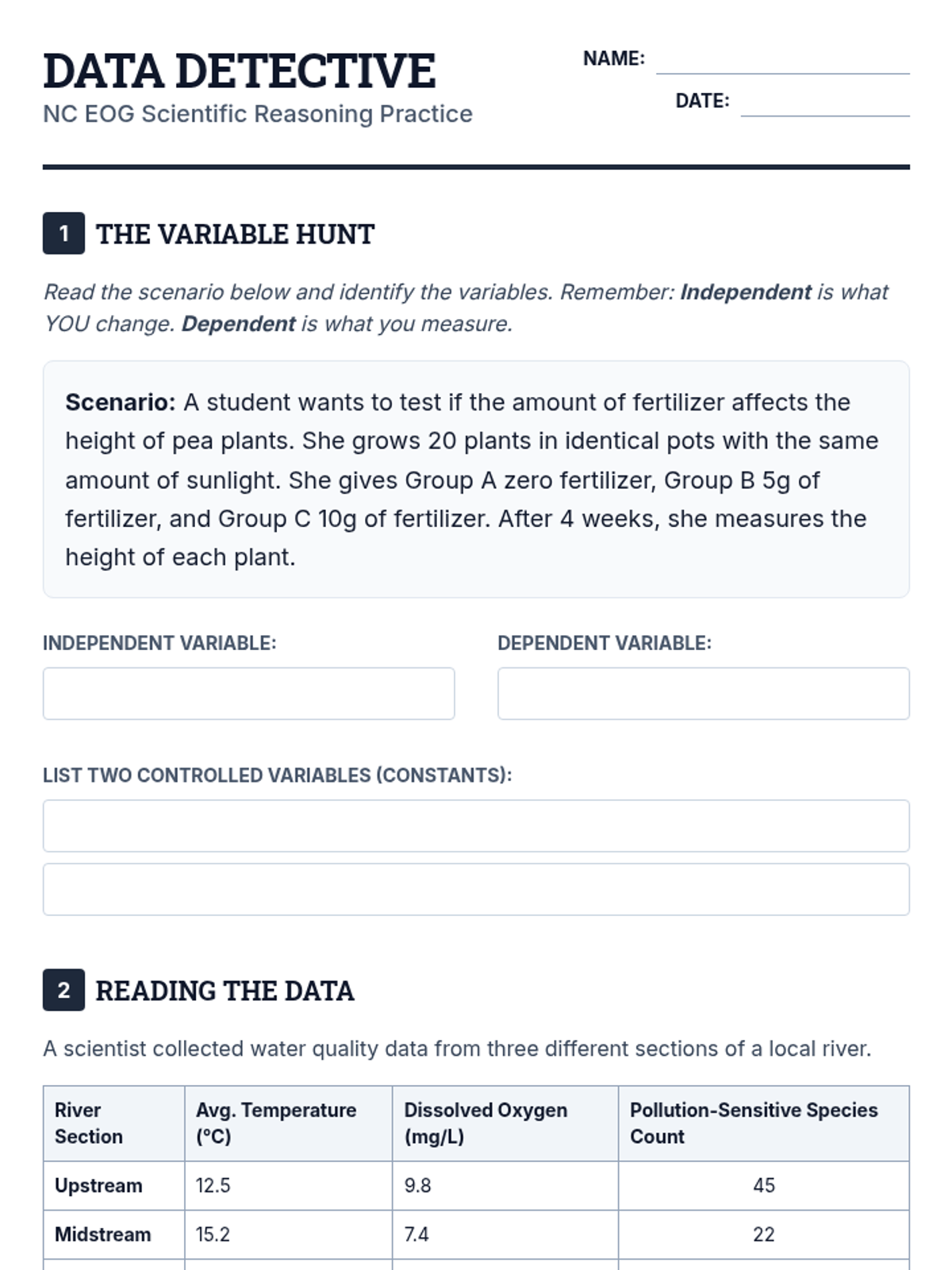 A focused practice session for 8th-grade students to master Science and Engineering Practices, specifically analyzing data, evaluating experimental designs, and constructing evidence-based explanations in the style of the NC EOG.