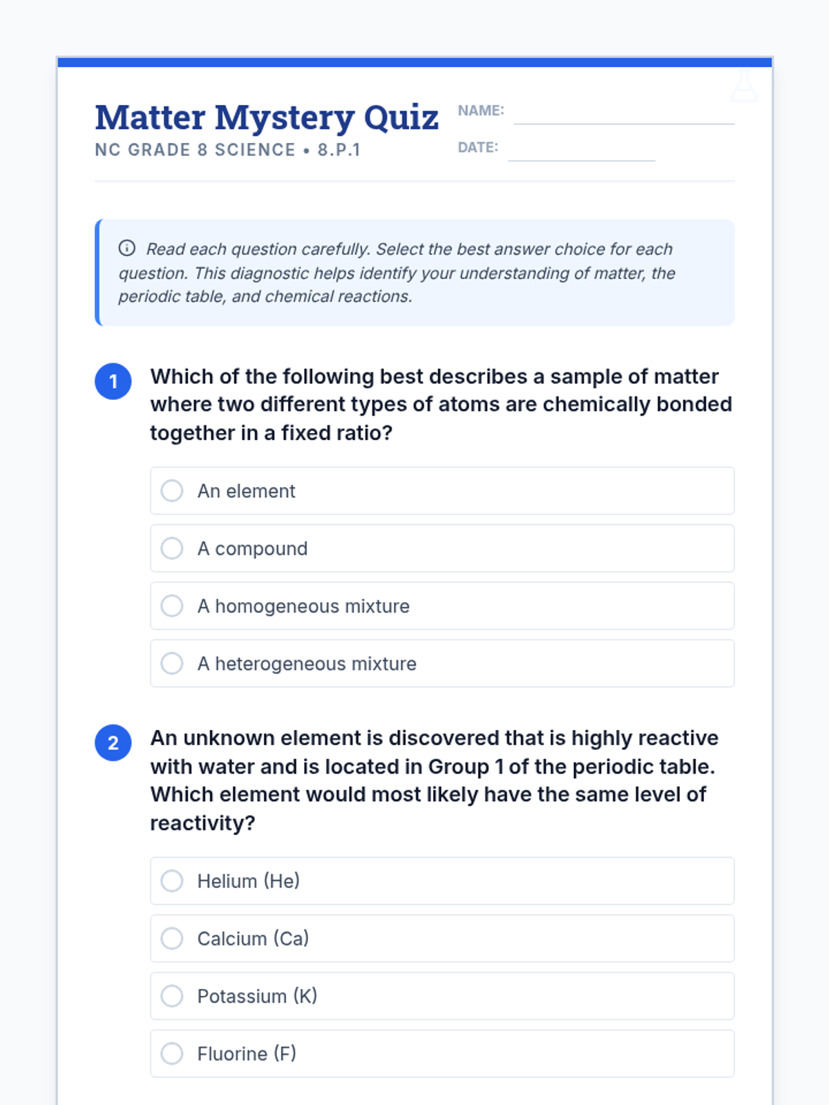 A diagnostic mini-assessment focusing on Grade 8 NC Science standard 8.P.1, covering atomic structure, periodic table trends, chemical reactions, and the law of conservation of mass.