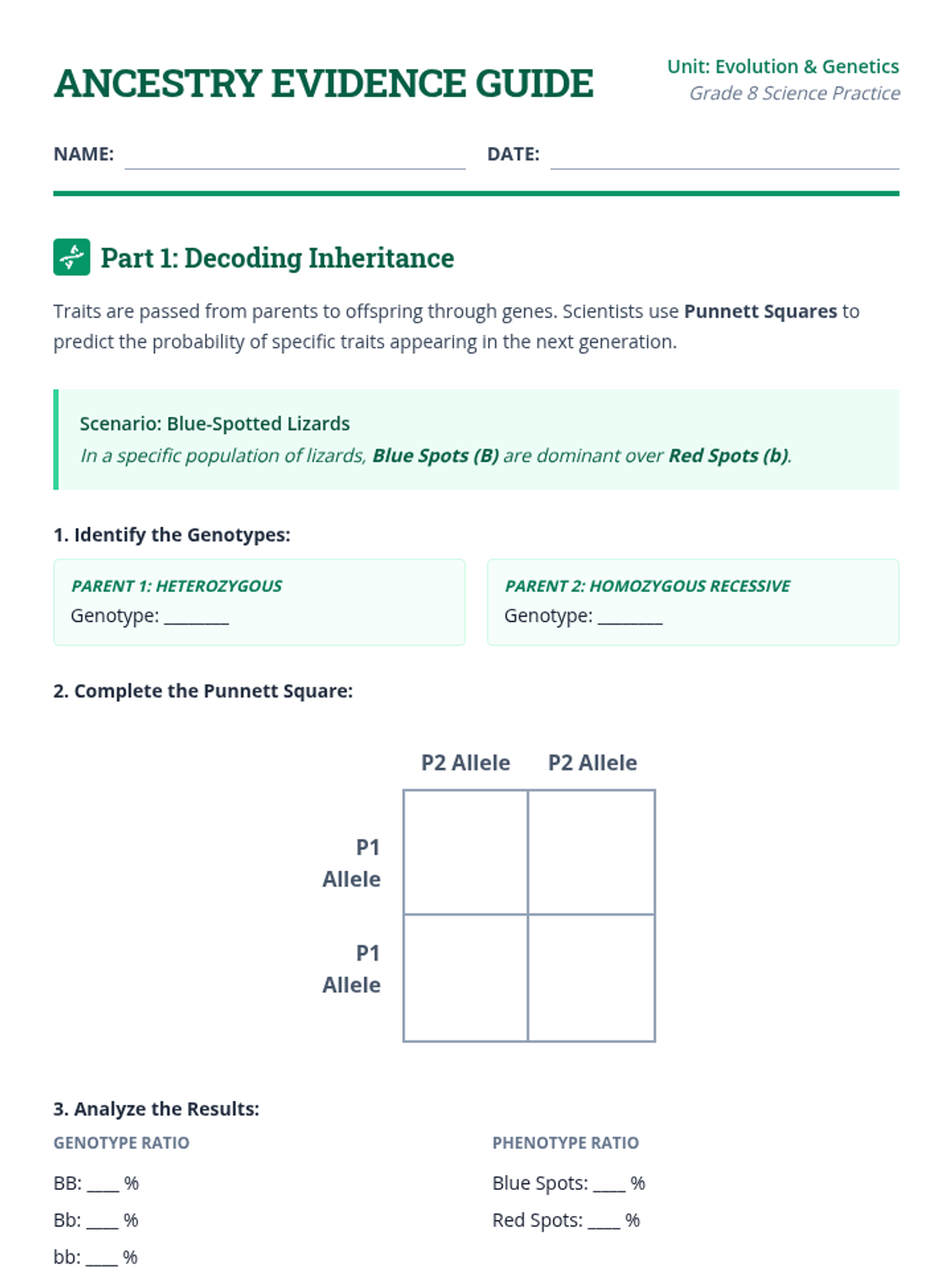 A comprehensive guided practice set focused on trait inheritance through Punnett squares and the various lines of evidence supporting the theory of evolution, designed for Grade 8 NC Science standards.