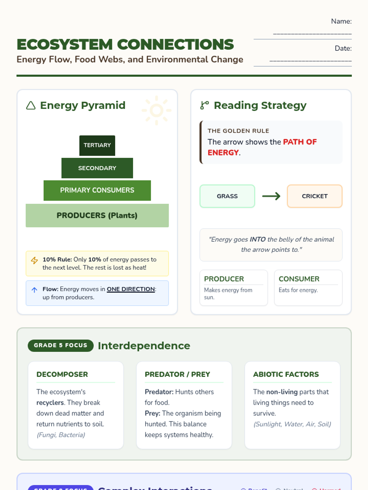 A comprehensive lesson covering ecosystem dynamics, energy flow, and environmental changes for upper elementary and middle school students.