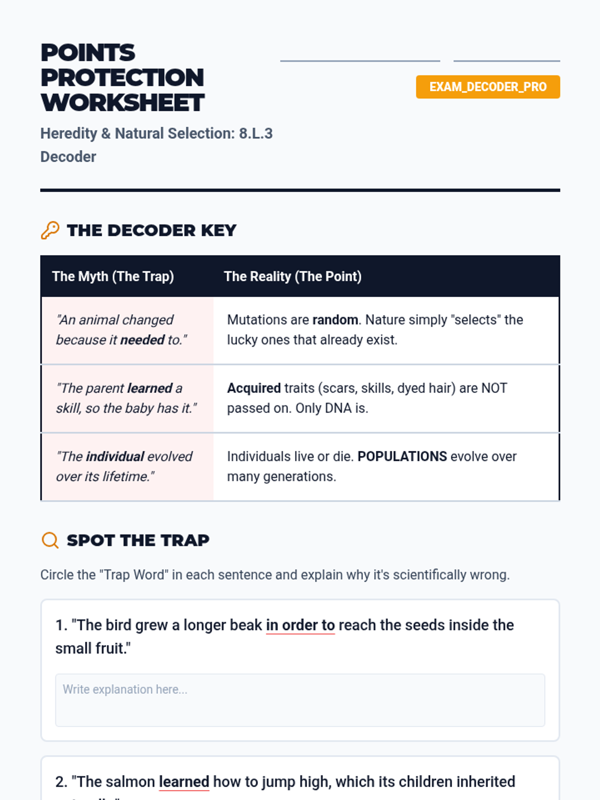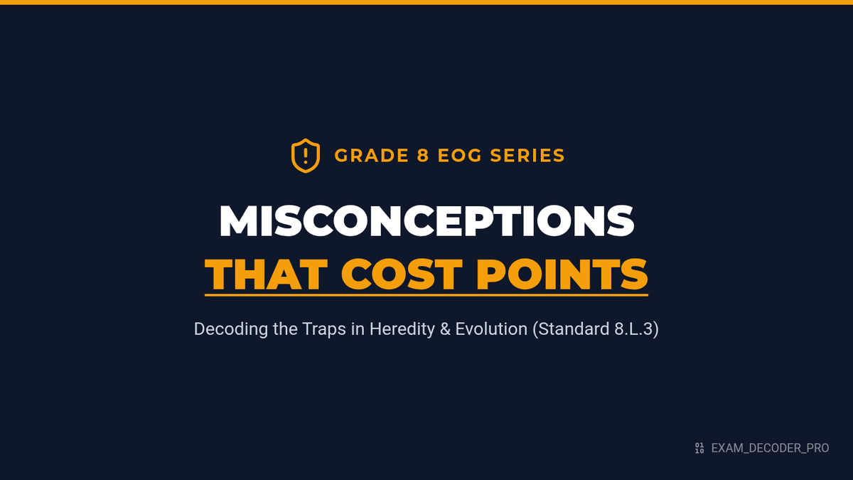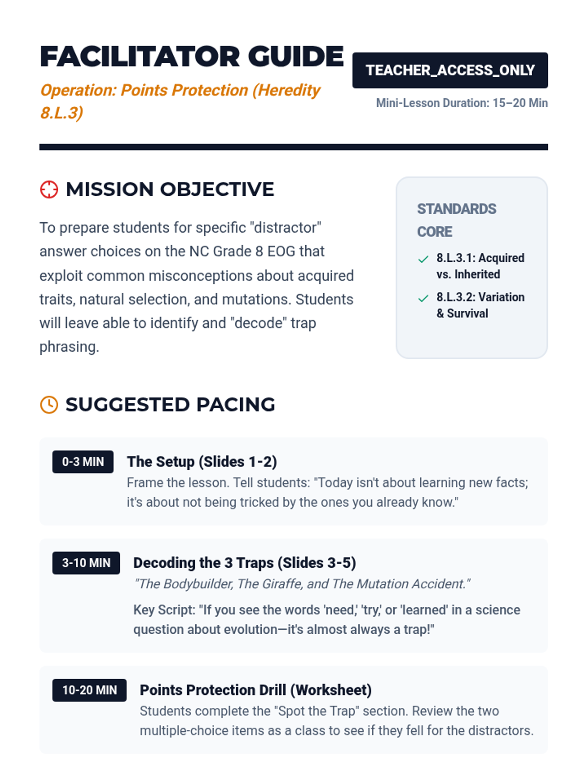 A targeted 15-20 minute mini-lesson designed to help Grade 8 students recognize and avoid common EOG misconceptions regarding heredity, acquired traits, and natural selection.