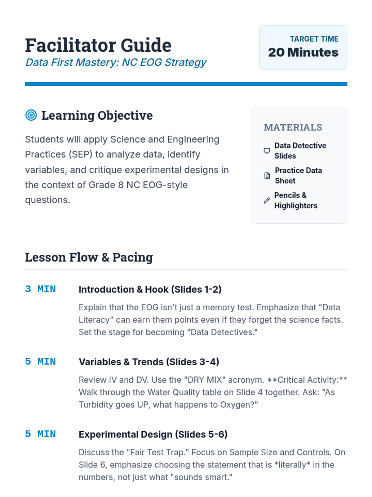 A 20-minute targeted mini-lesson designed to help 8th-grade students master the Science and Engineering Practices (SEP) tested on the NC EOG, focusing on data interpretation and experimental design over rote memorization.