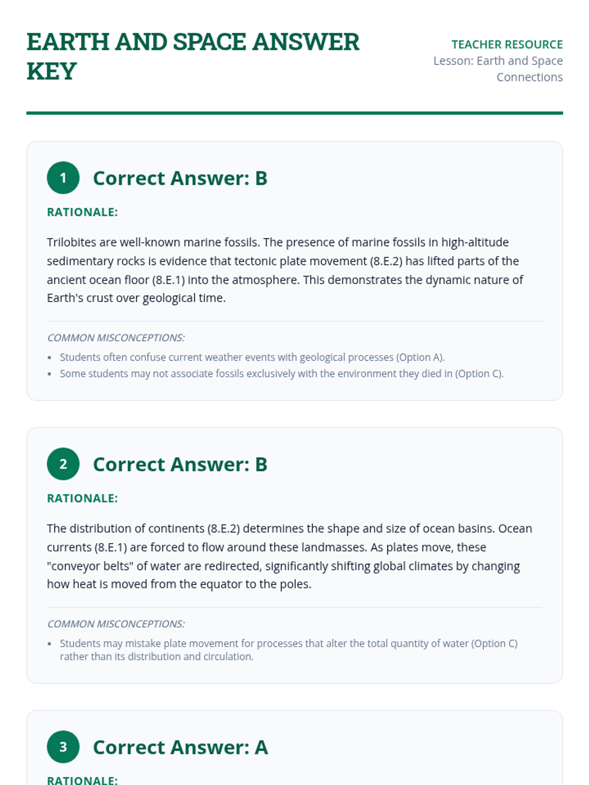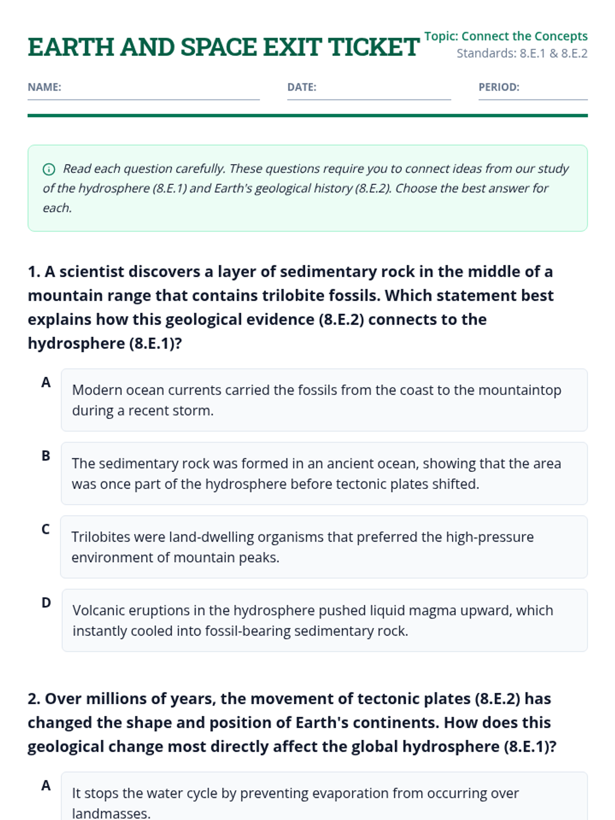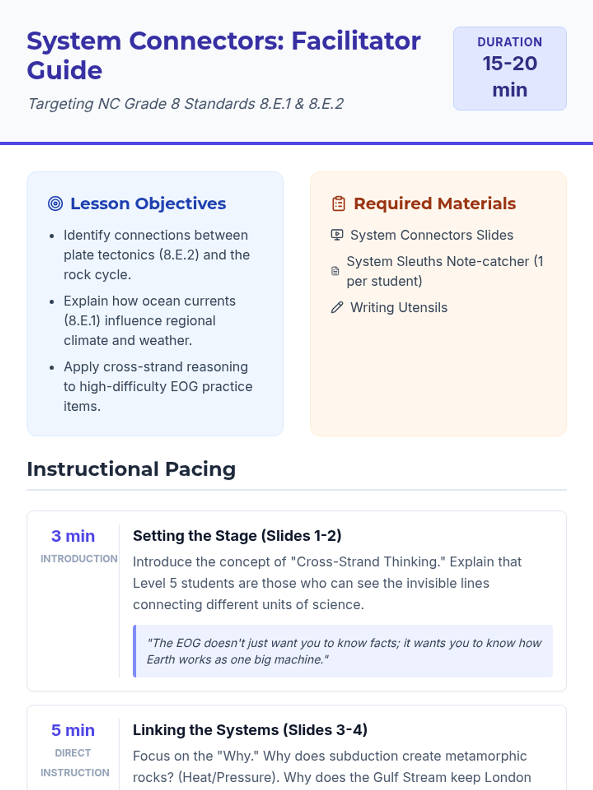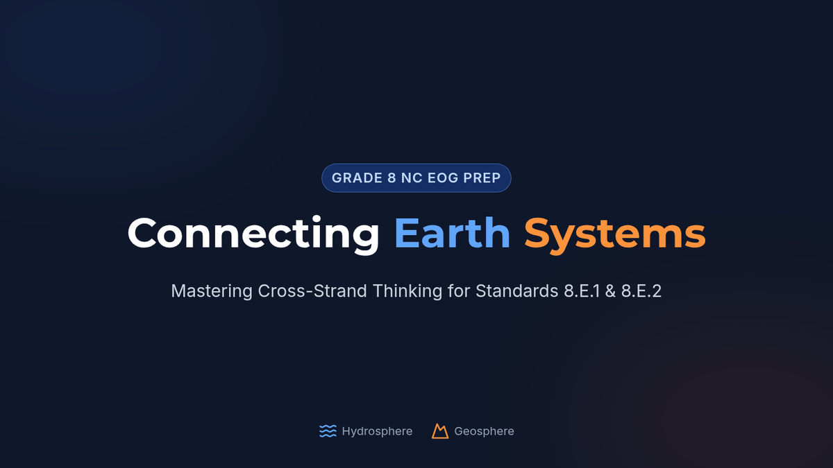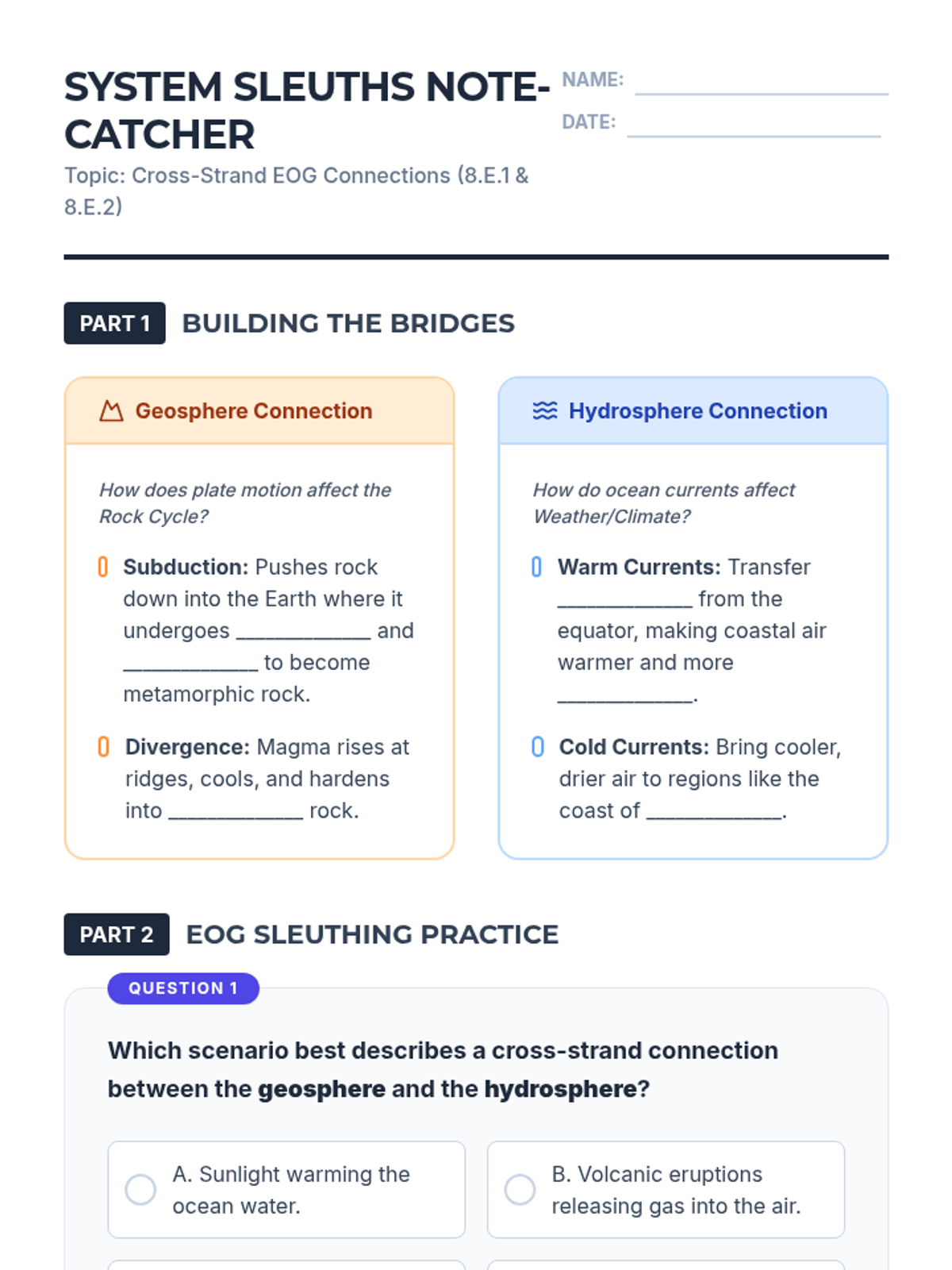 A targeted 15-20 minute mini-lesson for Grade 8 science focusing on cross-strand EOG questions that link the hydrosphere (8.E.1) and Earth's history (8.E.2). Students learn to identify how plate tectonics, the rock cycle, and ocean currents interact to shape the planet and climate.