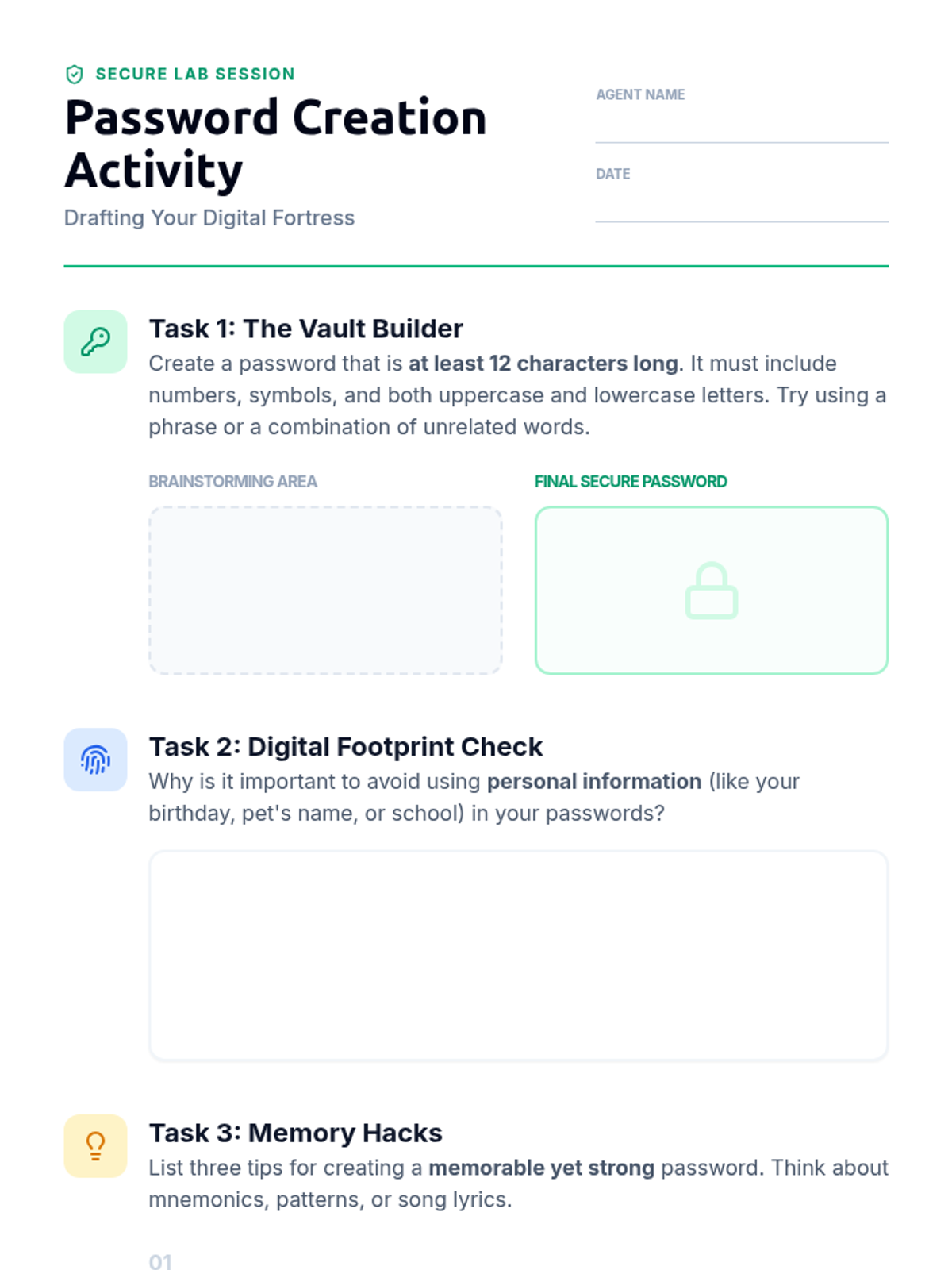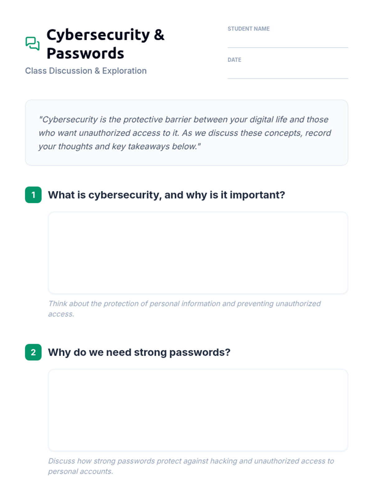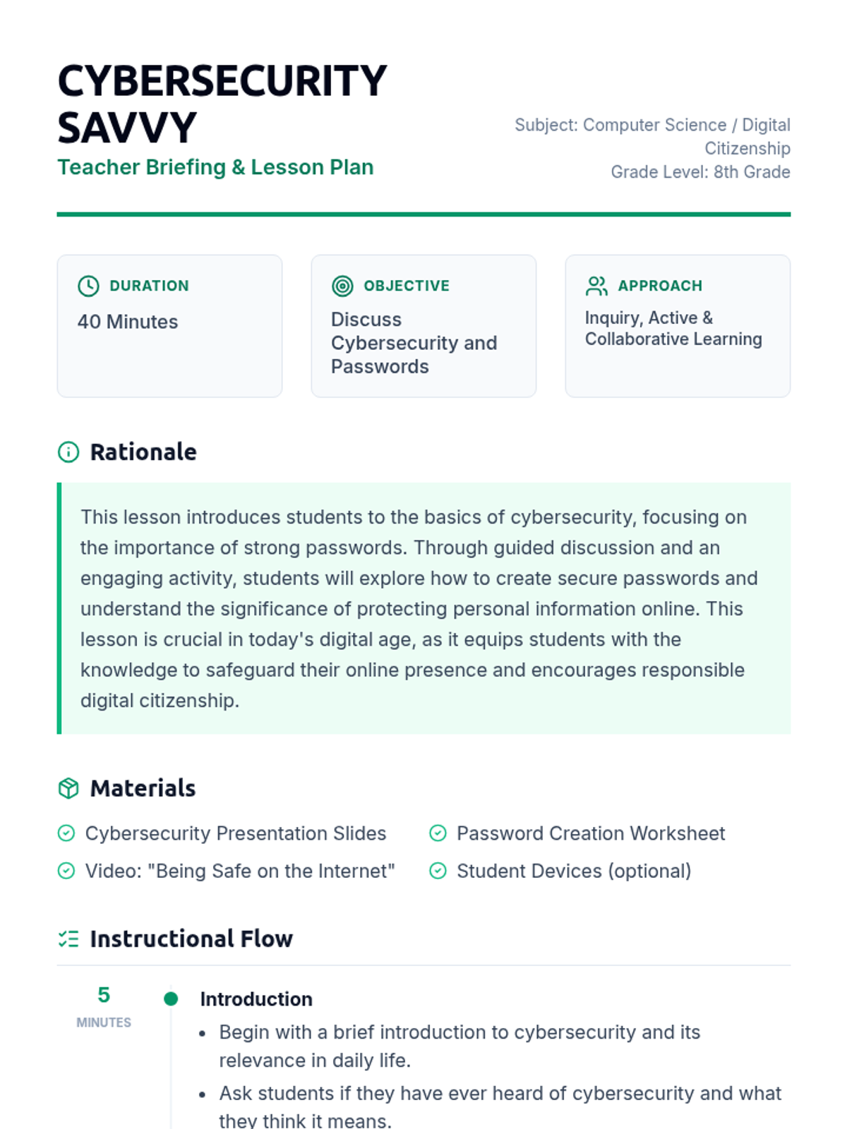 An introductory lesson on cybersecurity for 8th graders, focusing on password strength and personal data protection through discussion and a hands-on creation activity.